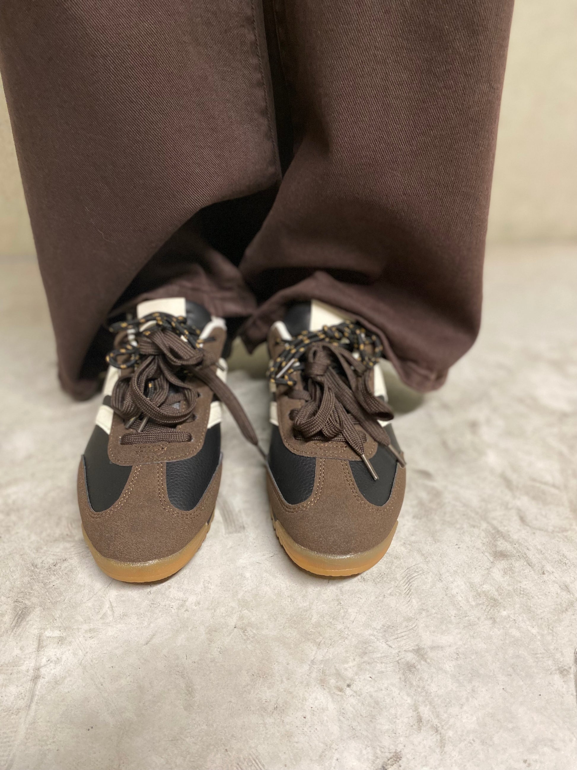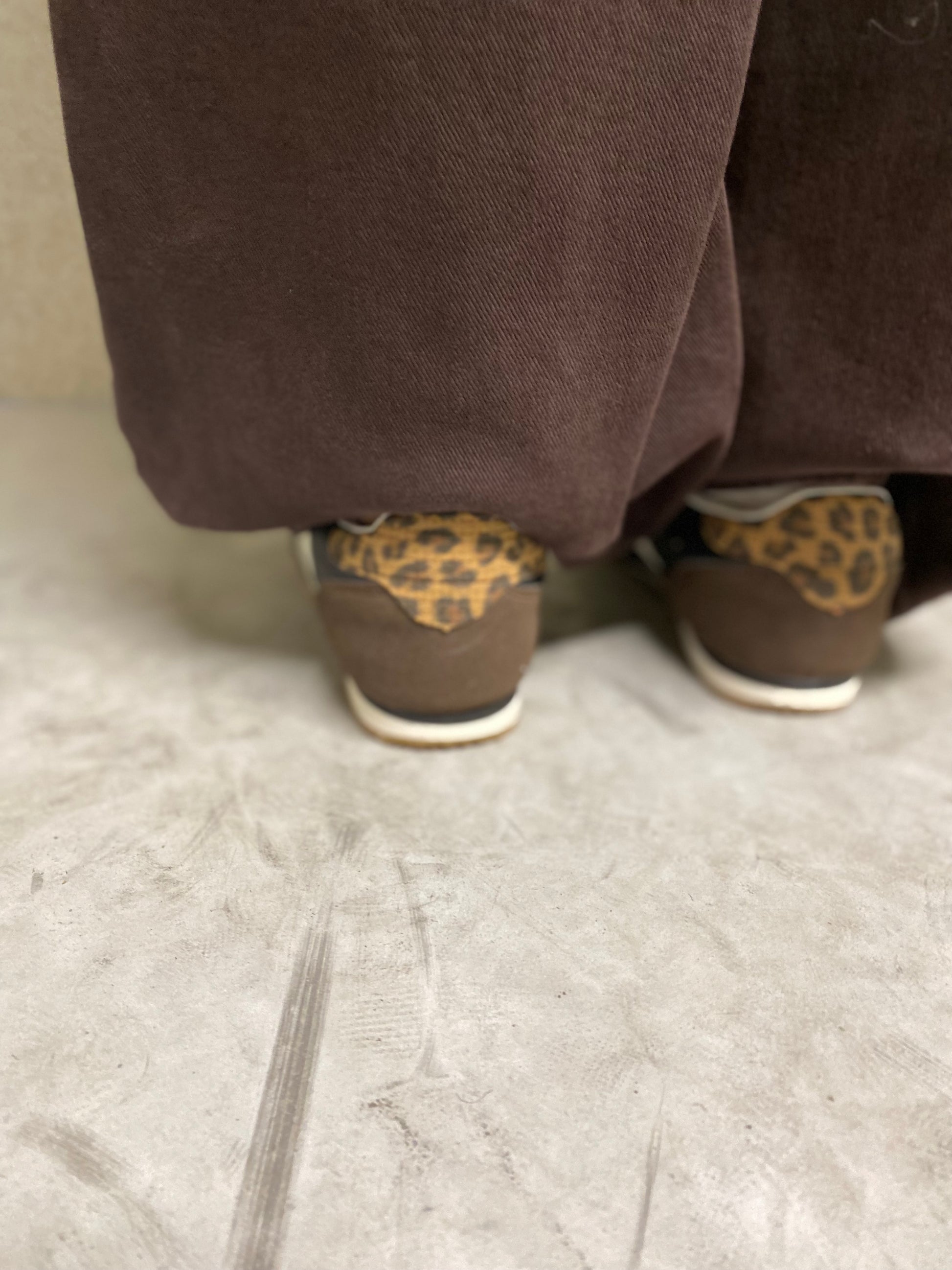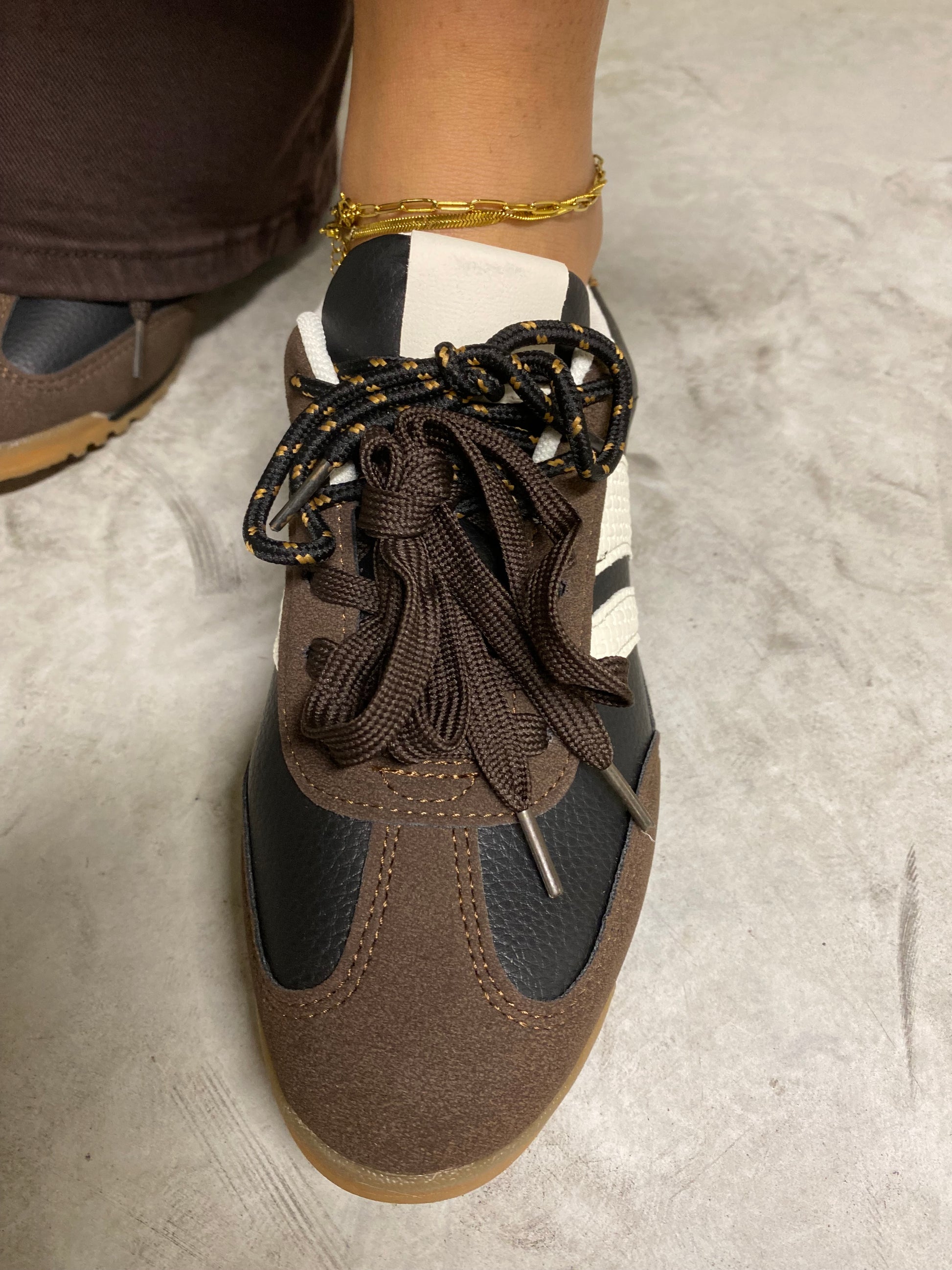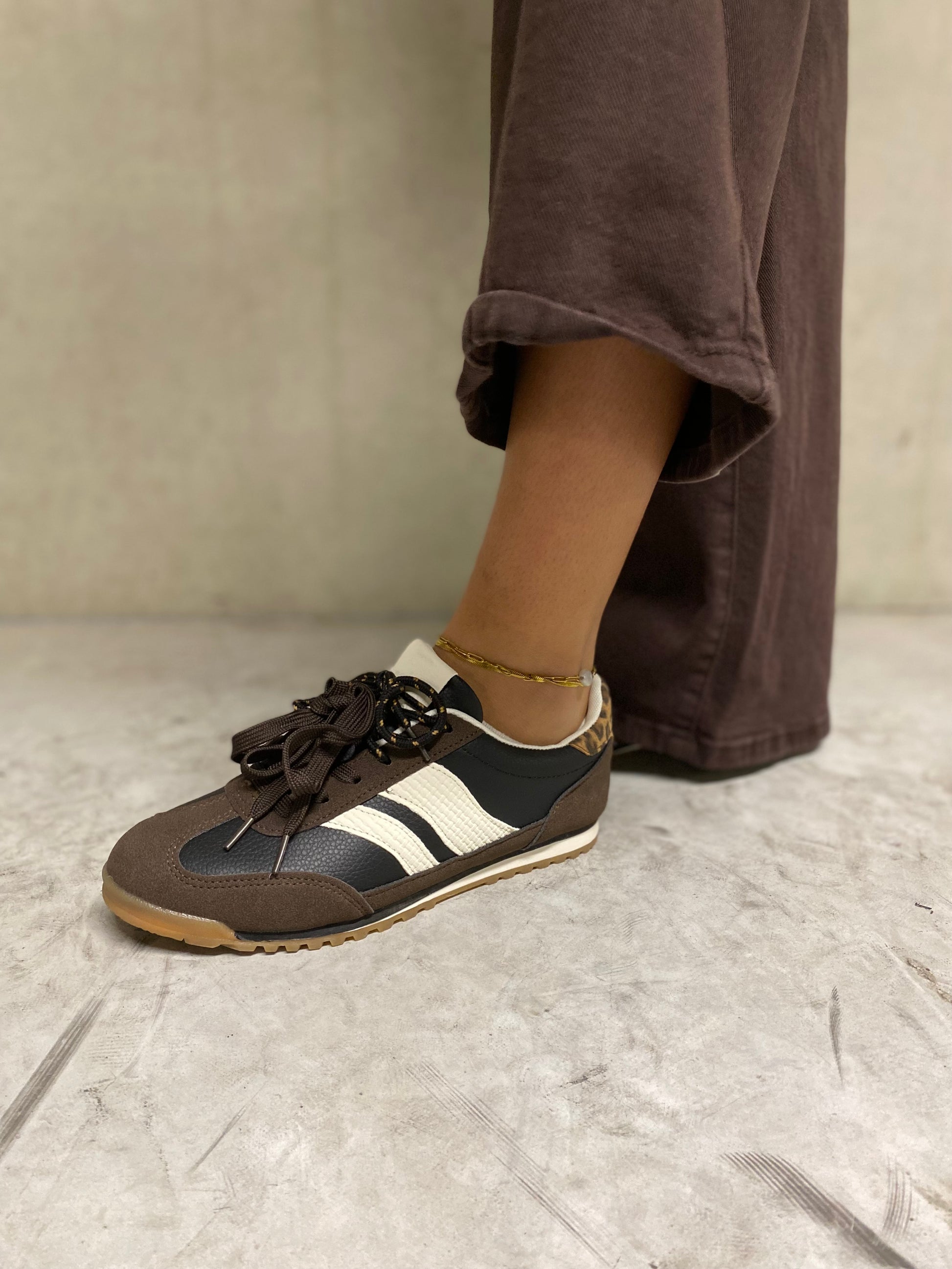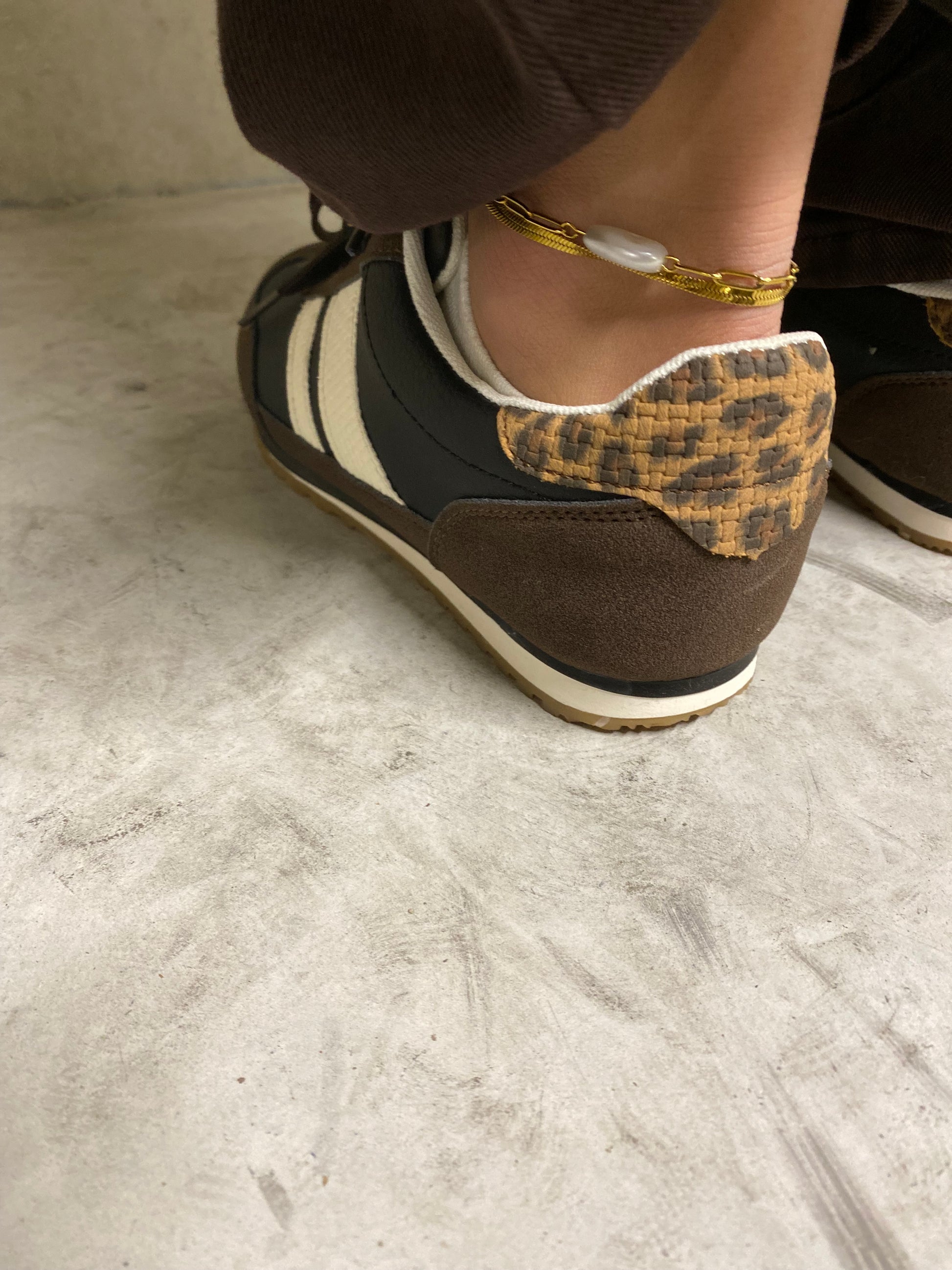 Petites baskets plates noires, avec des détails bruns en matière suédé, deux bandes blanches sur le côté et l'arrière, un petit motif léopard