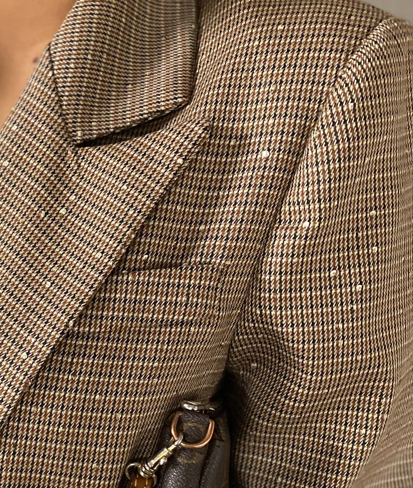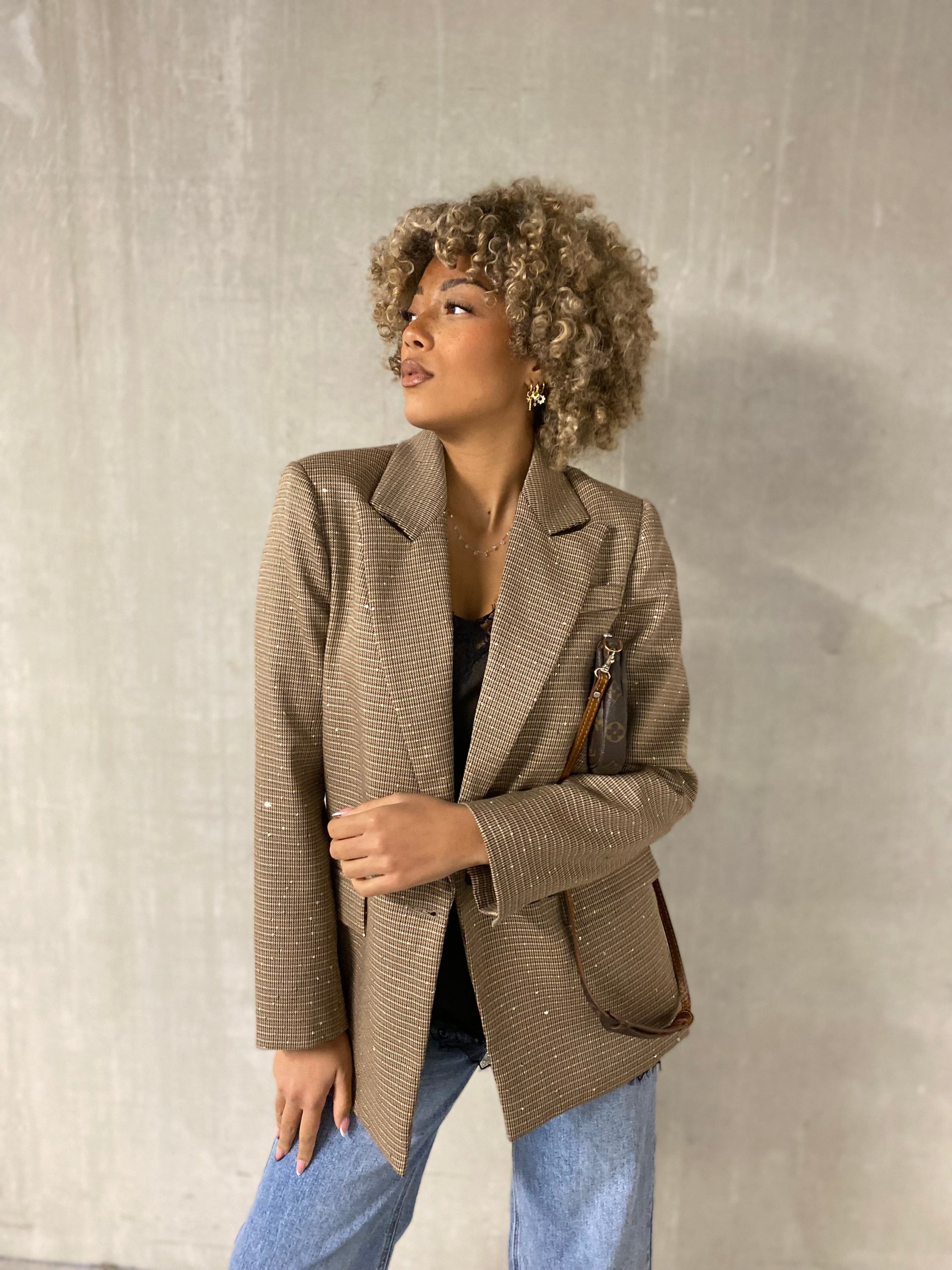 Très joli blazer, très chic beige, brun à petits carreaux vichy avec des petits strasse reluisante