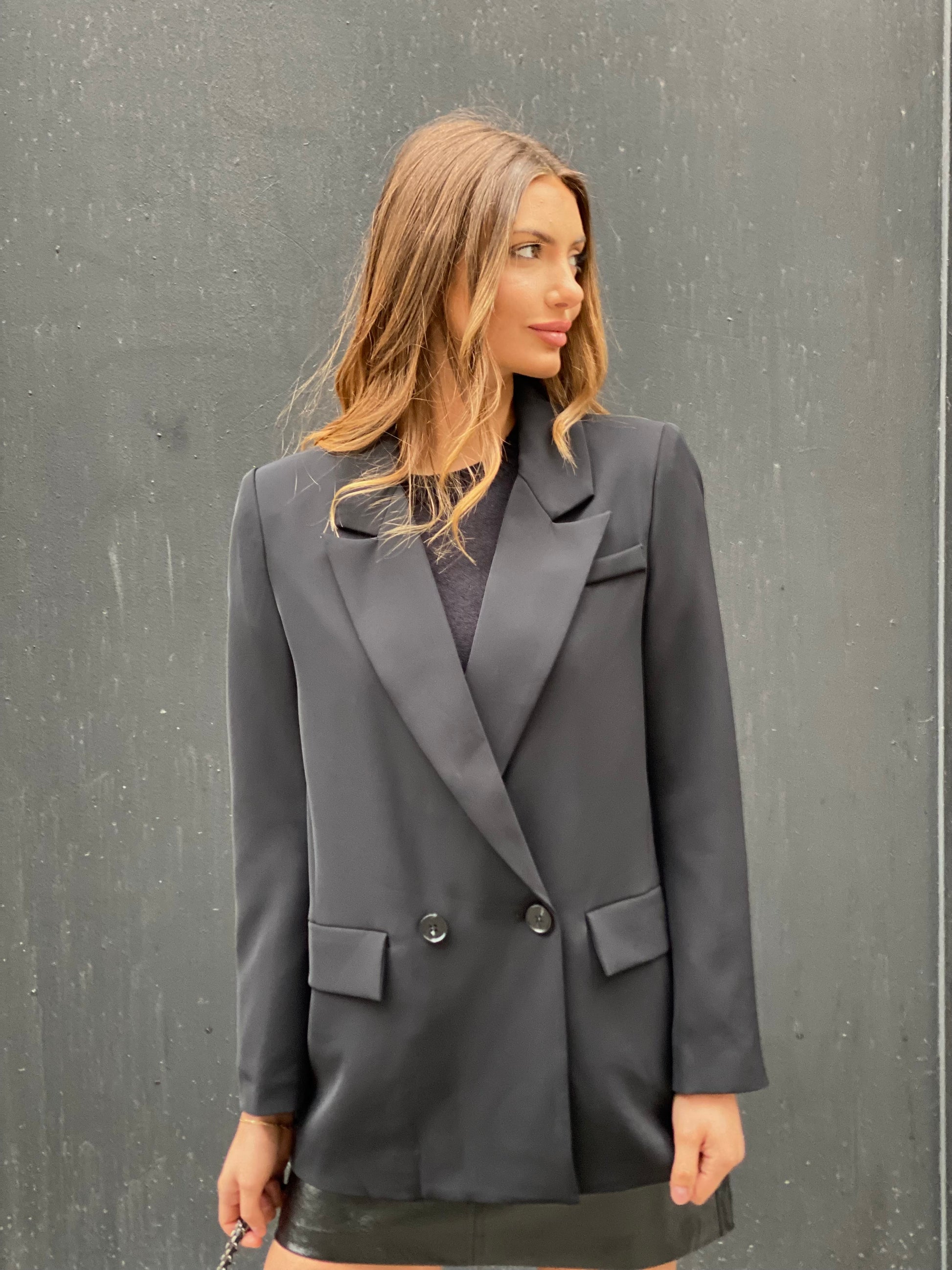 Blazer, coupe droite, un peu over, size noir, dans une très belle qualité avec un beau tombé, matière épaisse, une belle finition, deux poches, fermeture croisées avec deux boutons