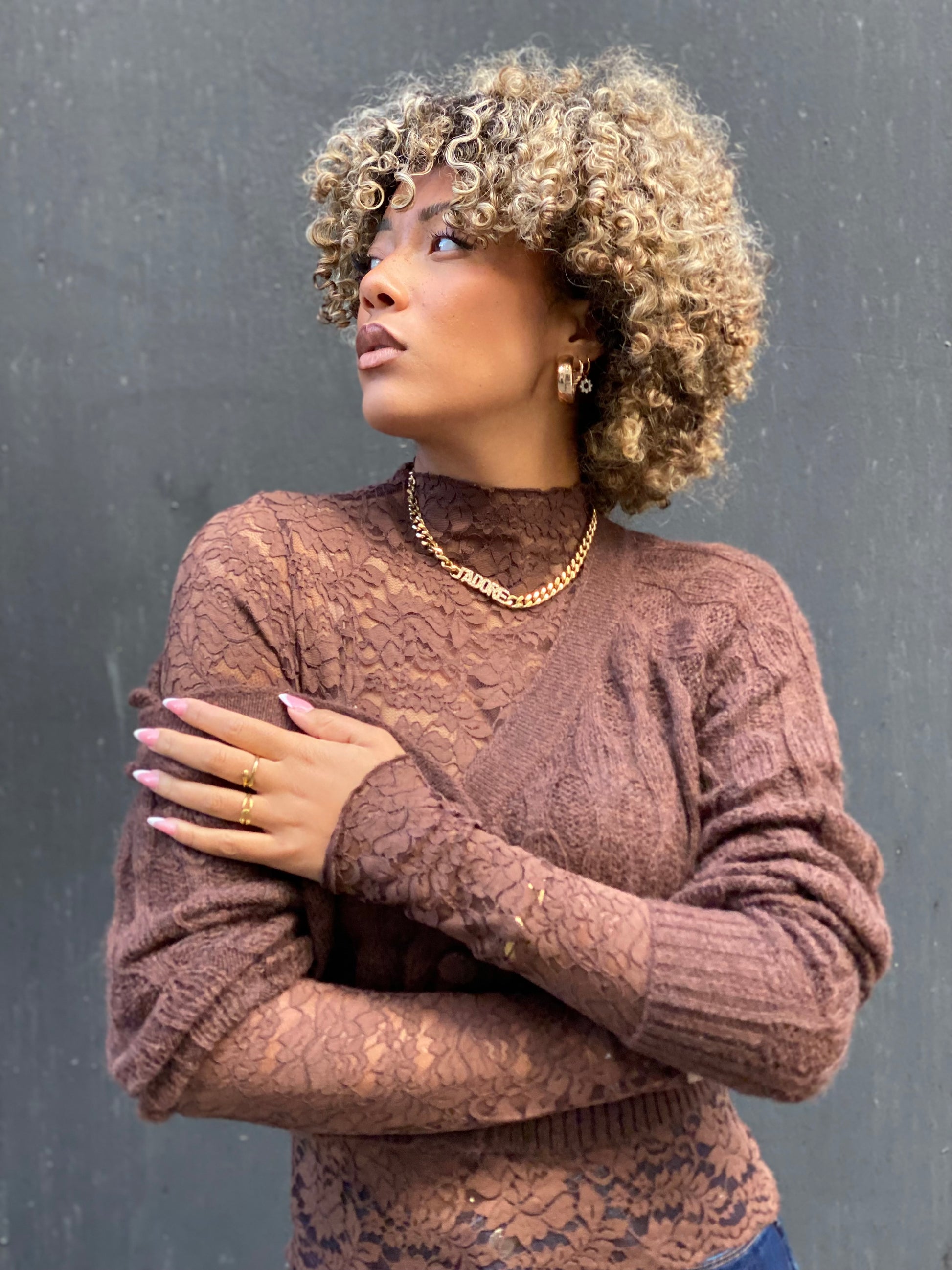 Blouse manches longues col légèrement montant , Matière toute dentelle Lycra.