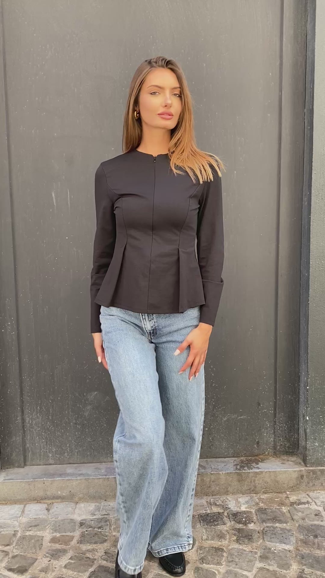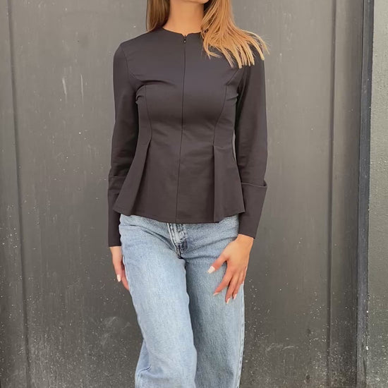 Blouse manches longues cintrée à la taille évasée. Dans le bas, elle a une grande tirette sur l'avant. C'est une matière bien extensible stretch.