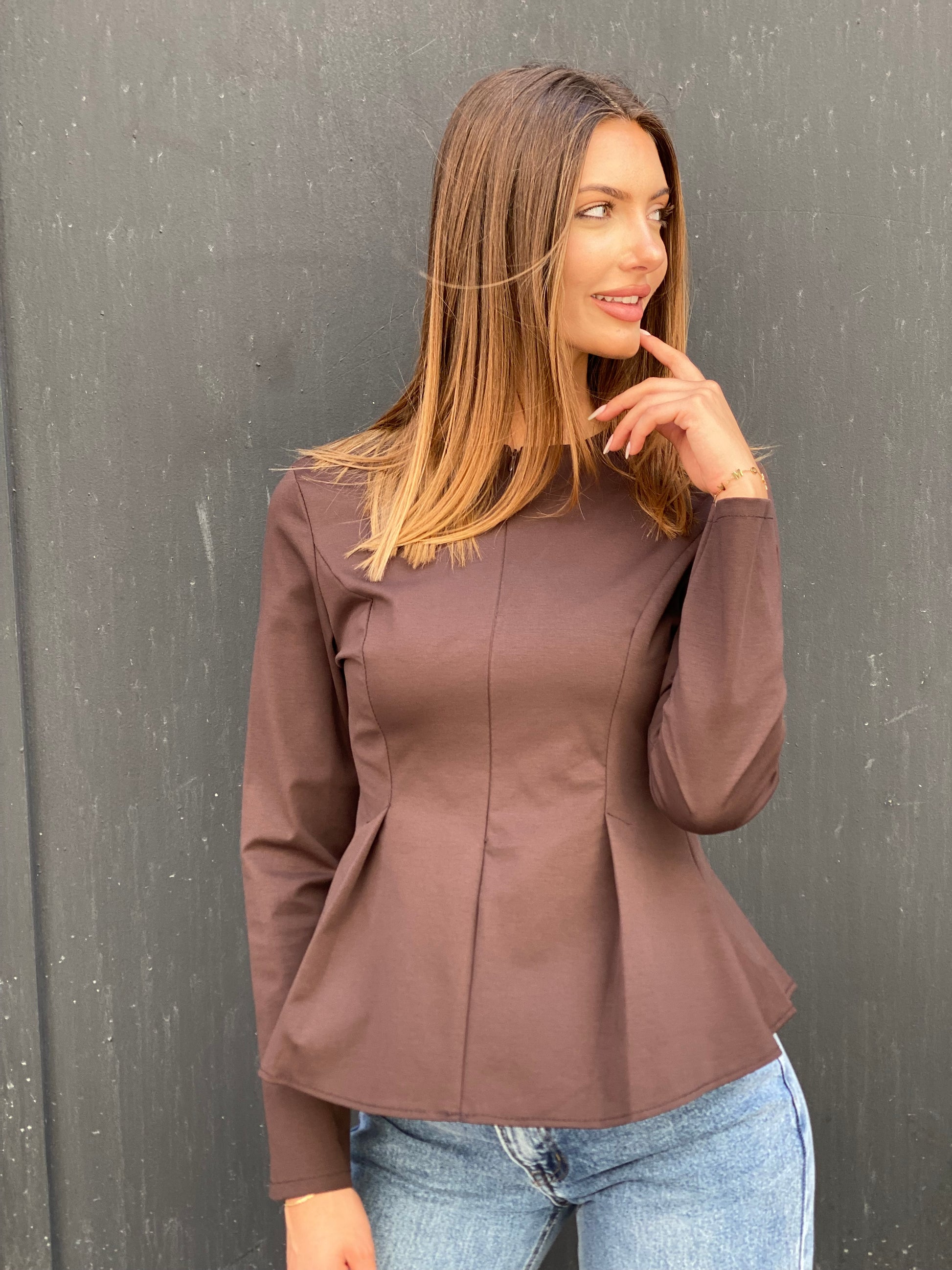 Blouse cintrée col rond avec une tirette invisible sur l'avant manches longues. Cette blouse est reprise à la taille Avec des pinces et évasée dans le bas