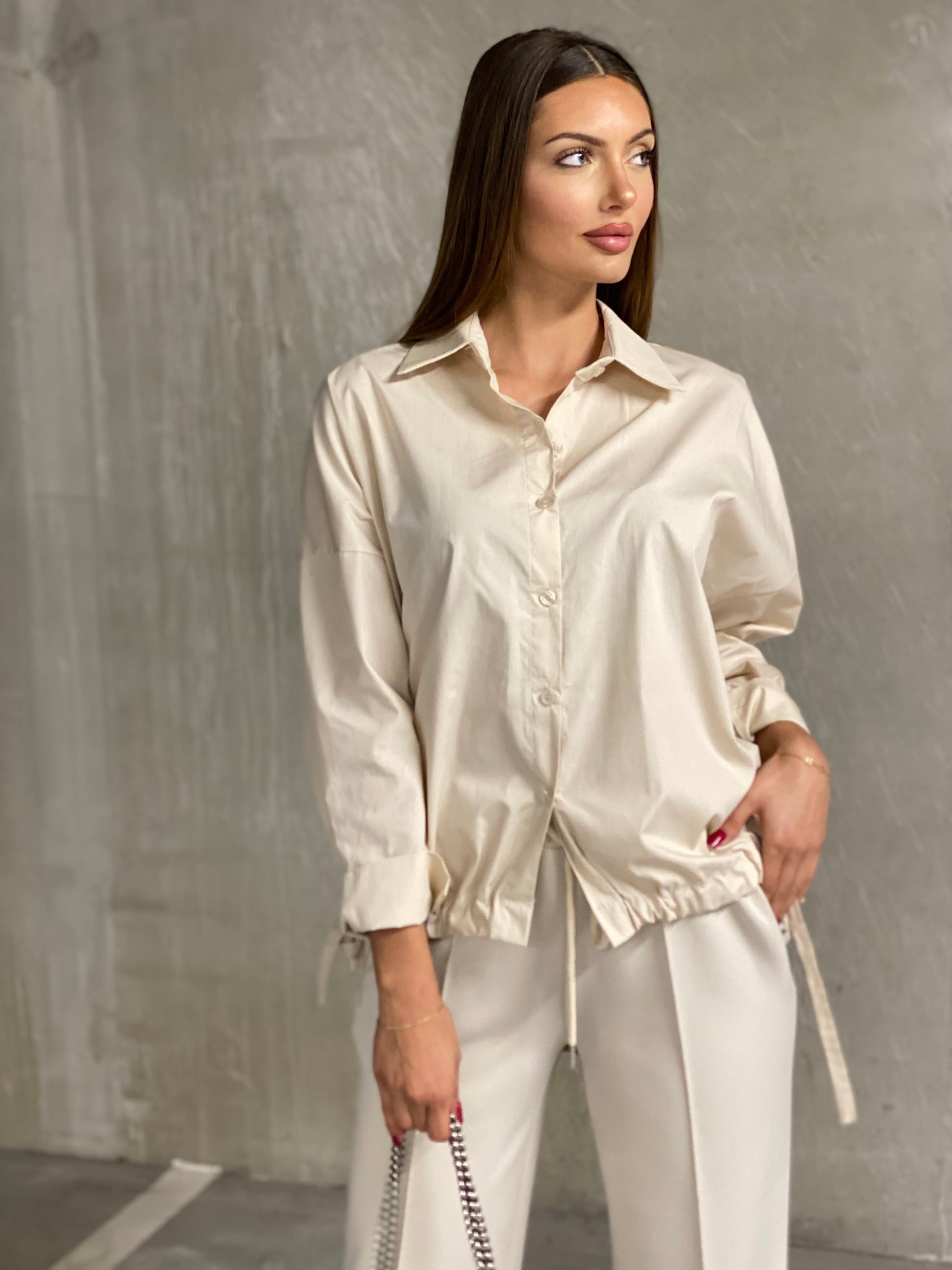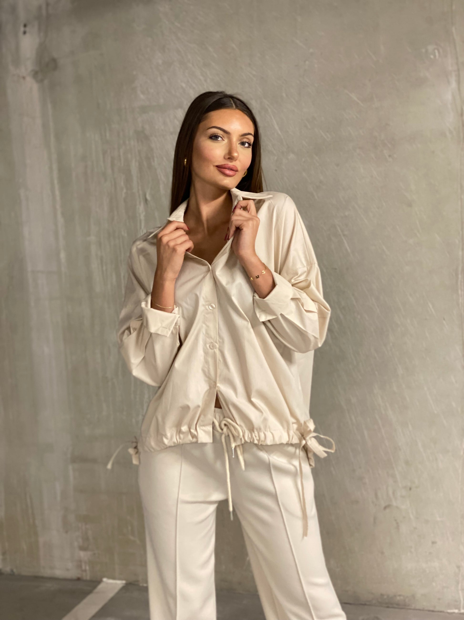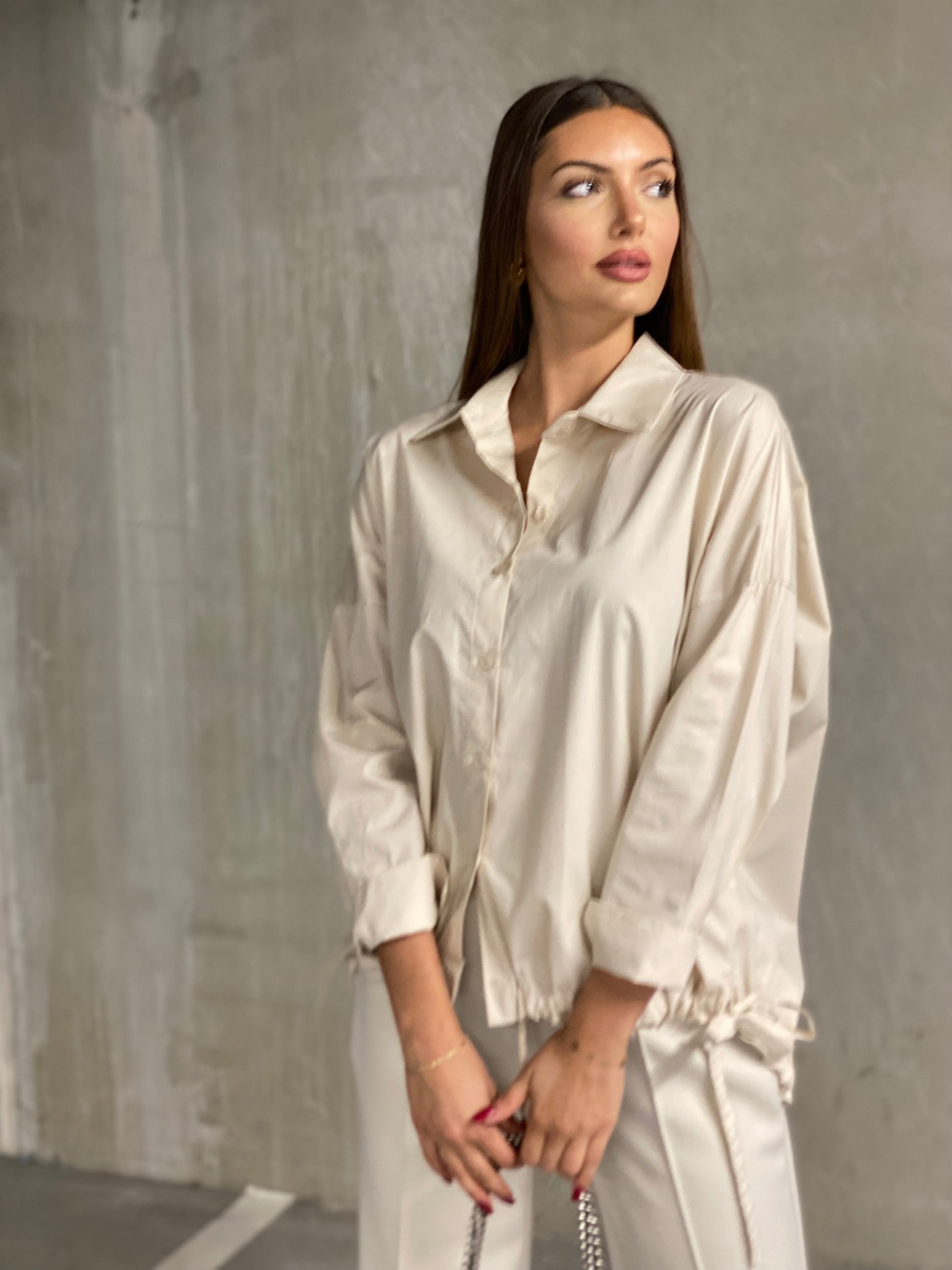 Chemise over size beige avec l'originalité d'avoir le bas de la chemise à froncer avec un petit ruban. Sur le côté ,elle est plus longue derrière que de devant.