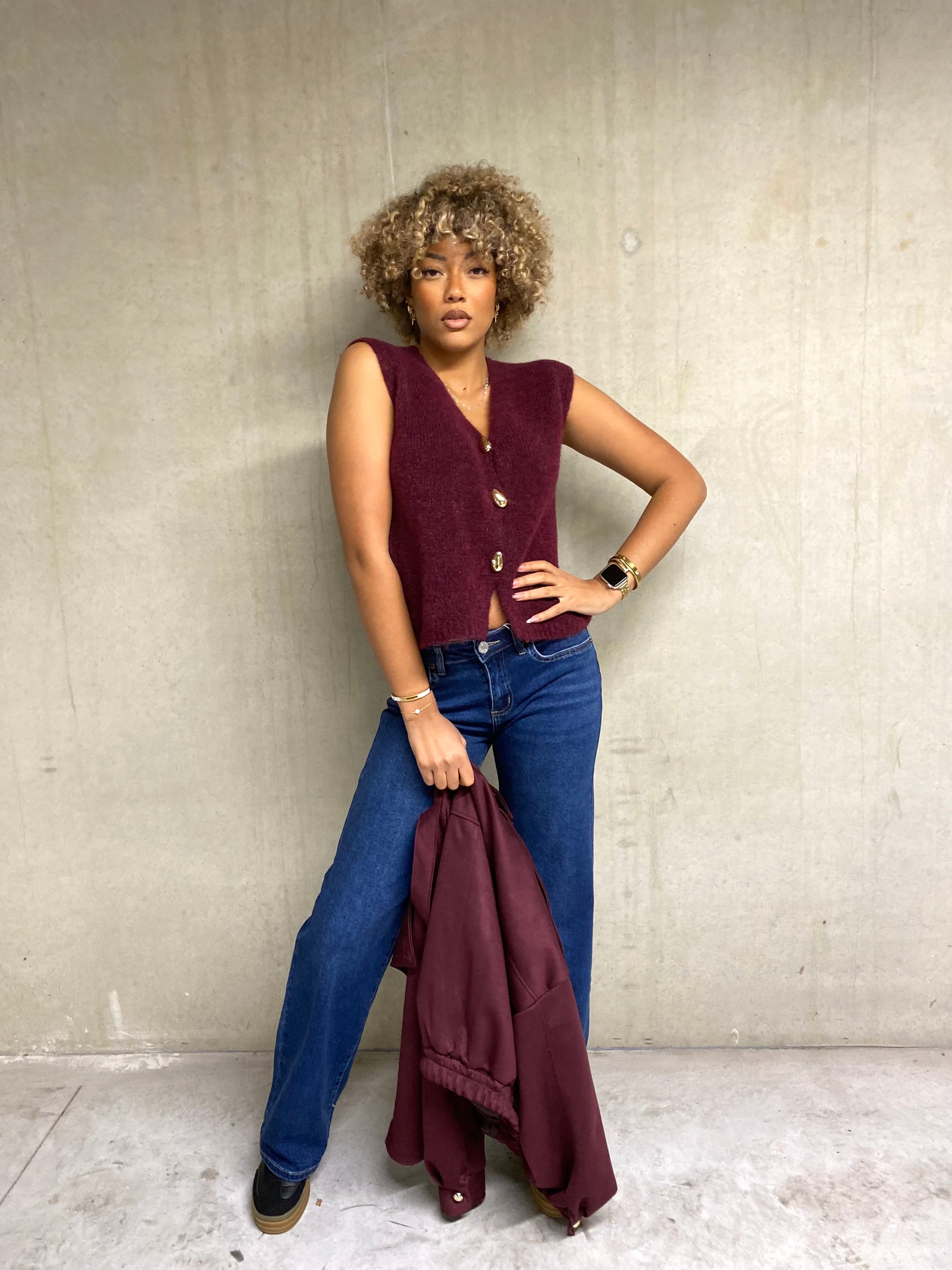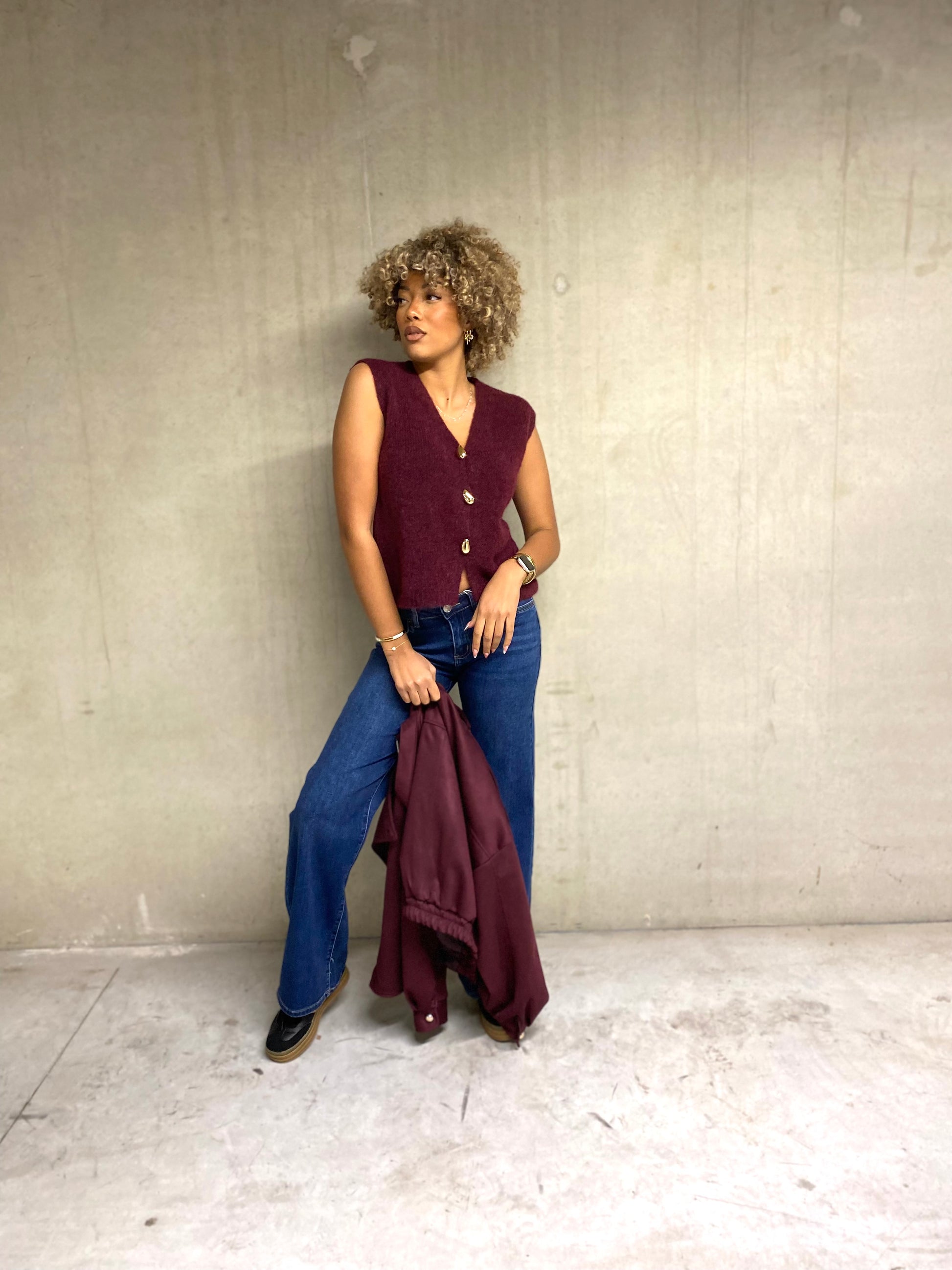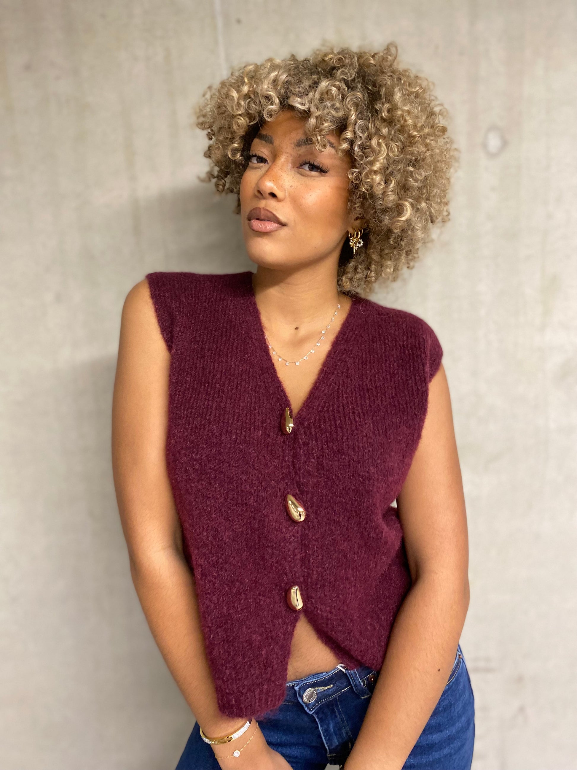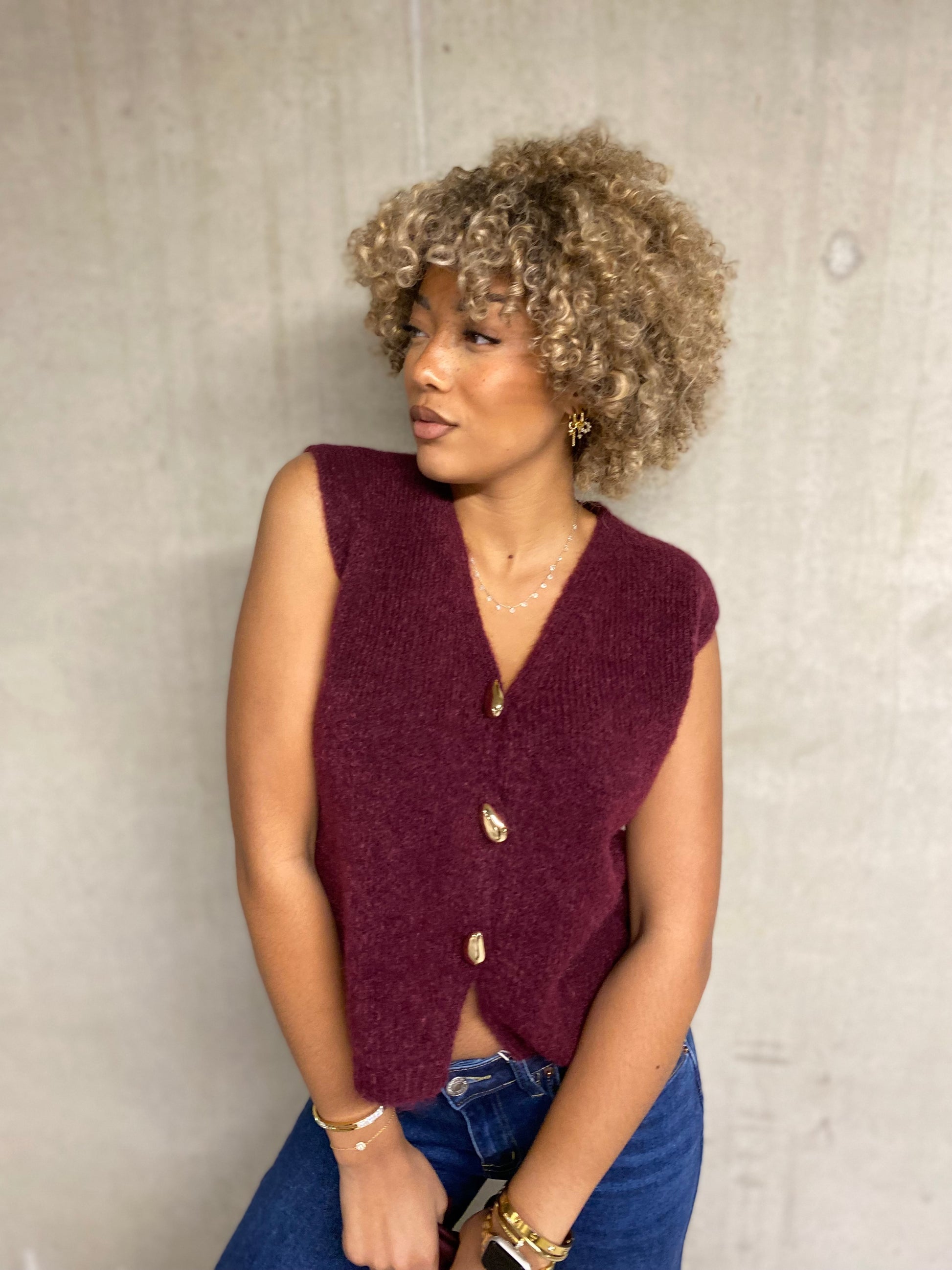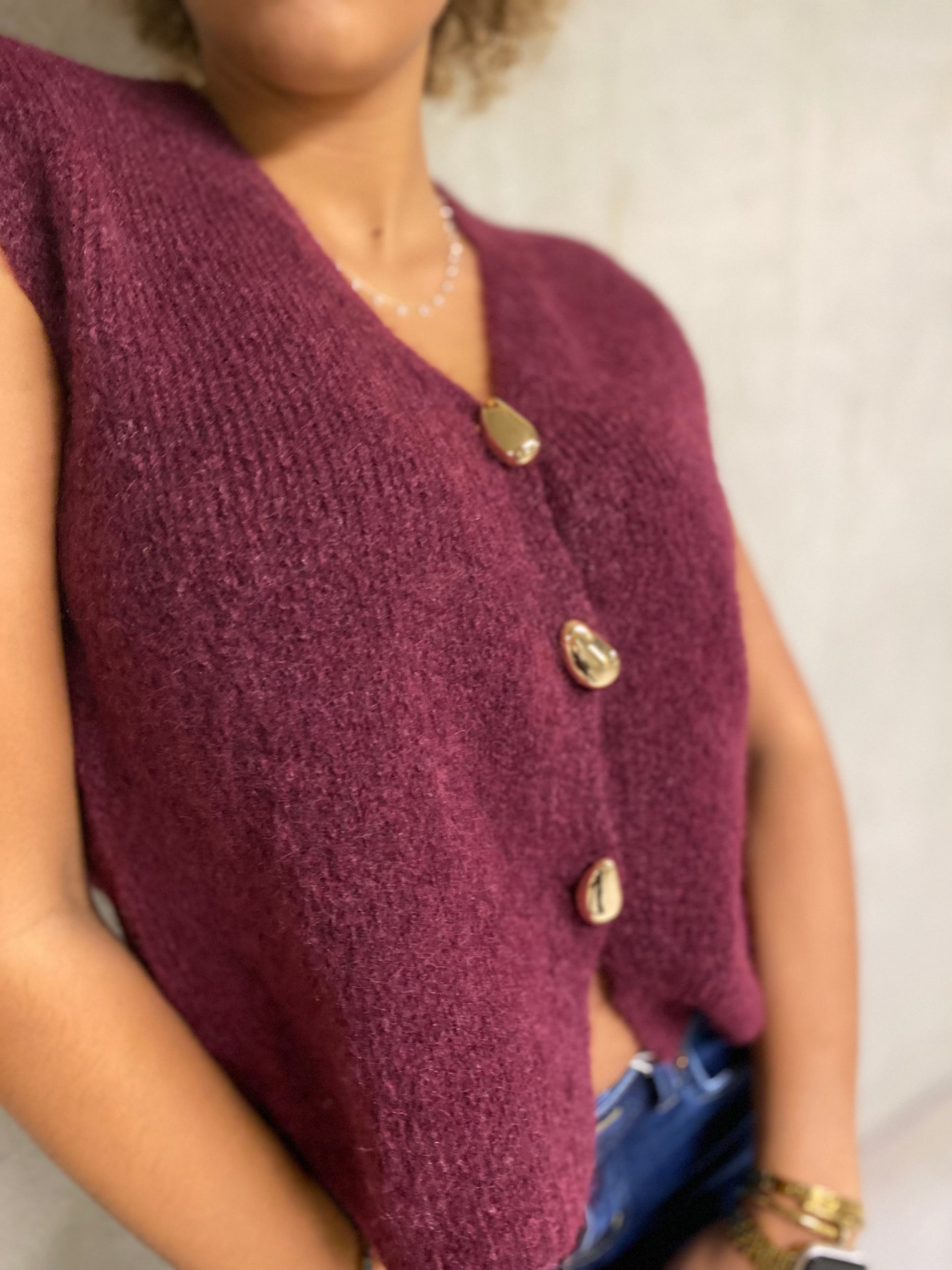 Pull gilet, débardeur, sans manches bordeaux en lainage de bonne qualité avec des boutons dorés comme des bijoux