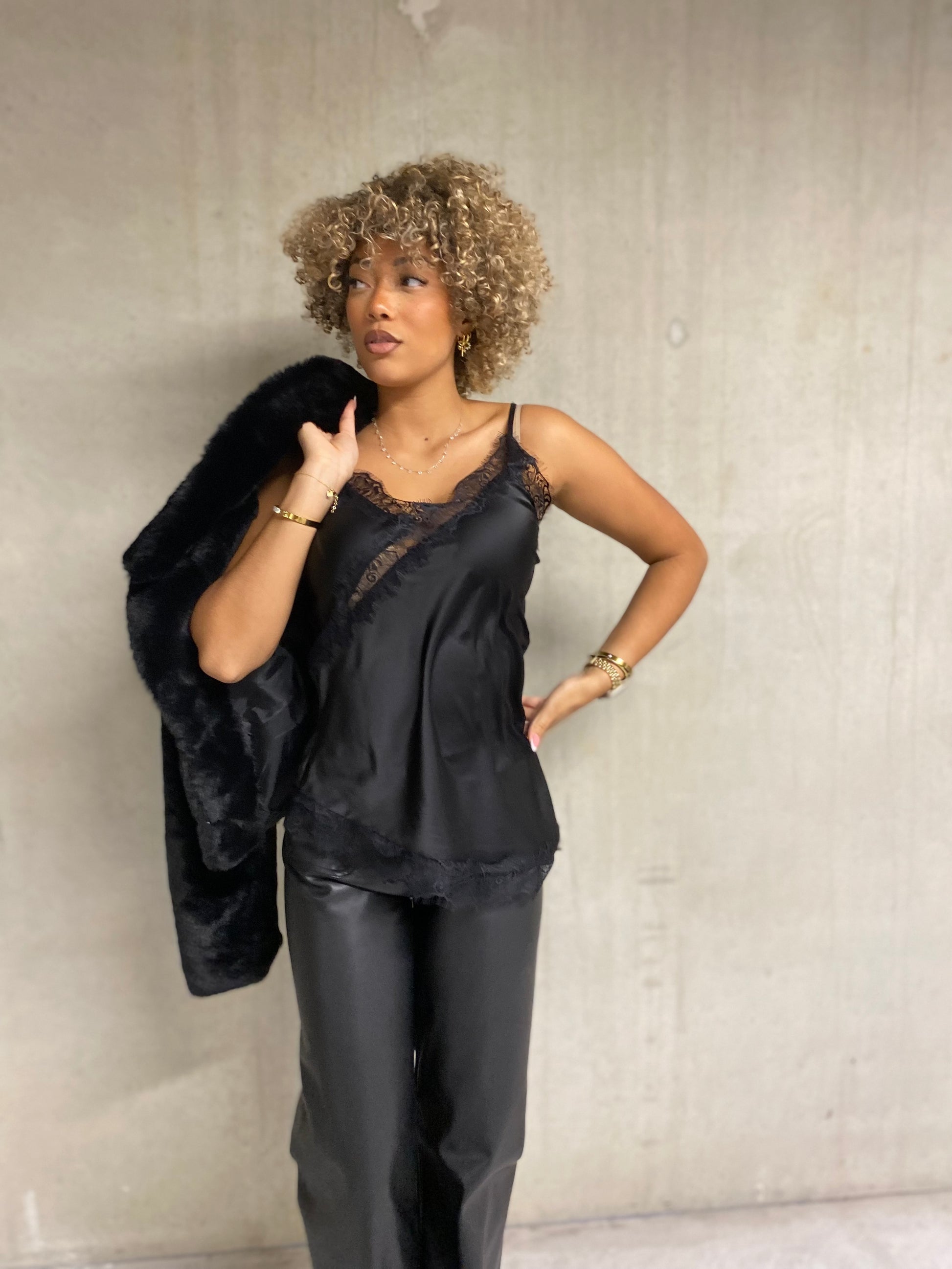 Débardeur à fines bride réglable en matière satin avec un rebord asymétrique de dentelle noire. Le bas est en pointe asymétrique avec un bord de dentelle noire. C'est une taille unique, mais s'étend bien.
