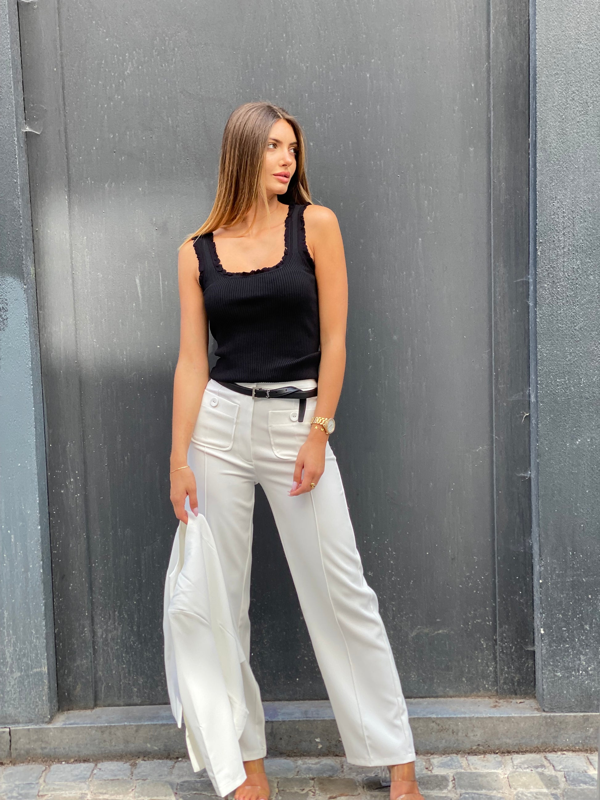Petit débardeur, matière, légèrement côtelé, avec un petit rebord au niveau de l'encolure et des manches