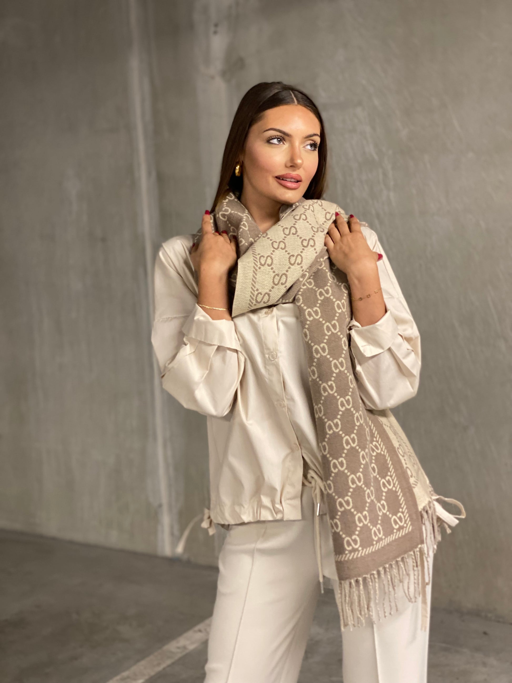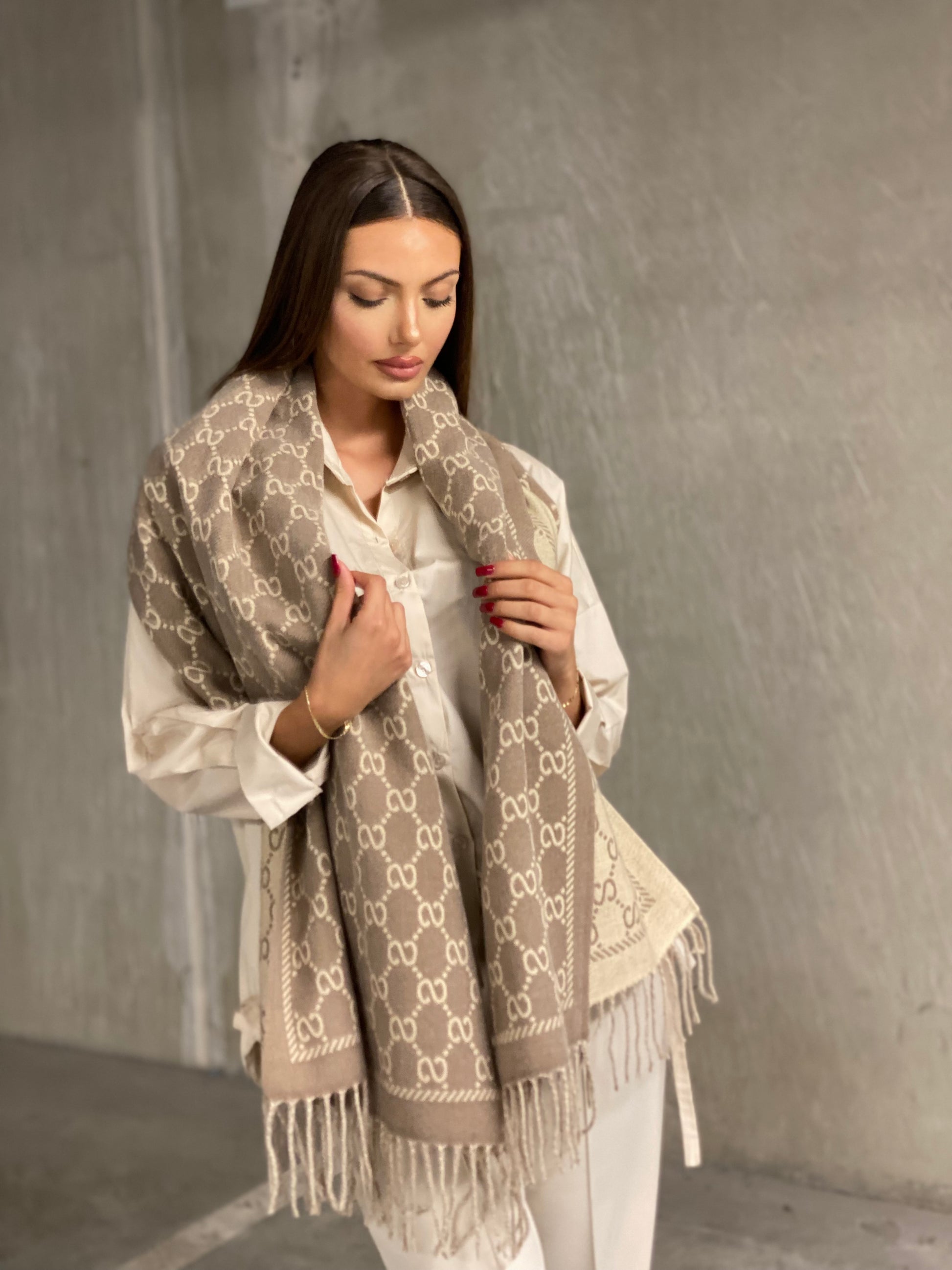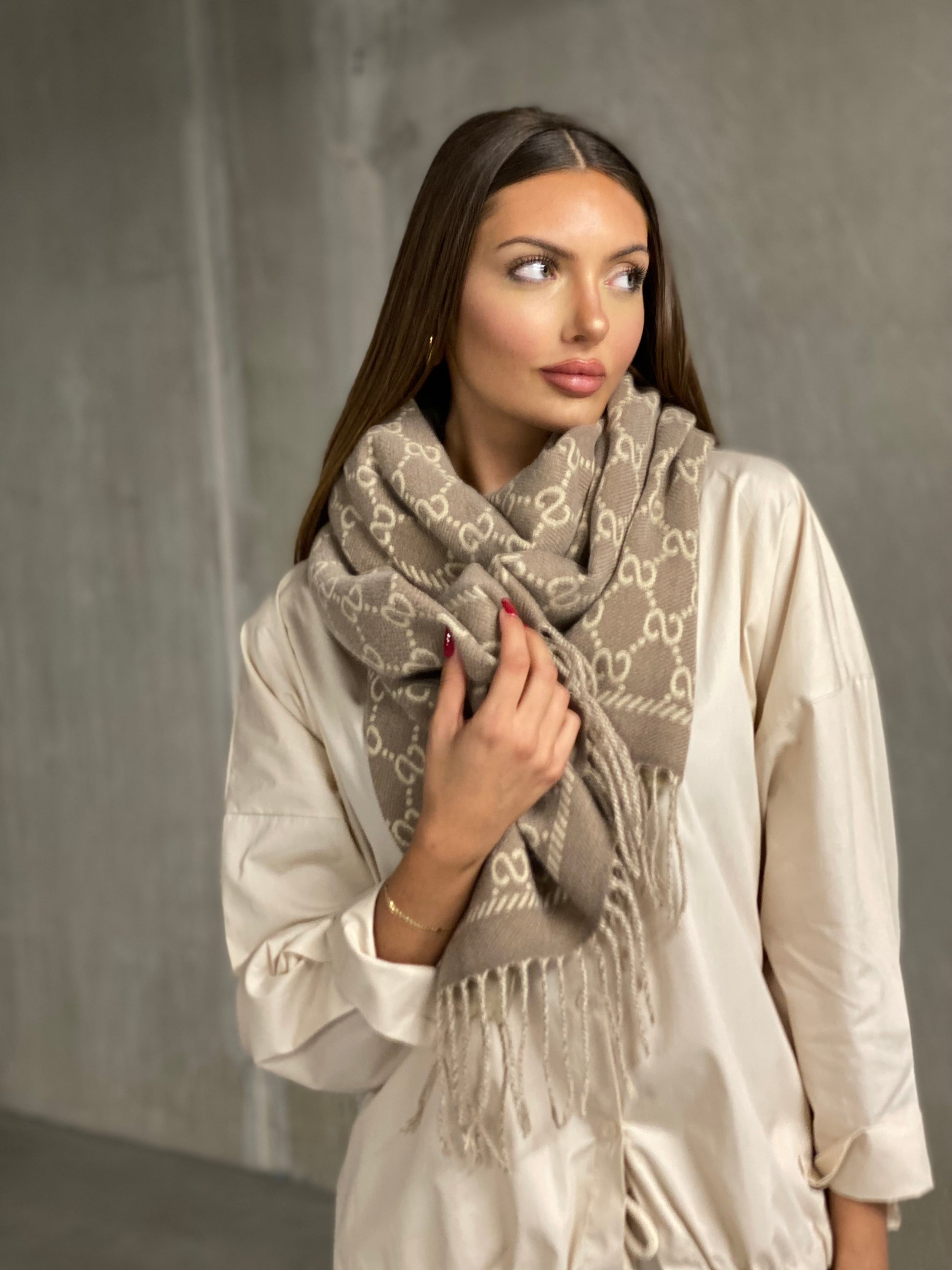 Grande écharpe bien douce dans les tons de taupe et beige avec un imprimé