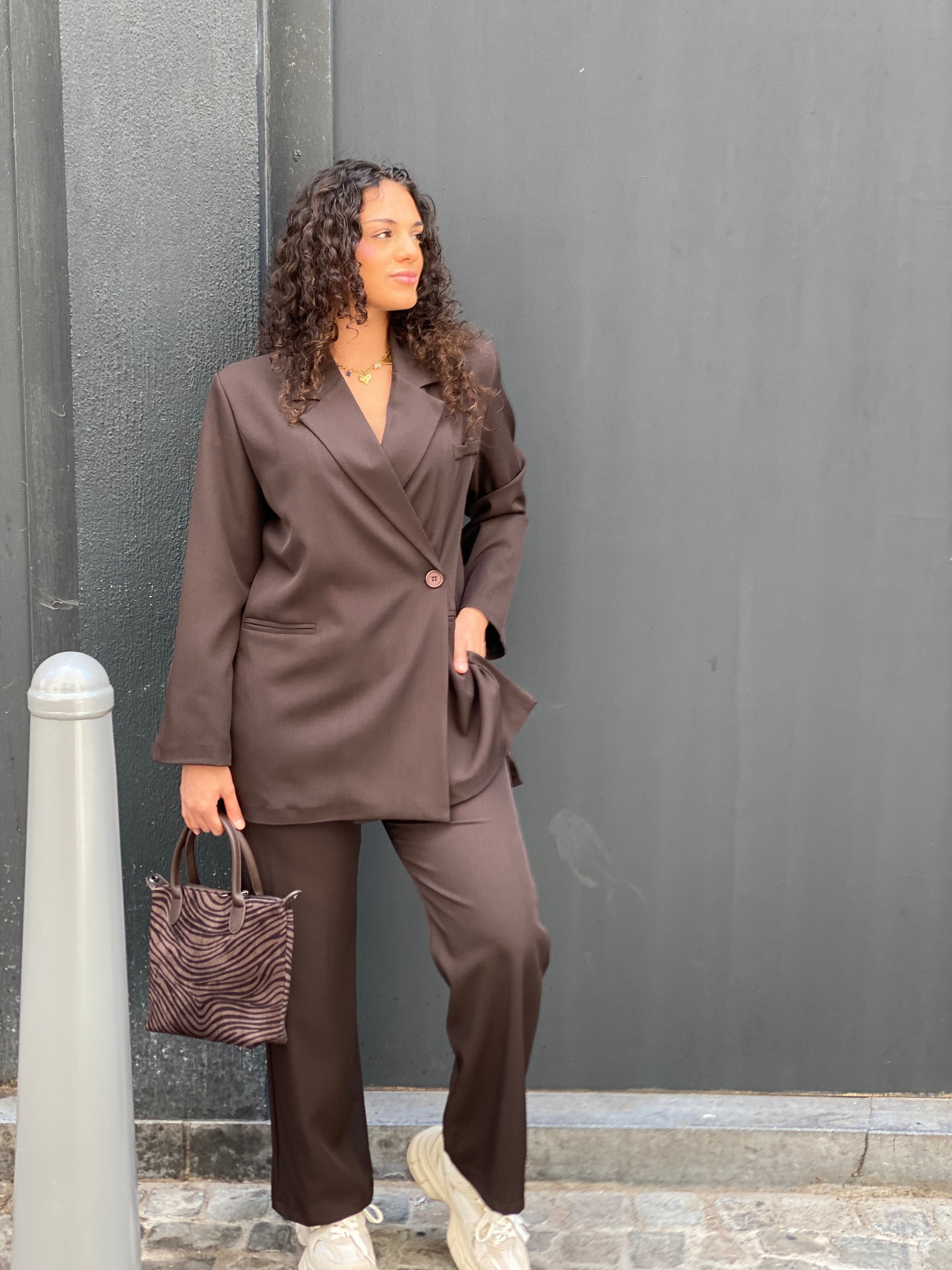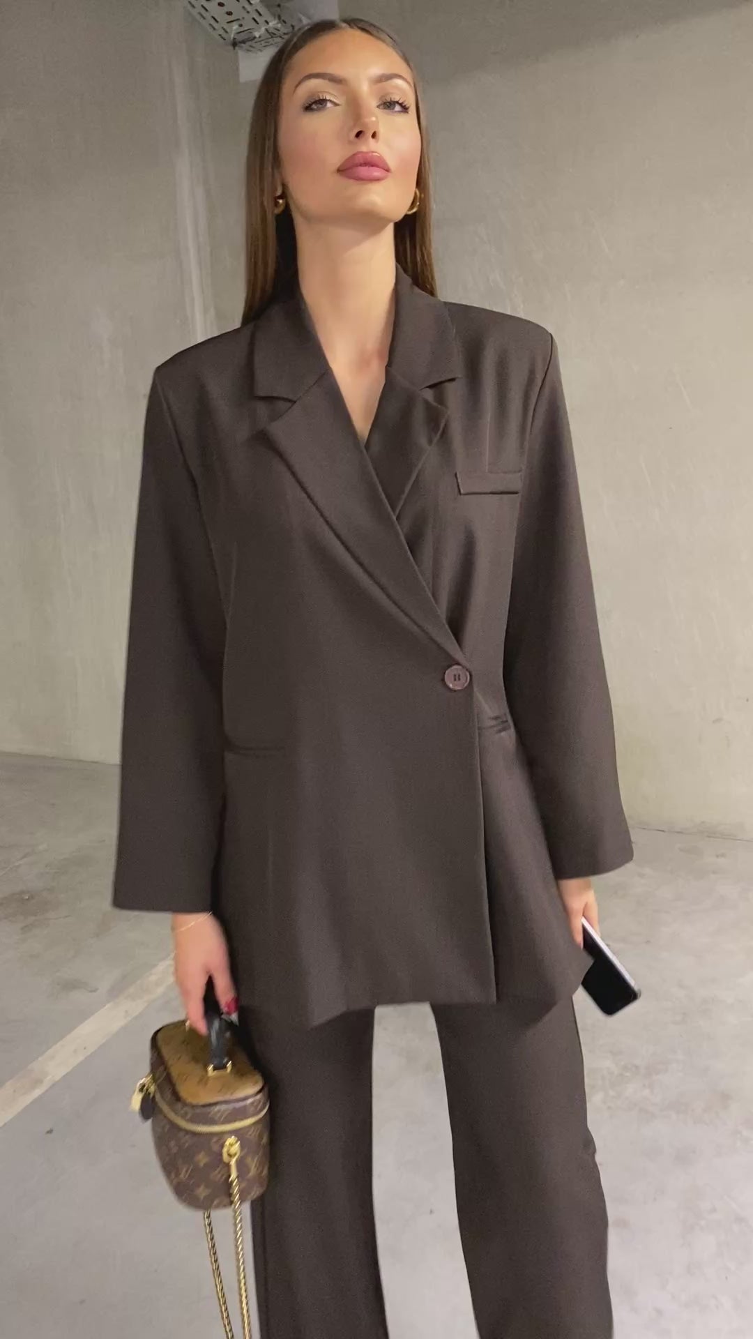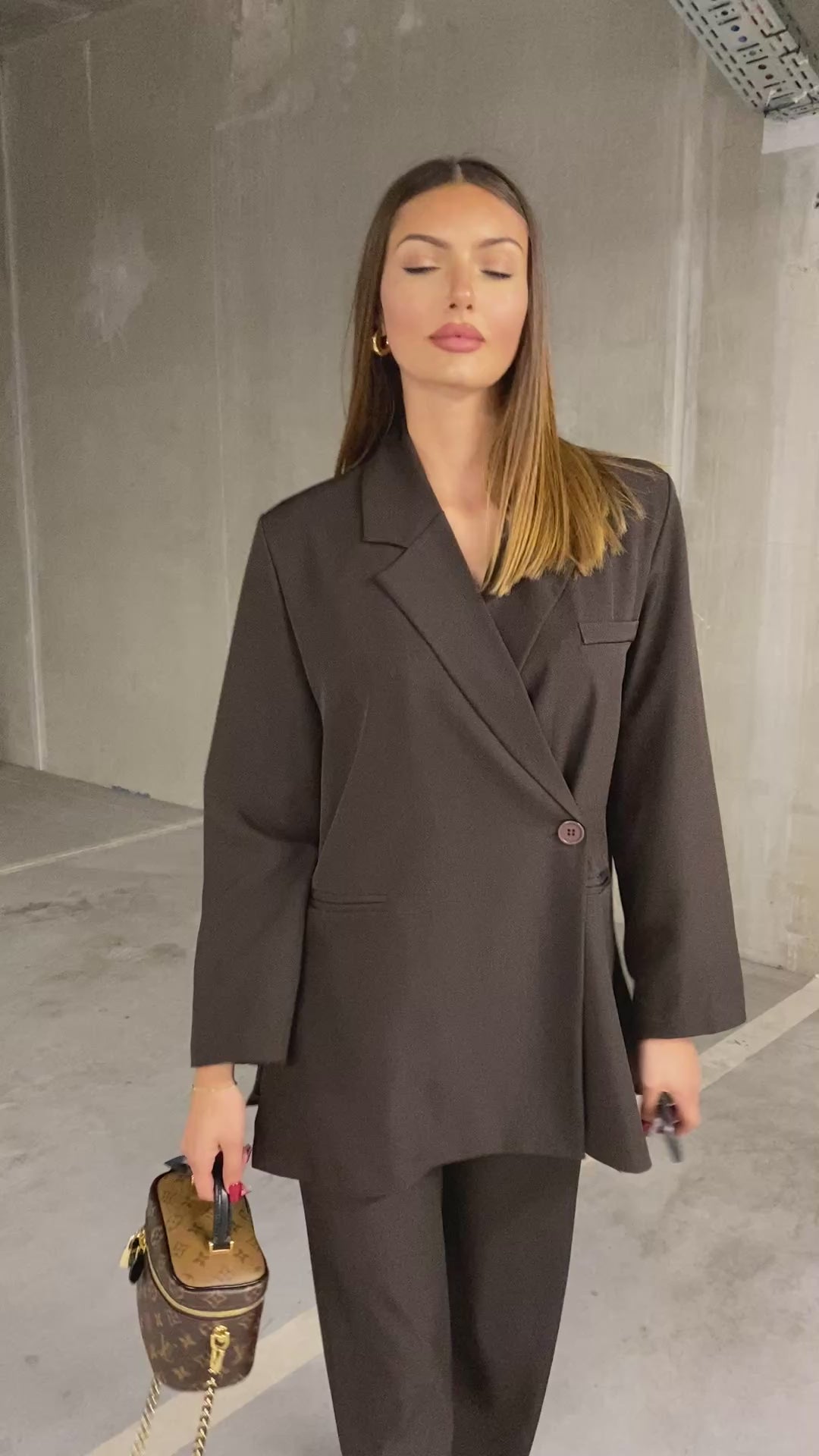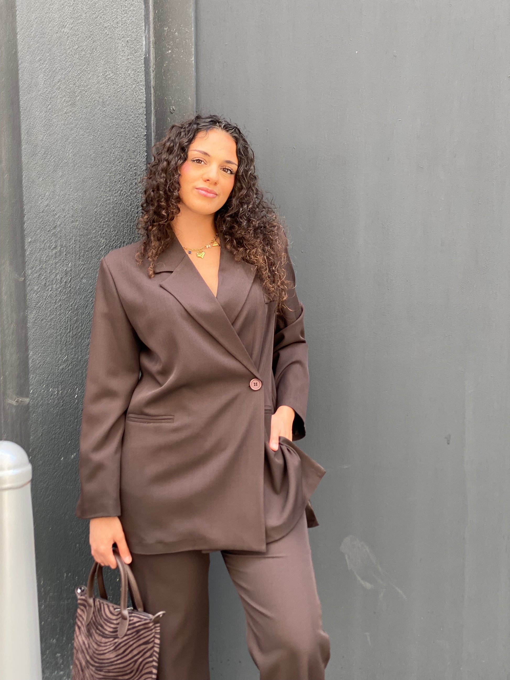 Magnifique tailleur brun chocolat foncé, qui se compose d'une veste Blazer over size qui s'attache asymétrique avec deux petites fentes sur le côté