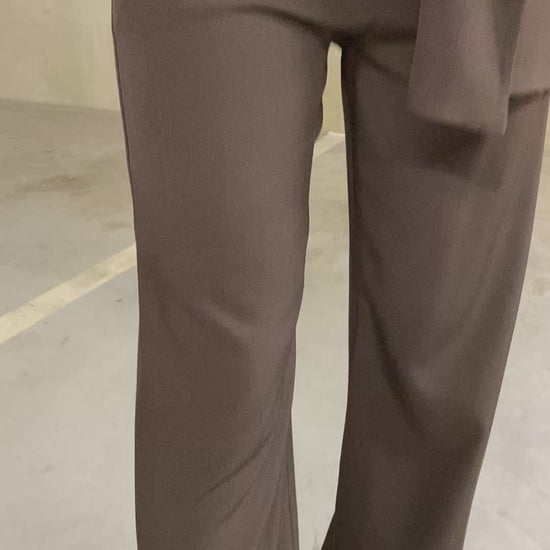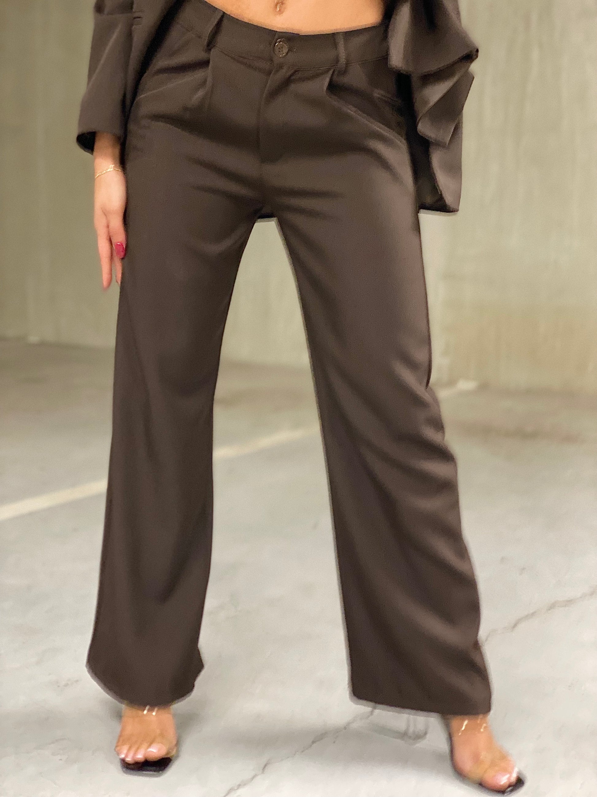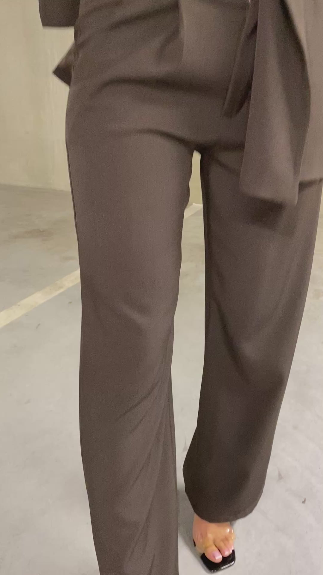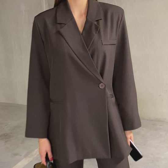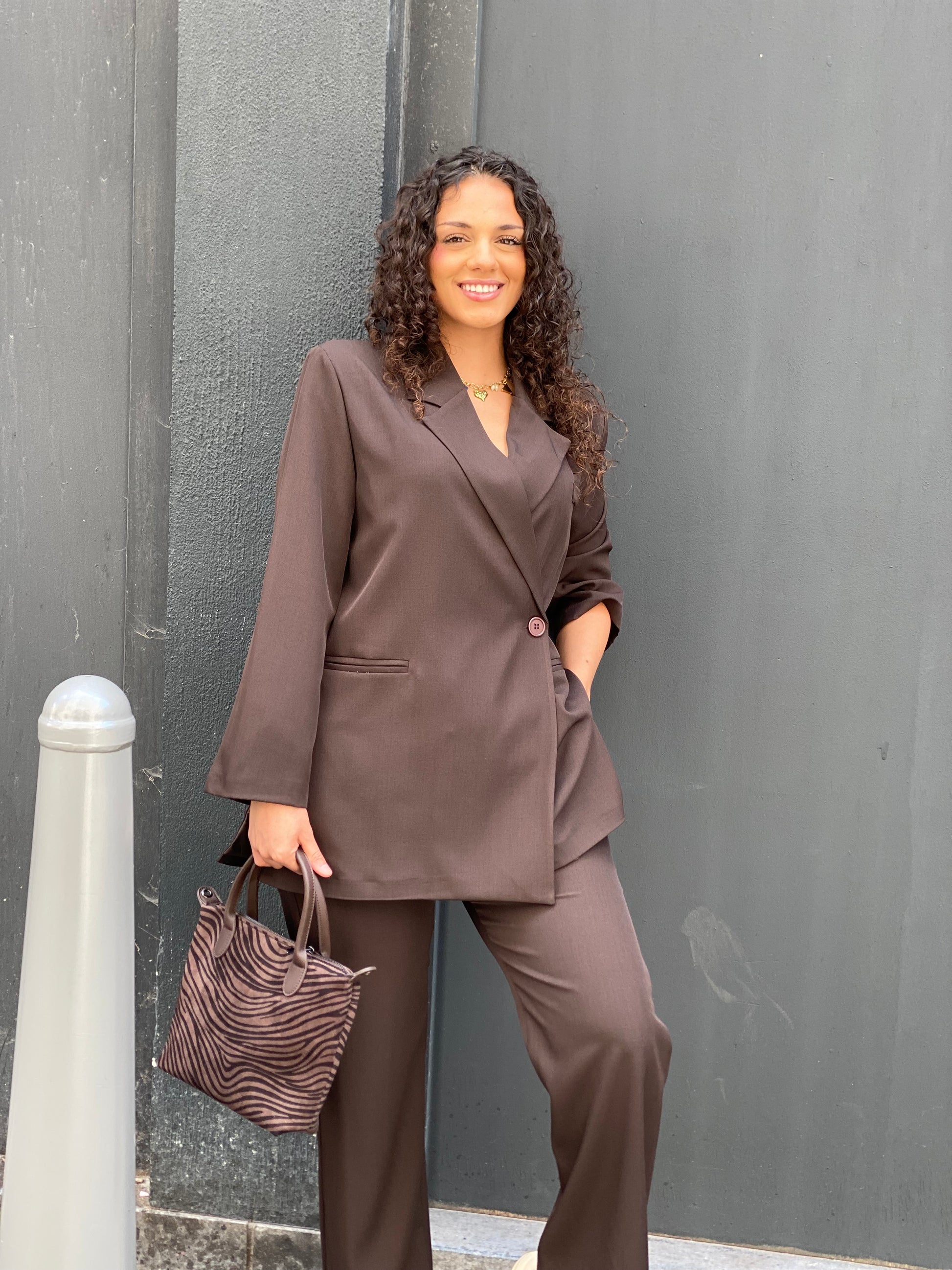 Magnifique tailleur brun chocolat foncé, qui se compose d'une veste Blazer over size qui s'attache asymétrique avec deux petites fentes sur le côté