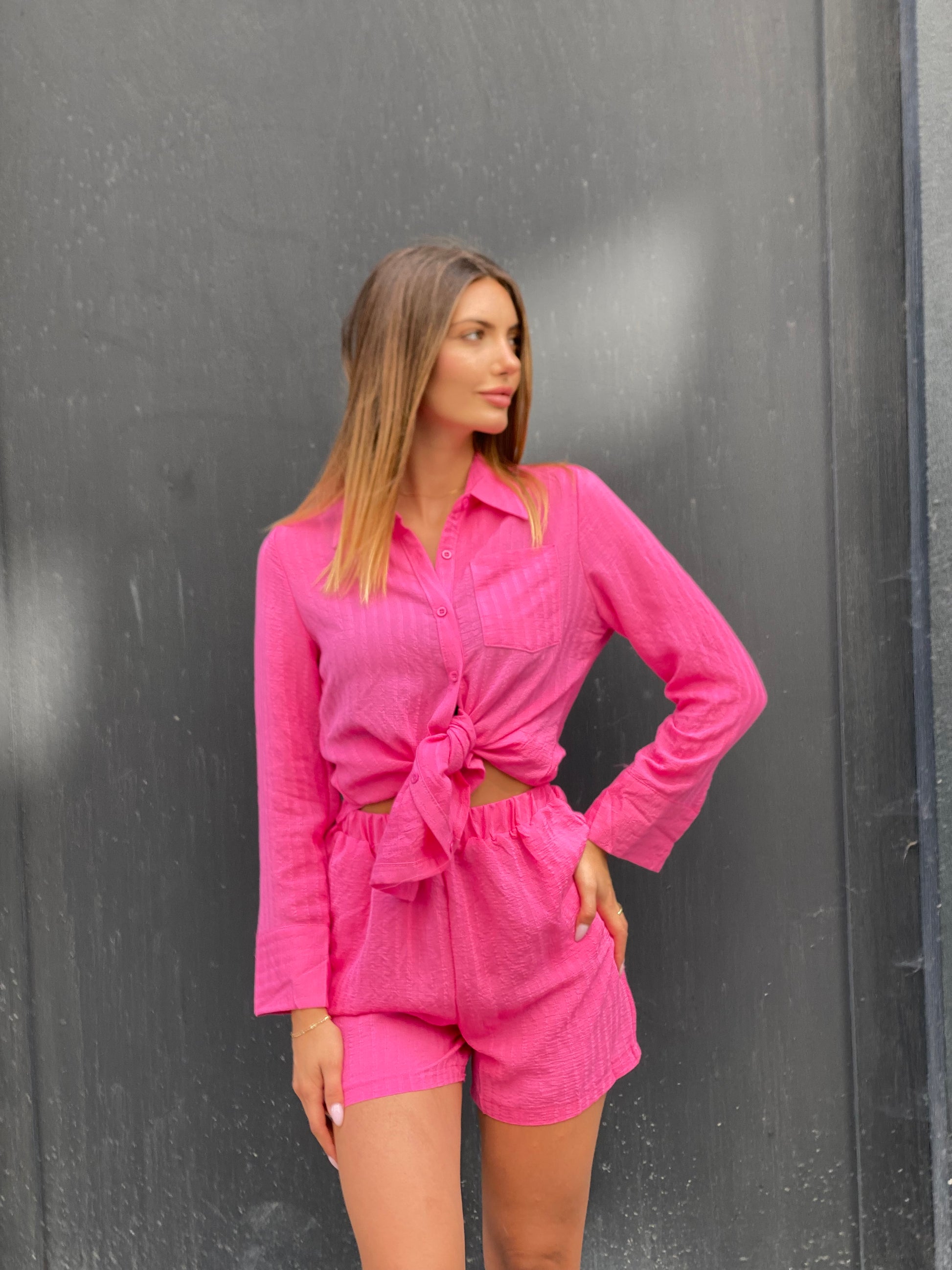 Ensemble qui se compose d'une chemise droite, manches longues et un short taille élastique, il a deux poches