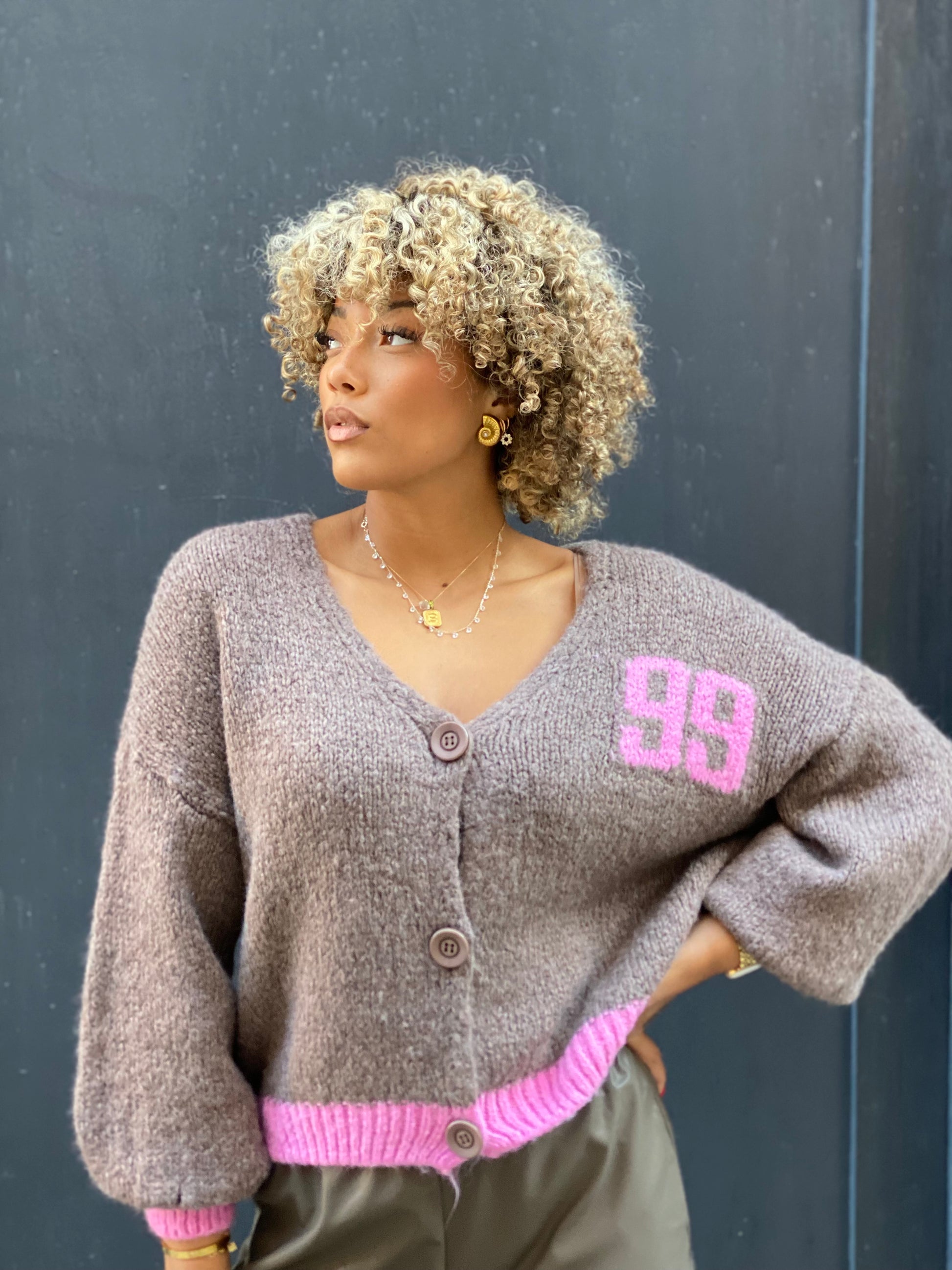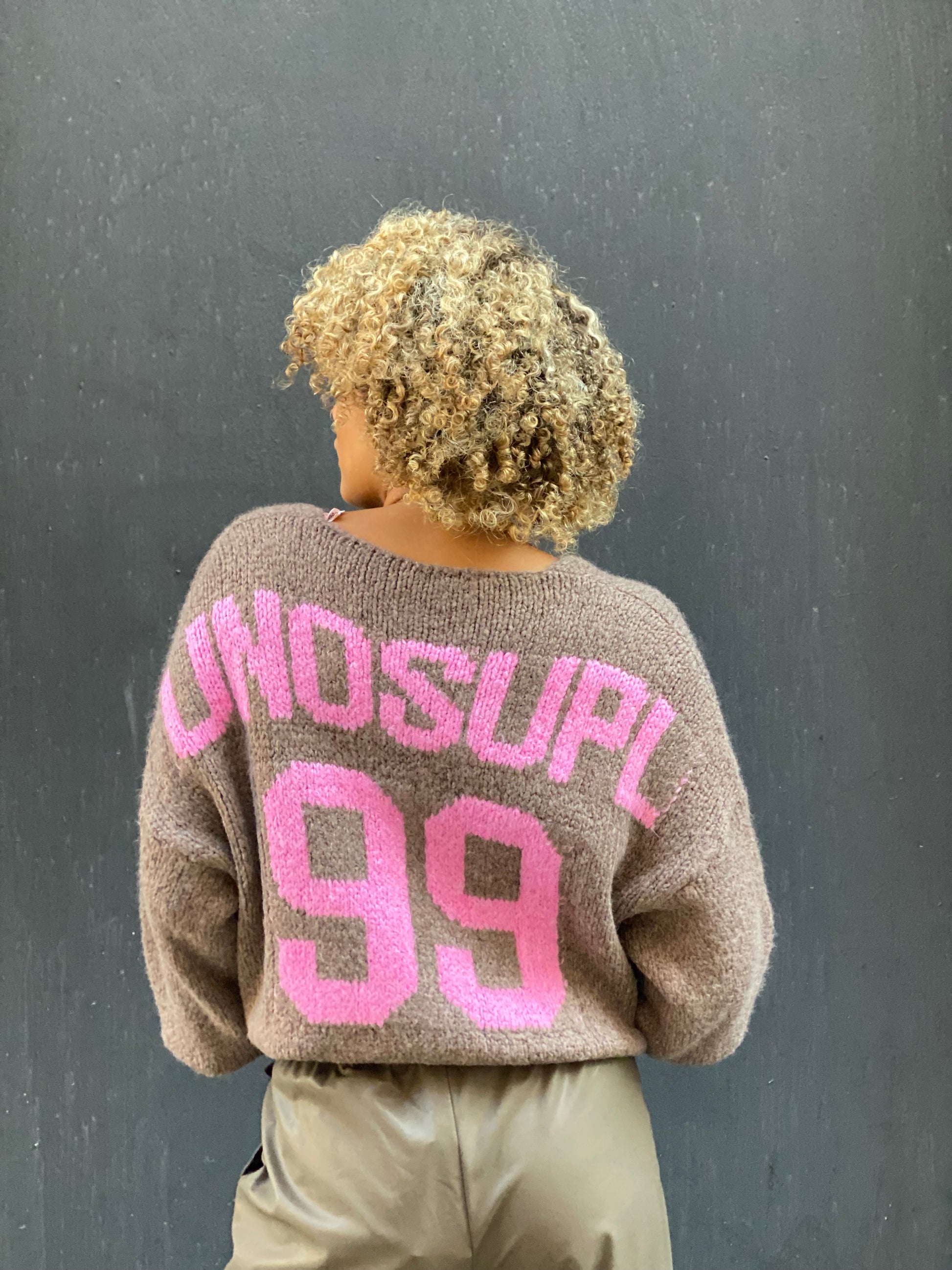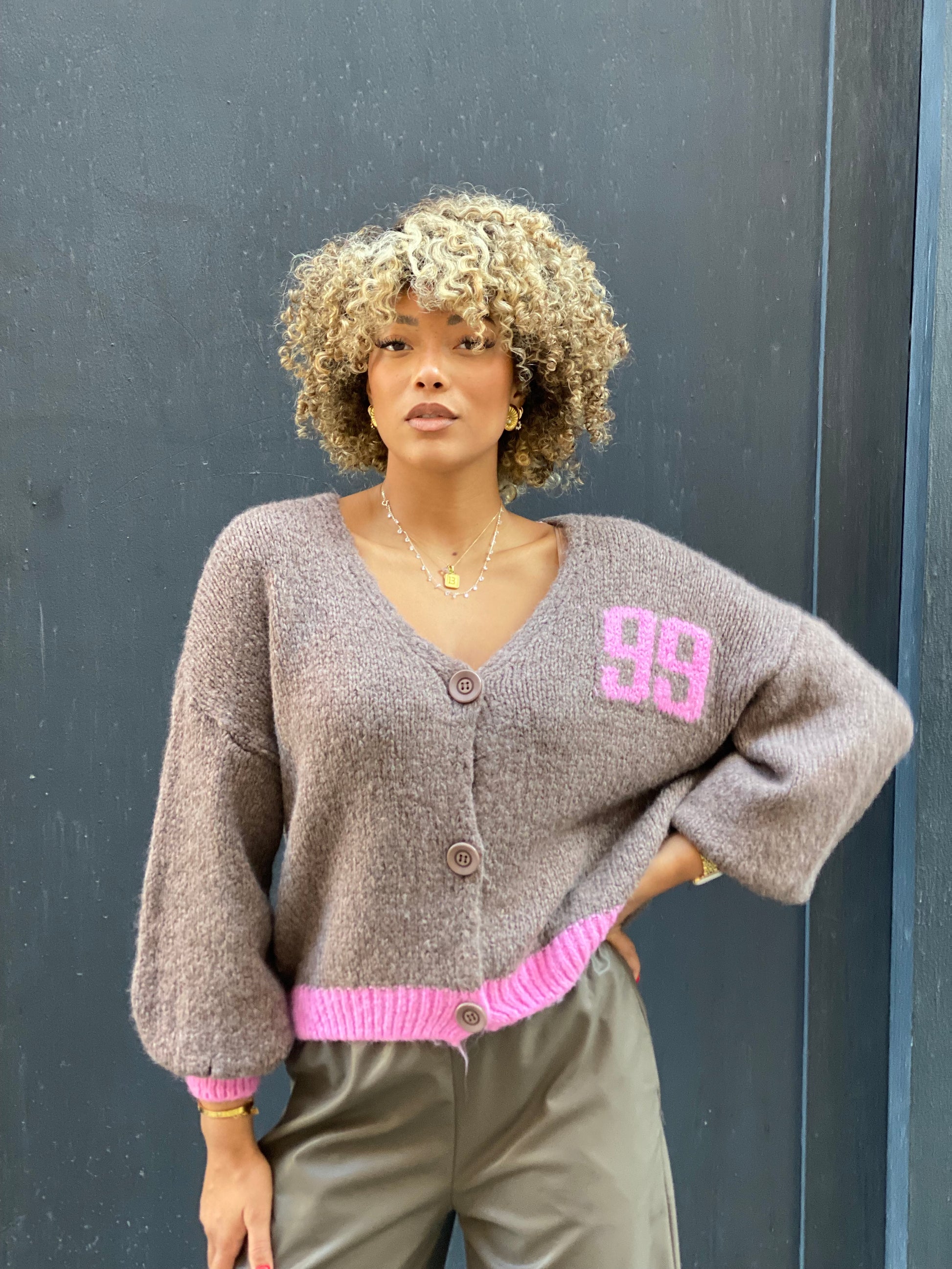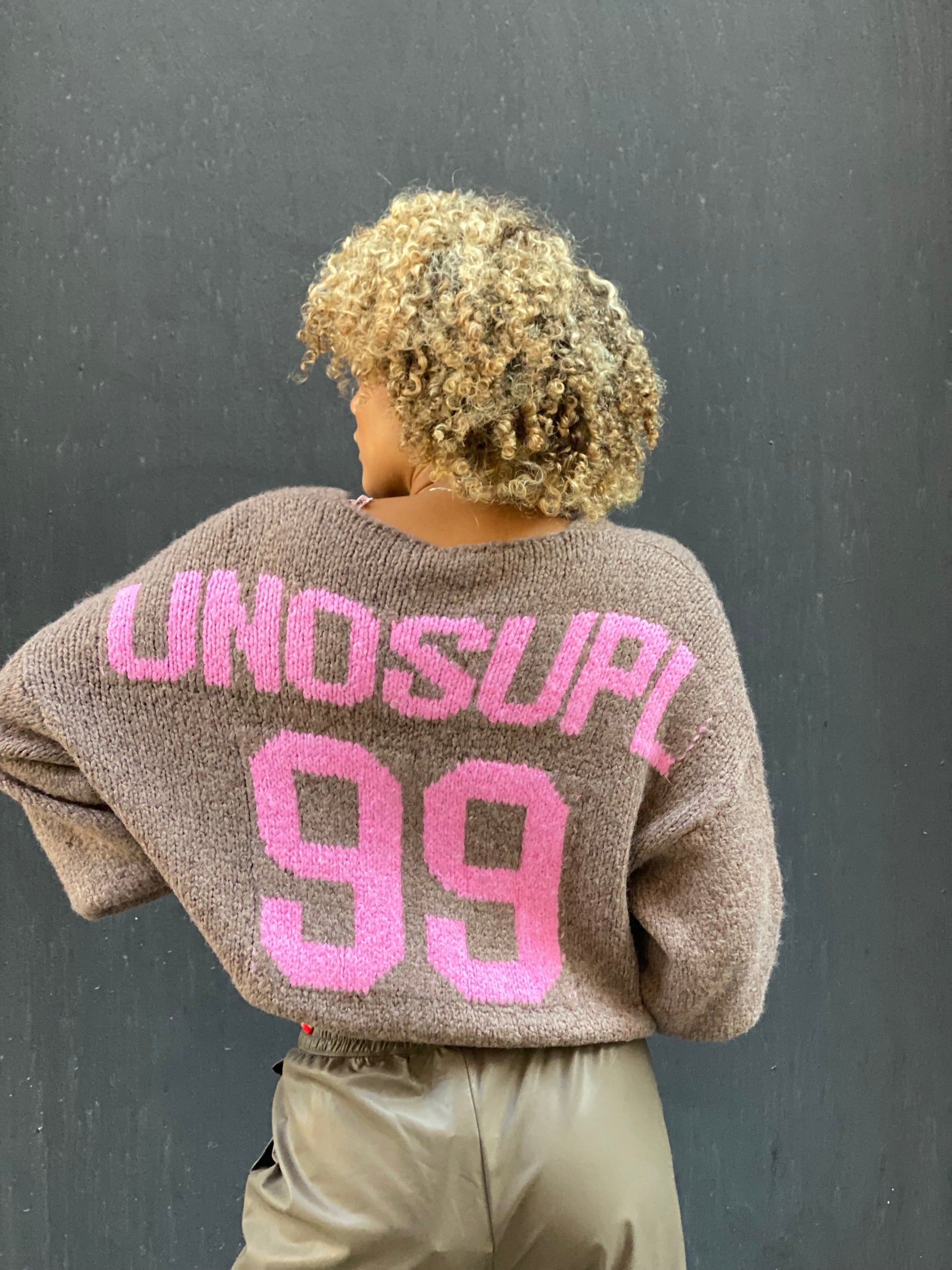Gilet en lainage, brun taupe avec une inscription 99 sur l'avant, en rose flash, le bord rose et l'arrière broder 99 ( Unosupl ) en rose flash