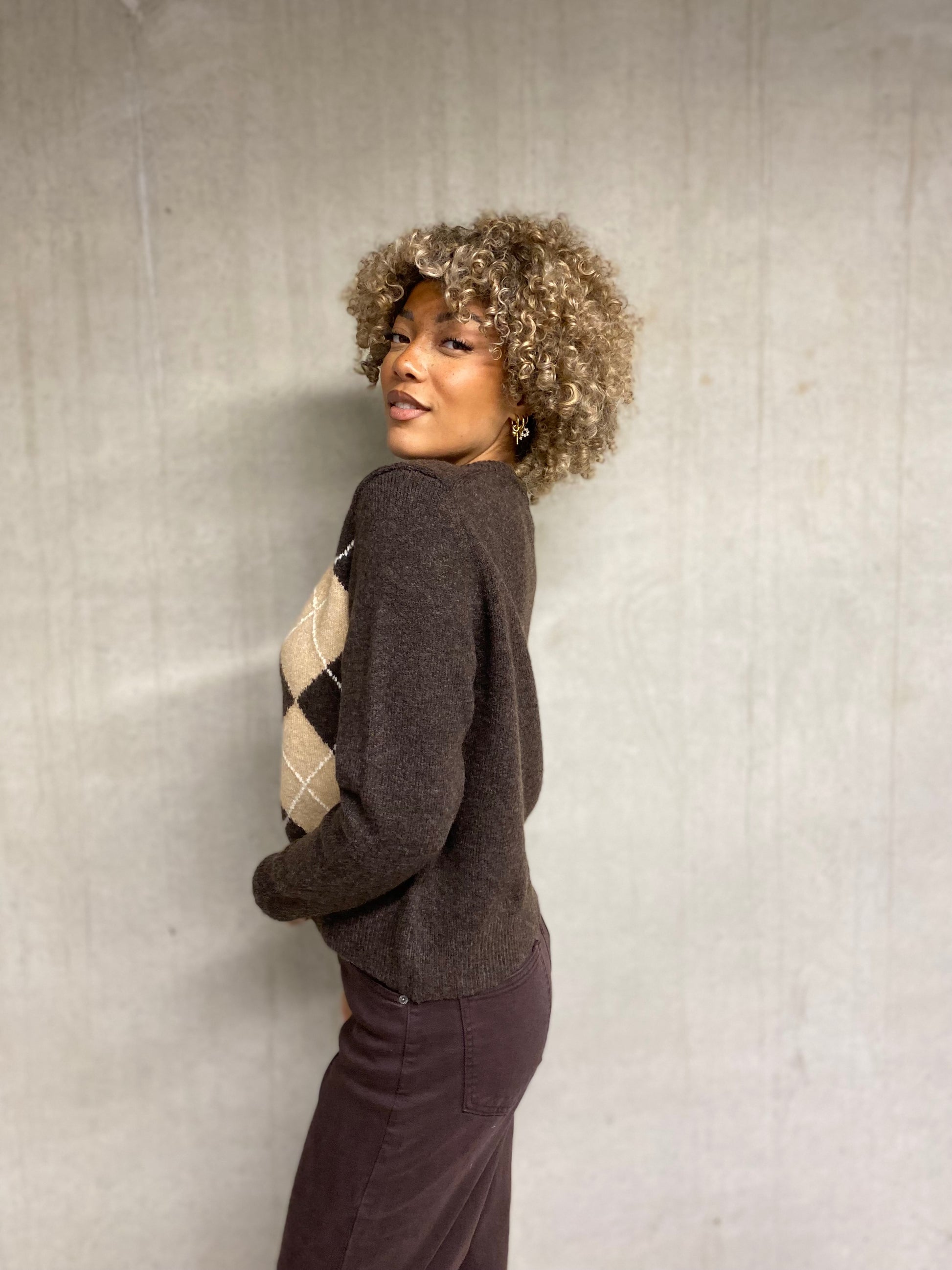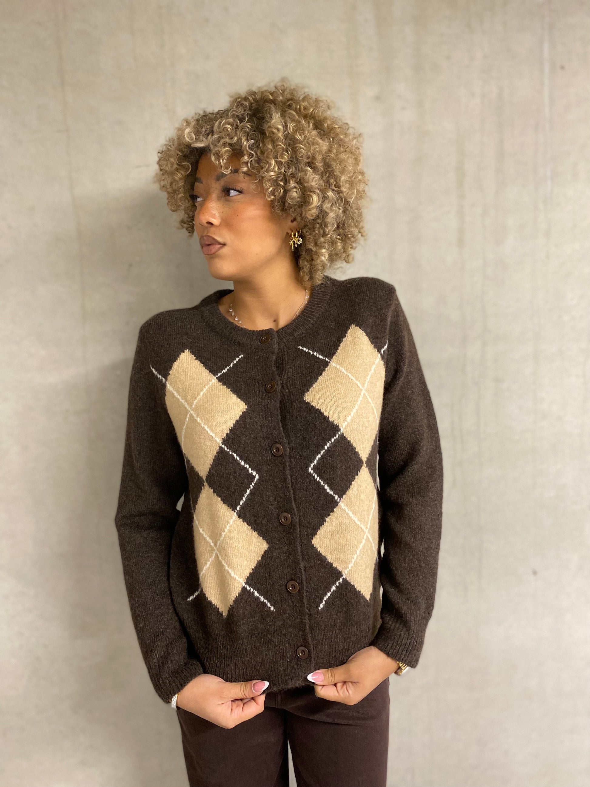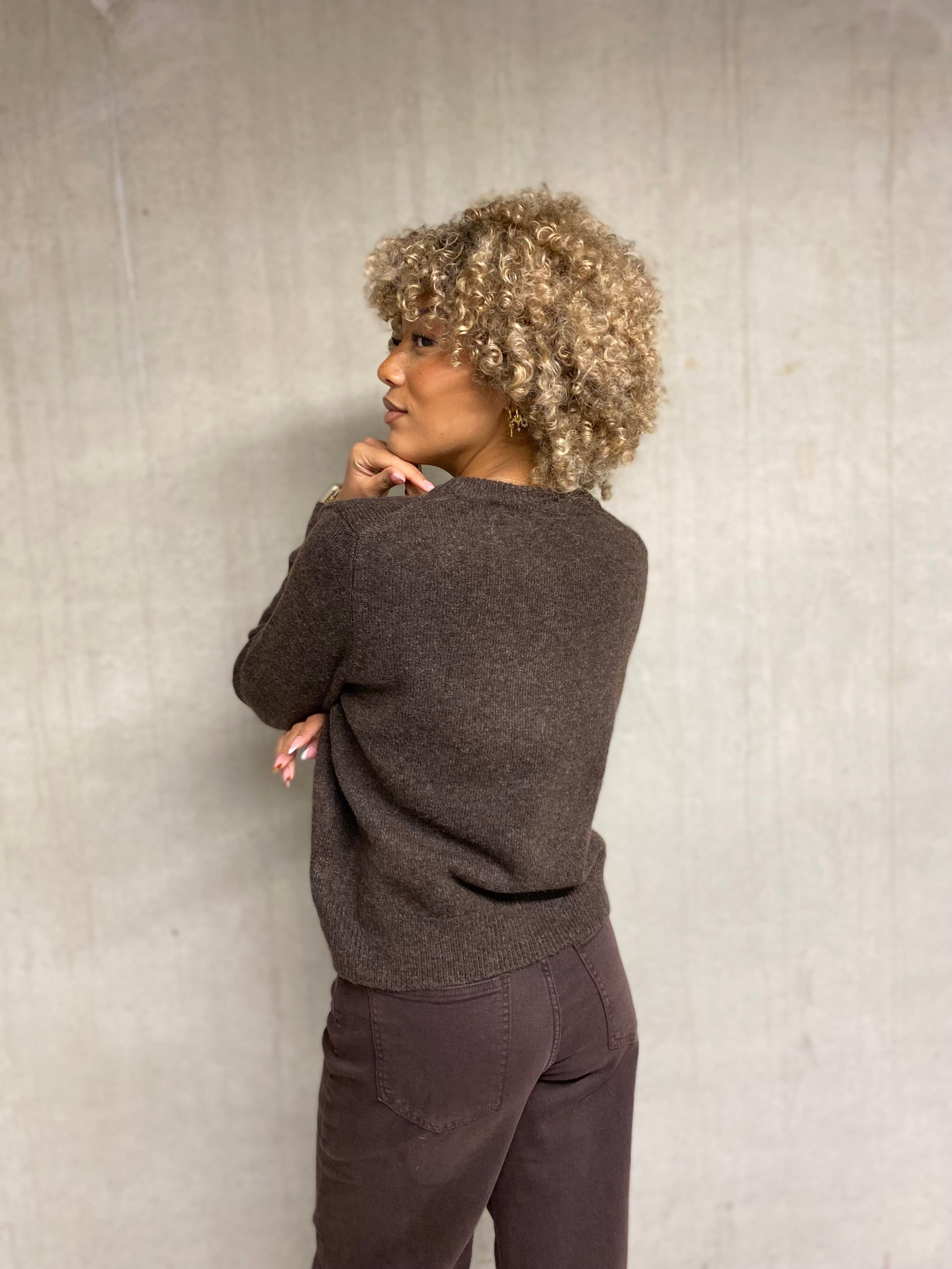 Pull gilet manches longues col rond avec des petits boutons brun la coupe est droite il arrive juste à la taille. Il est brun avec un jar sur le devant beige et une ligne blanche.