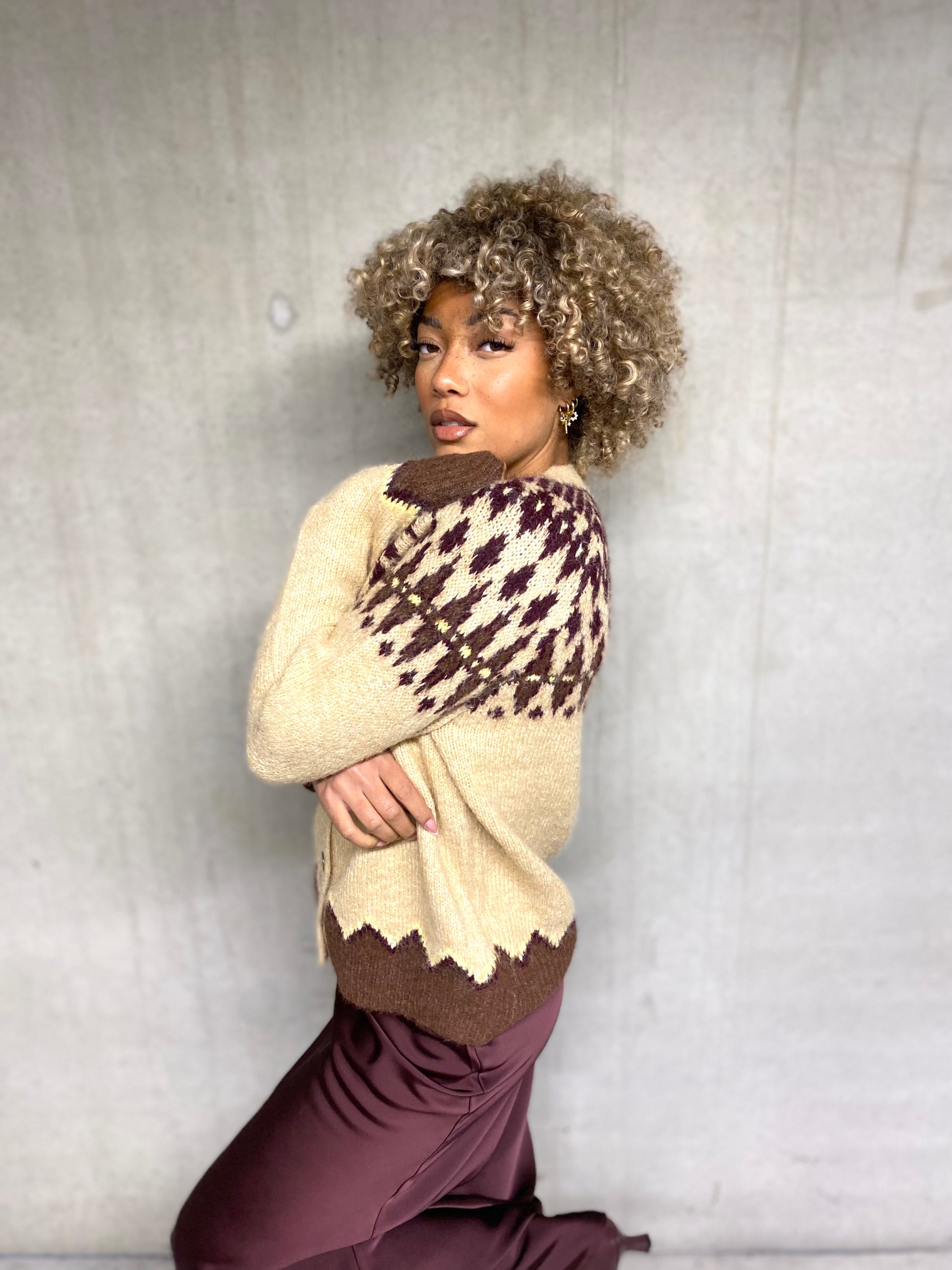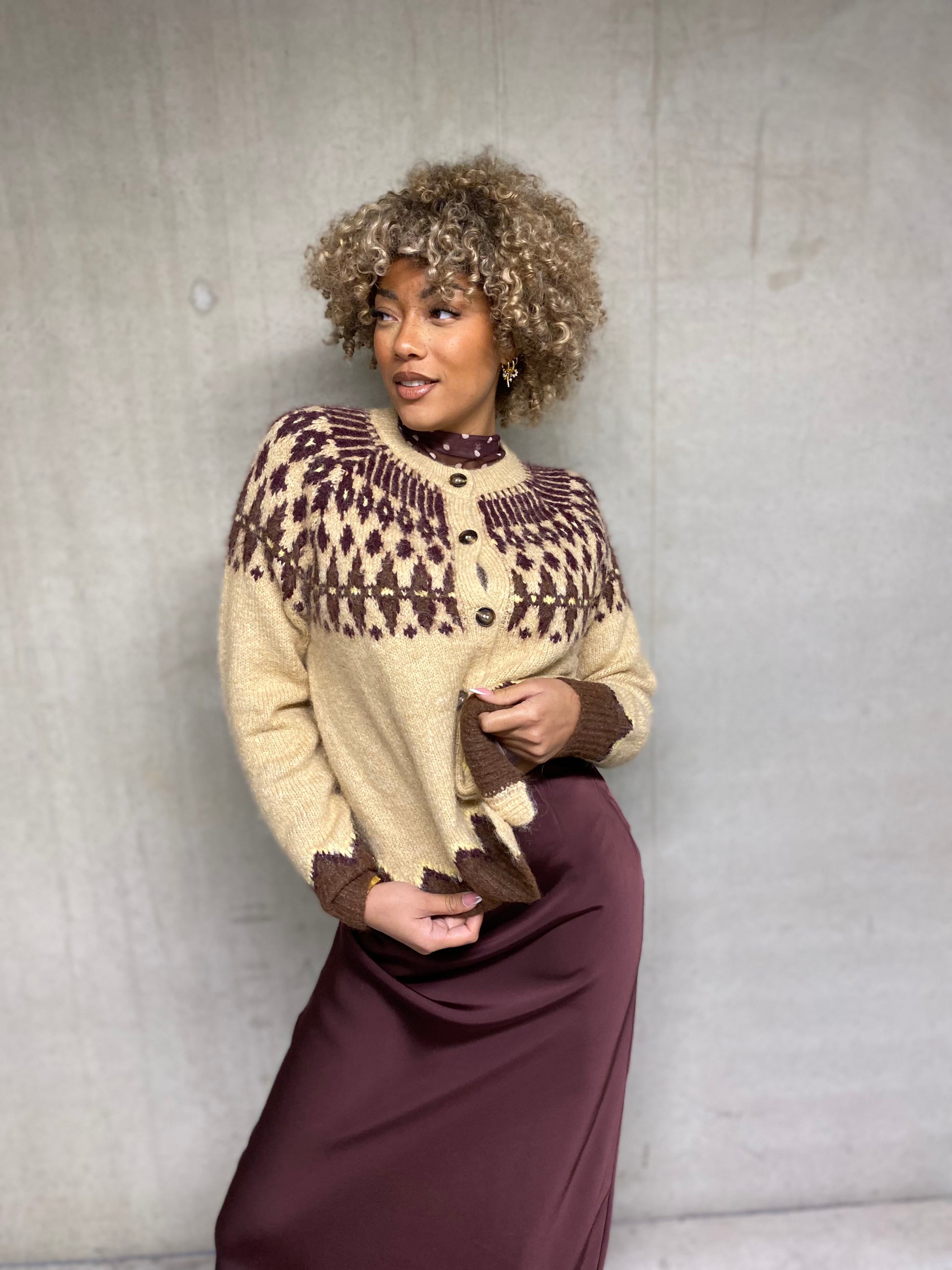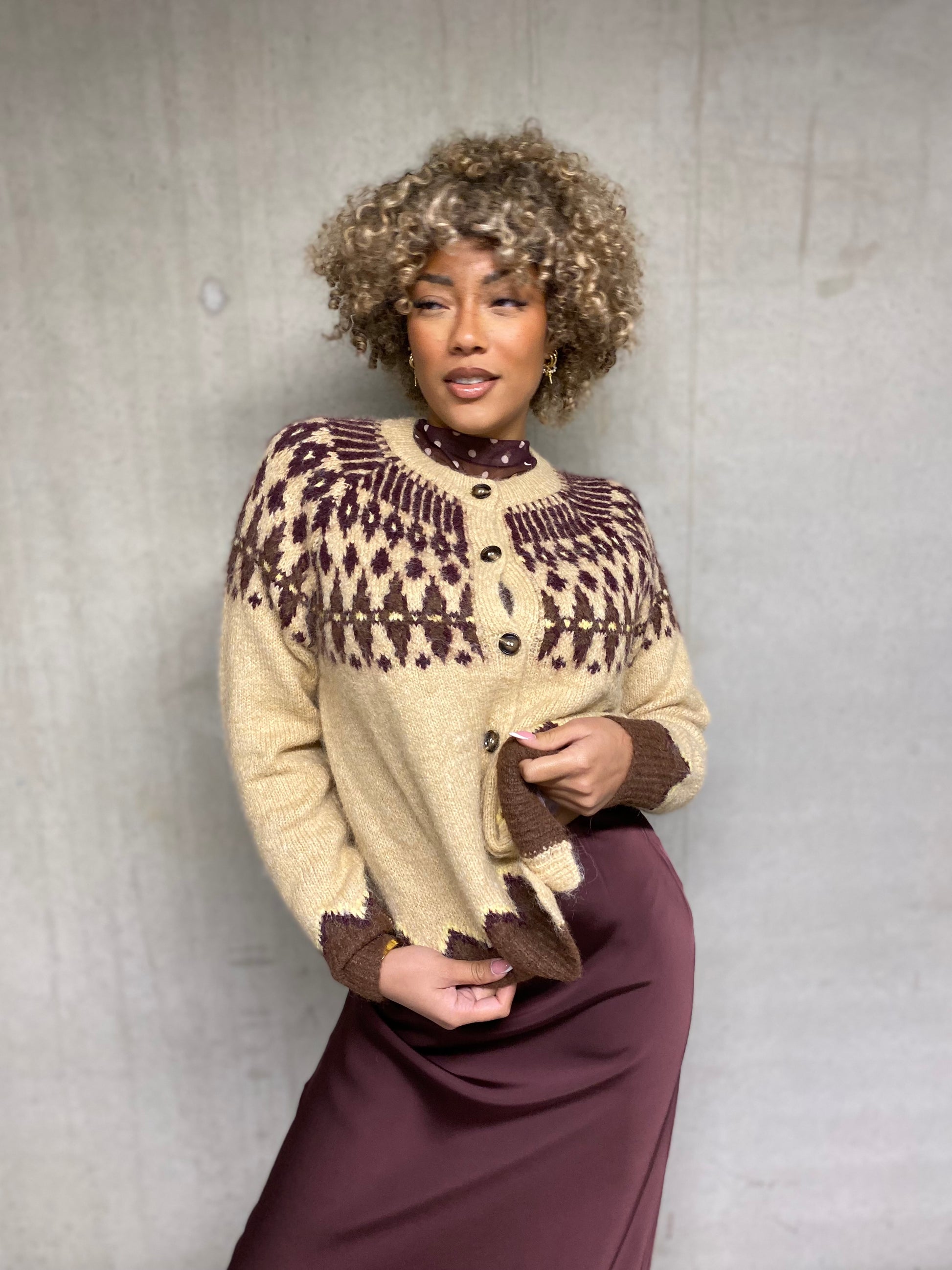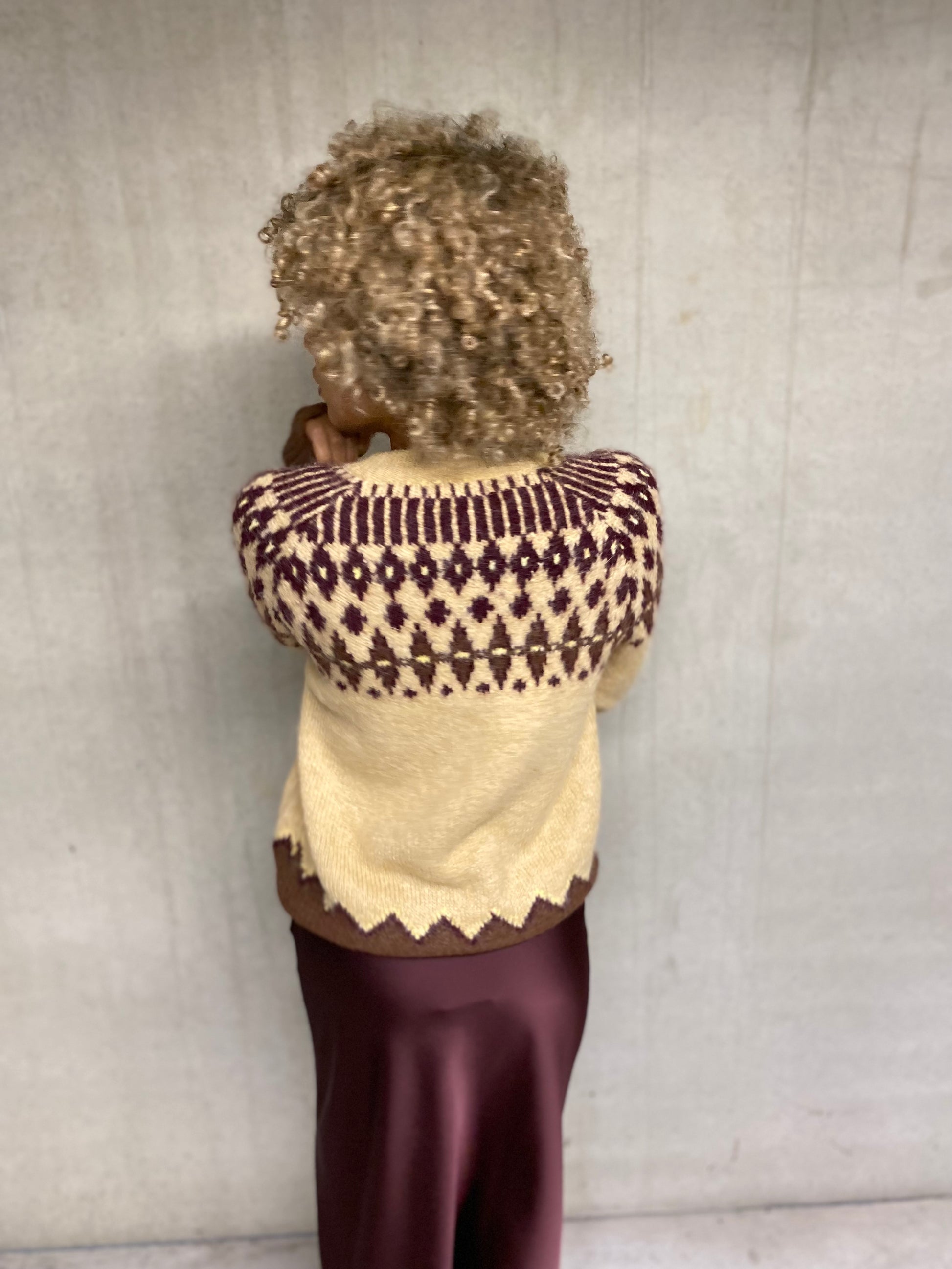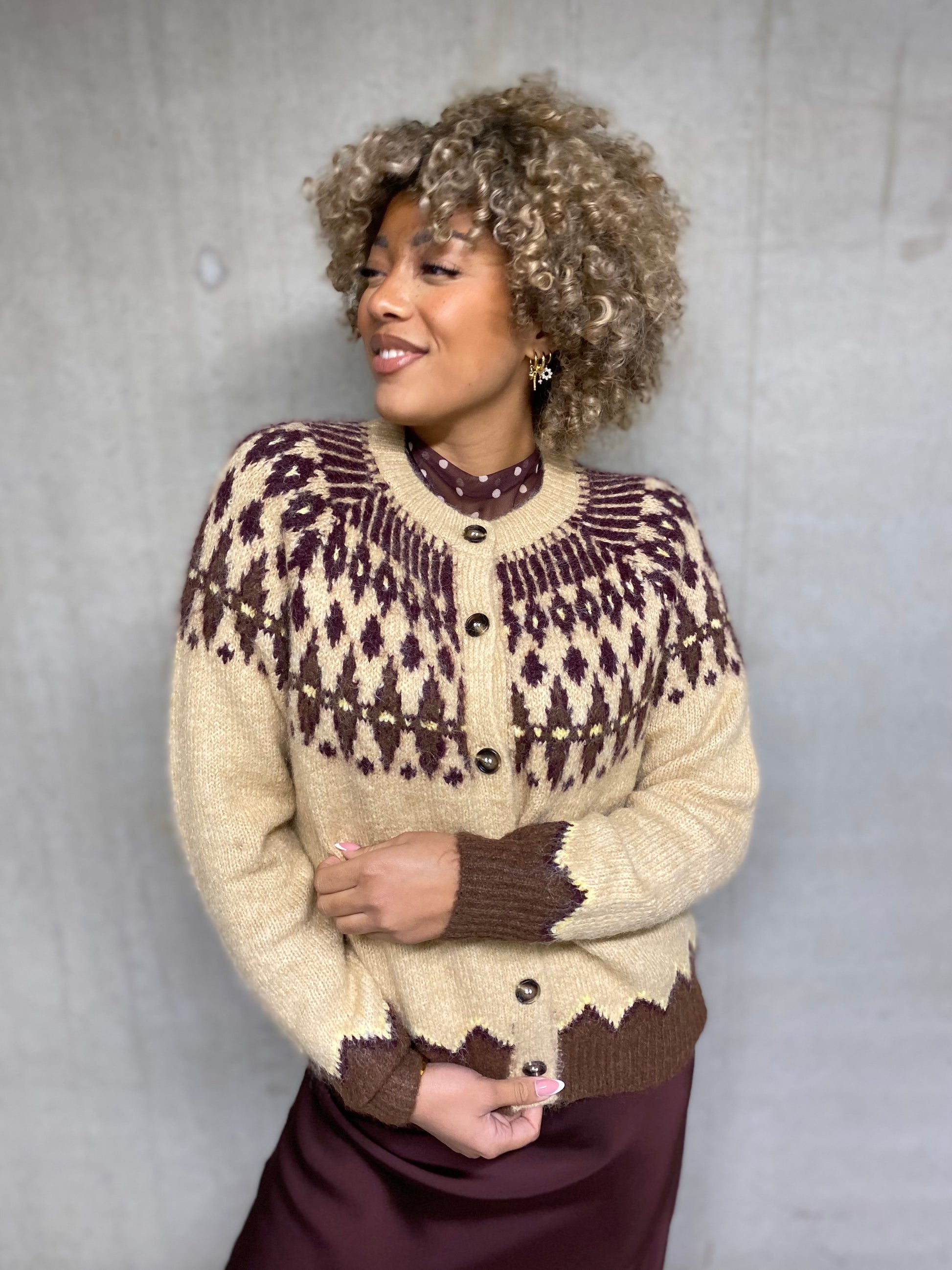 Joli pull, gilet, boutonné col rond manches longues beige avec un imprimé Jacquard bordeaux et brun