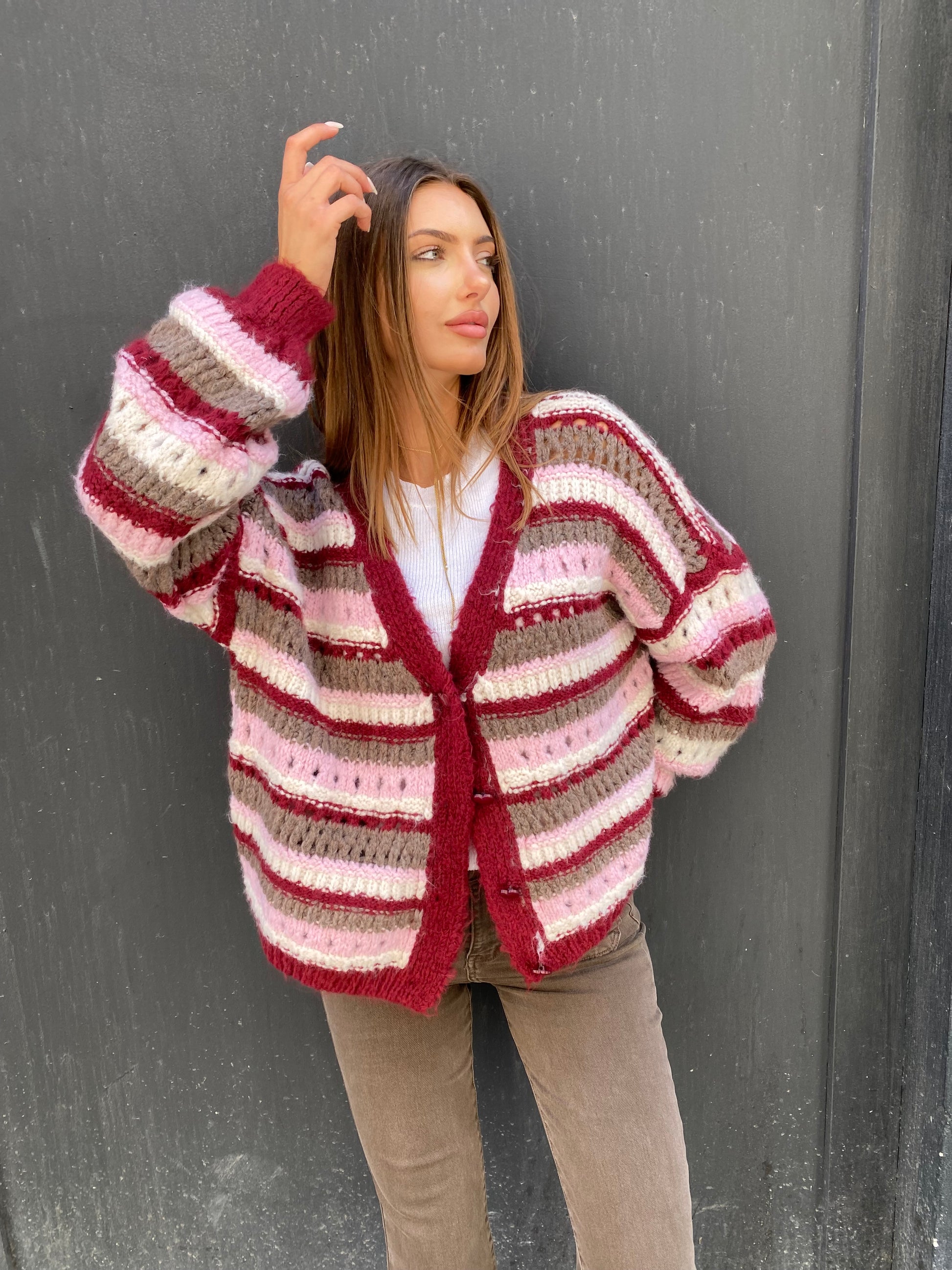 Gilet en lainage qu'elle était toute douce et bien chaud. Assez léger avec différentes couleurs. MODE bordeaux beige.