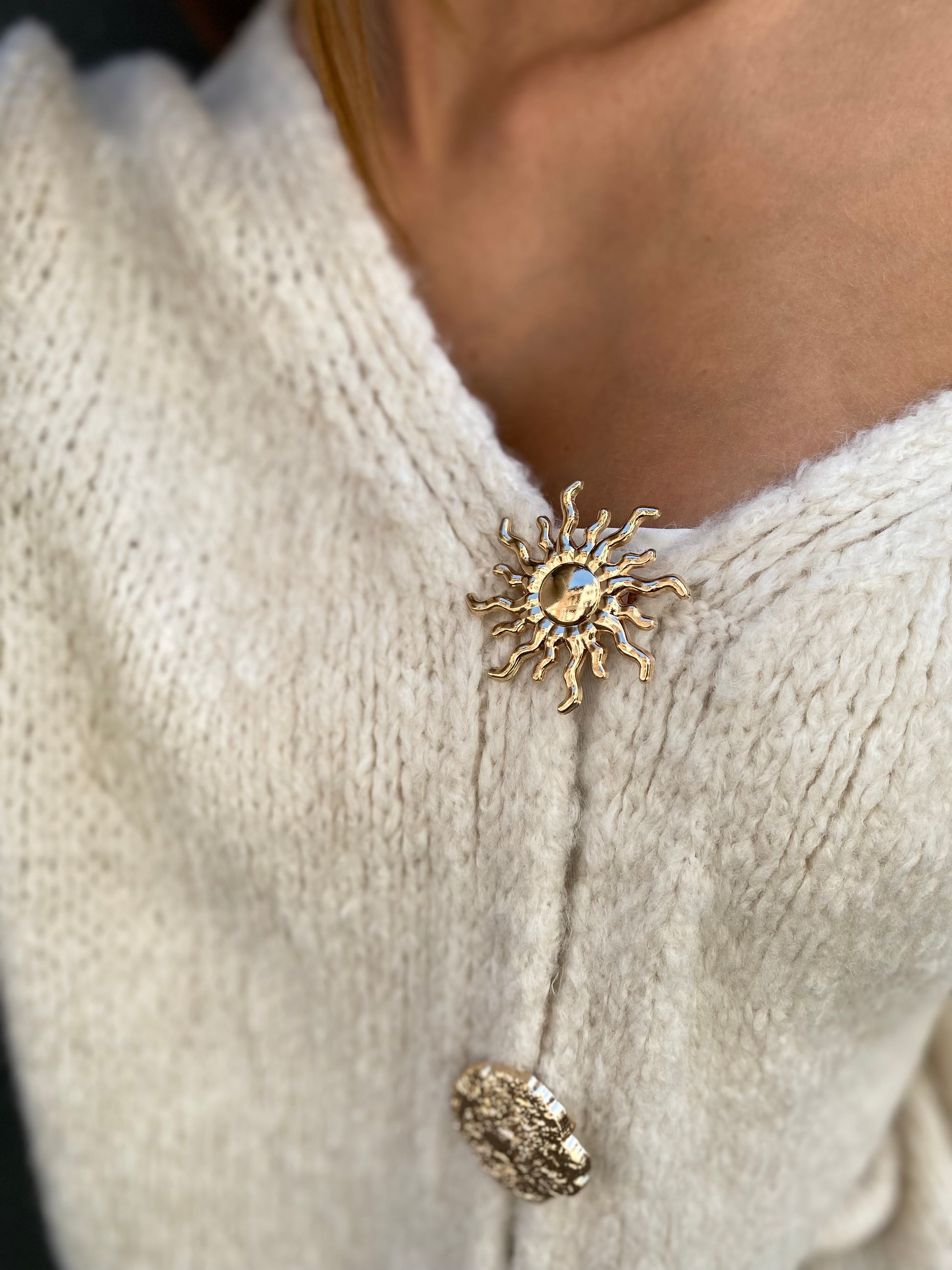Gilet, over size, beige avec des Bouton, bijoux, soleil doré peut se porter dans les deux sens, soit les boutons de devant, soit les boutons à l'arrière