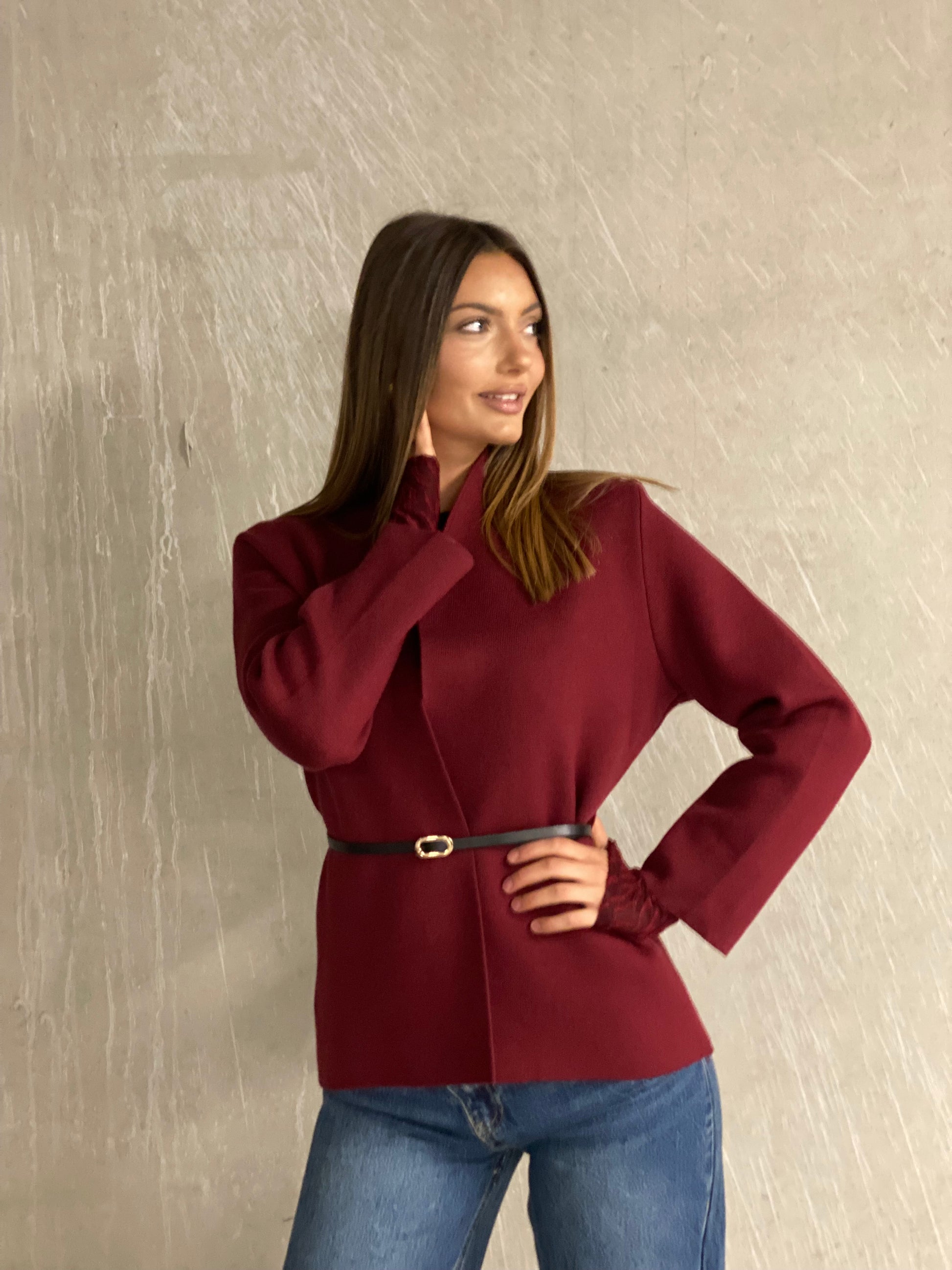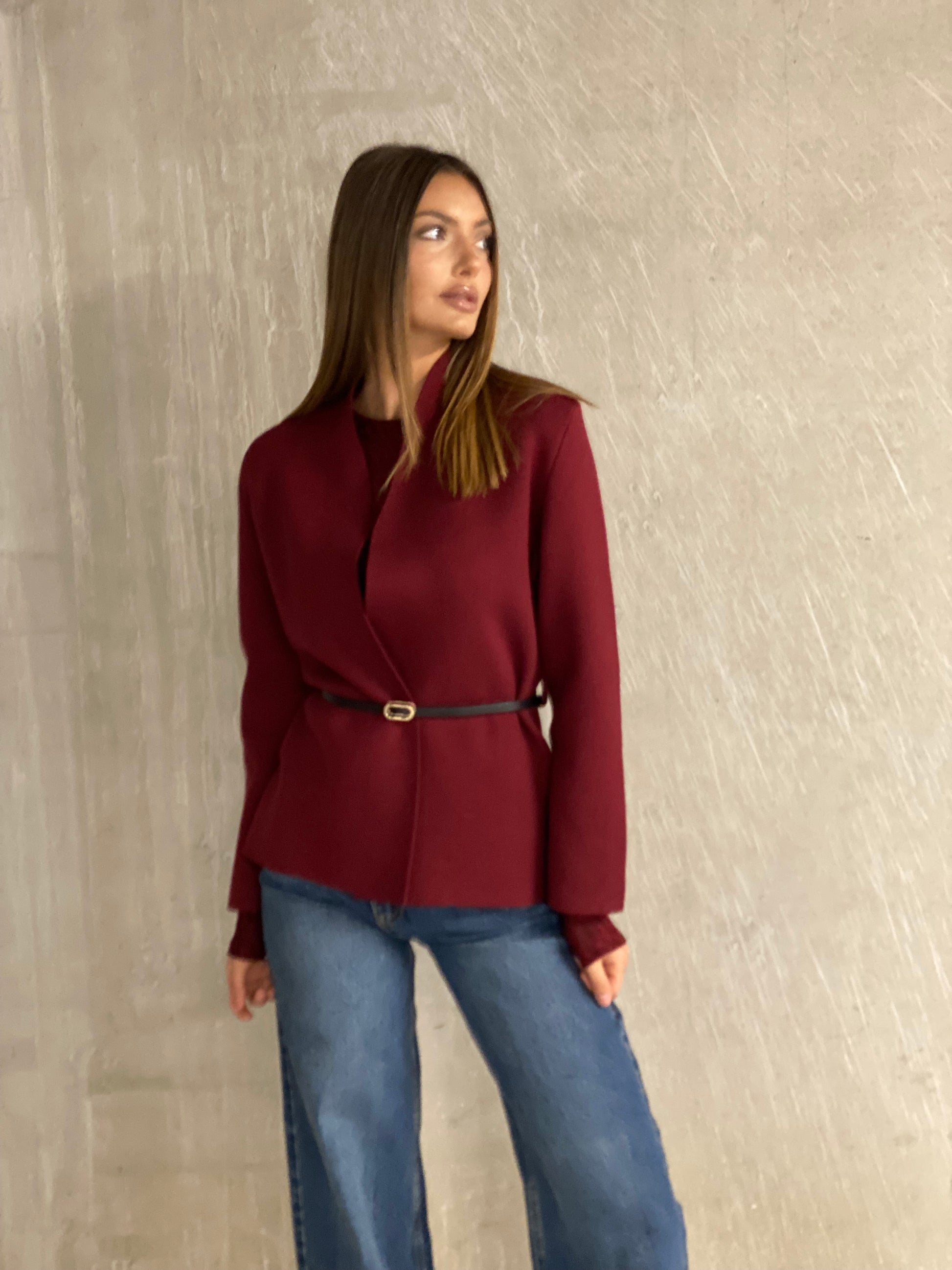 Gilet, matière bien épaisse, couleur bordeaux, col arrondi elle n'a pas de fermeture