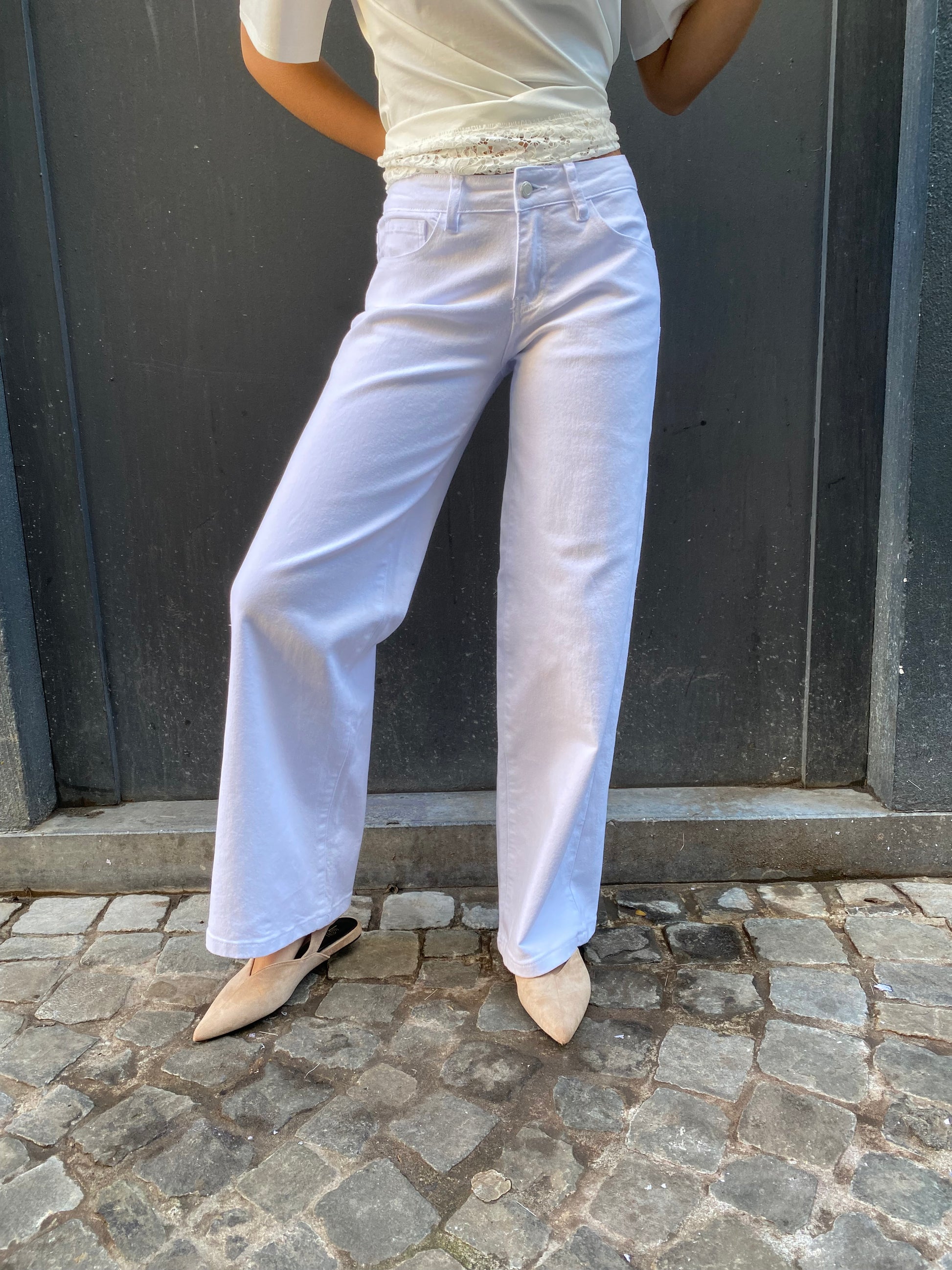 Jeans blanc, coupe droite, les jambes sont un peu larges, la taille est mi basse il est stretch il n'est pas transparent du tout il est hyper confort