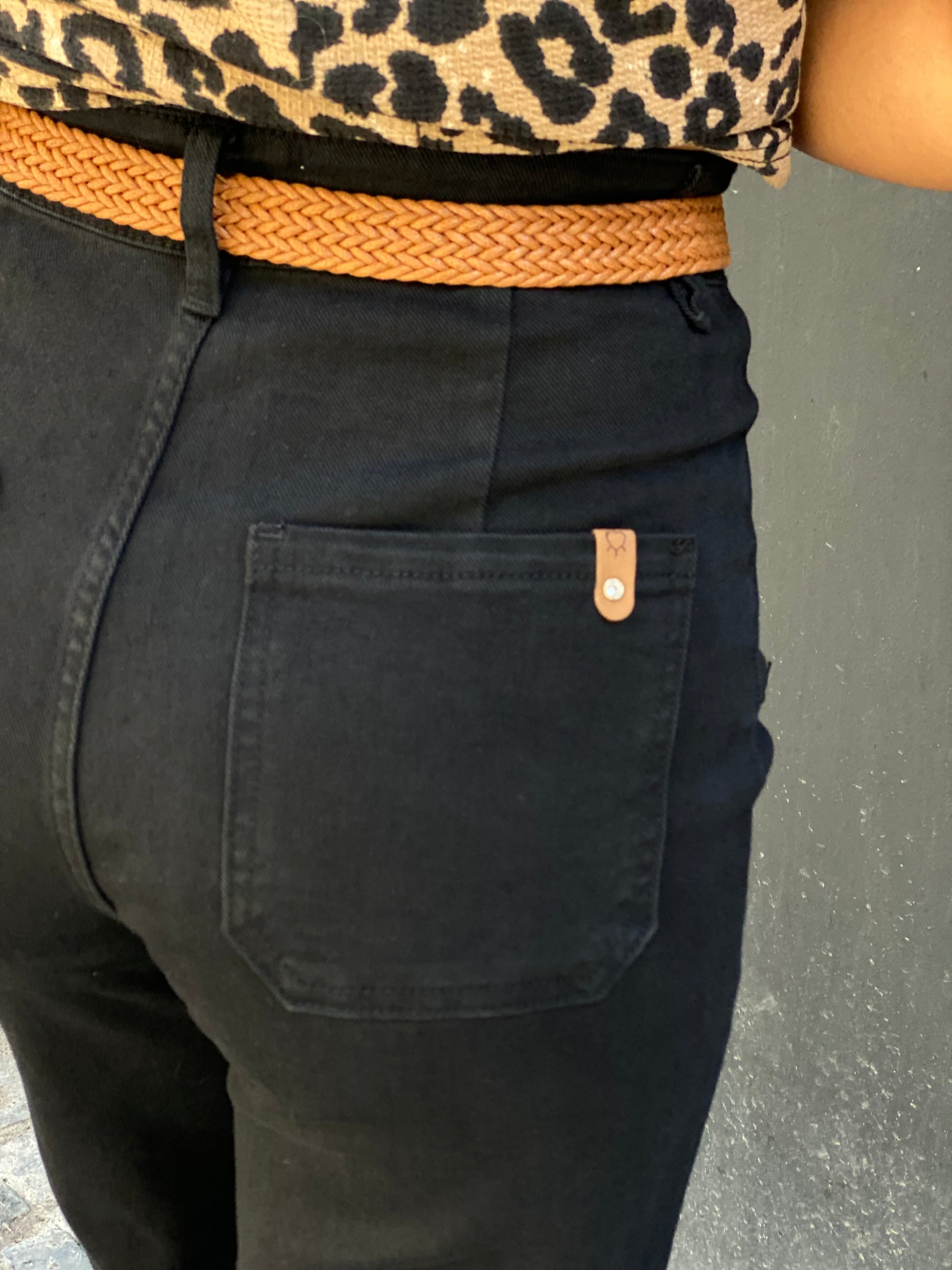 Pantalon en jeans noir, taille haute avec deux coutures au niveau de la taille et deux pinces taille arrière avec une poche et un petit strasse au niveau de la poche. Une ceinture tressé en cadeau coupe large droite. Il se porte un peu sept huitième