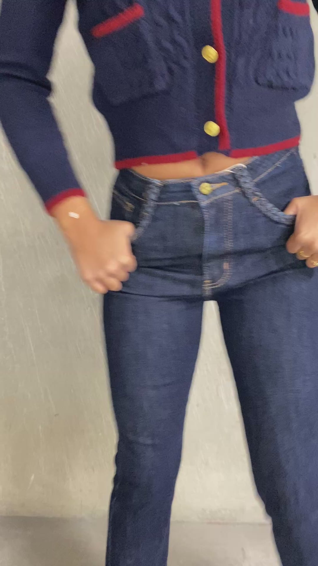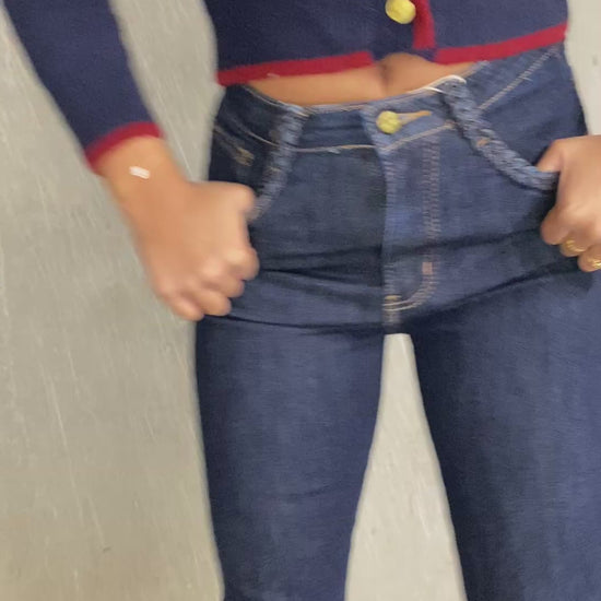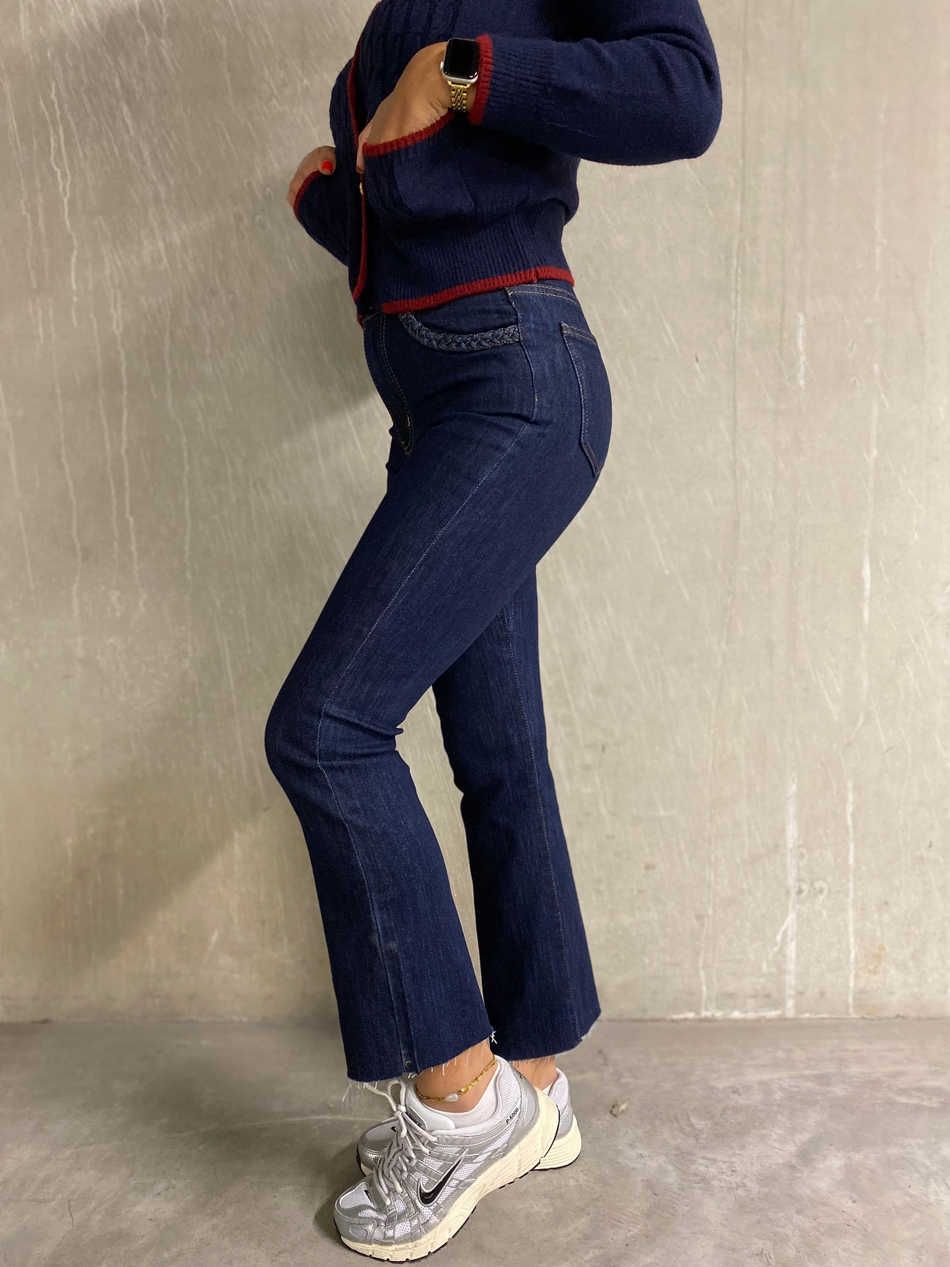 Jeans bleu foncé brut, coupe près du corps, légèrement évasée dans le bas Qui est effiloché