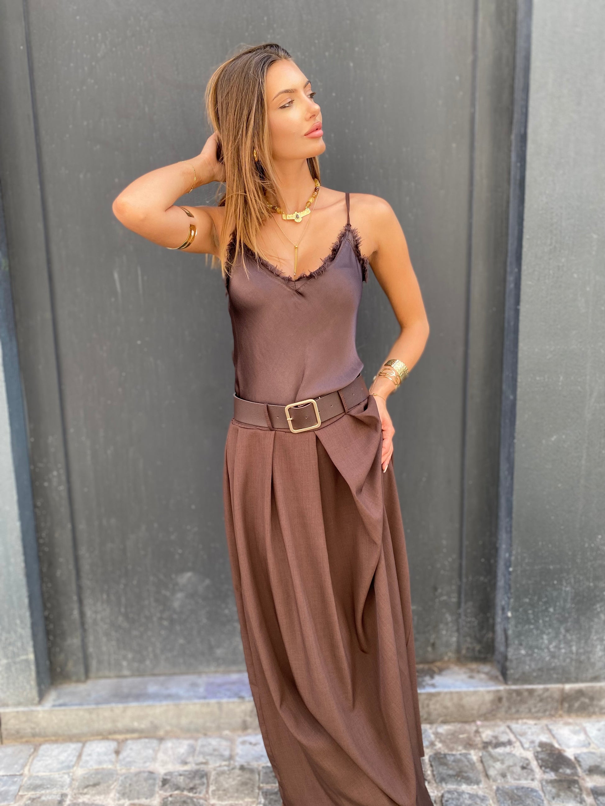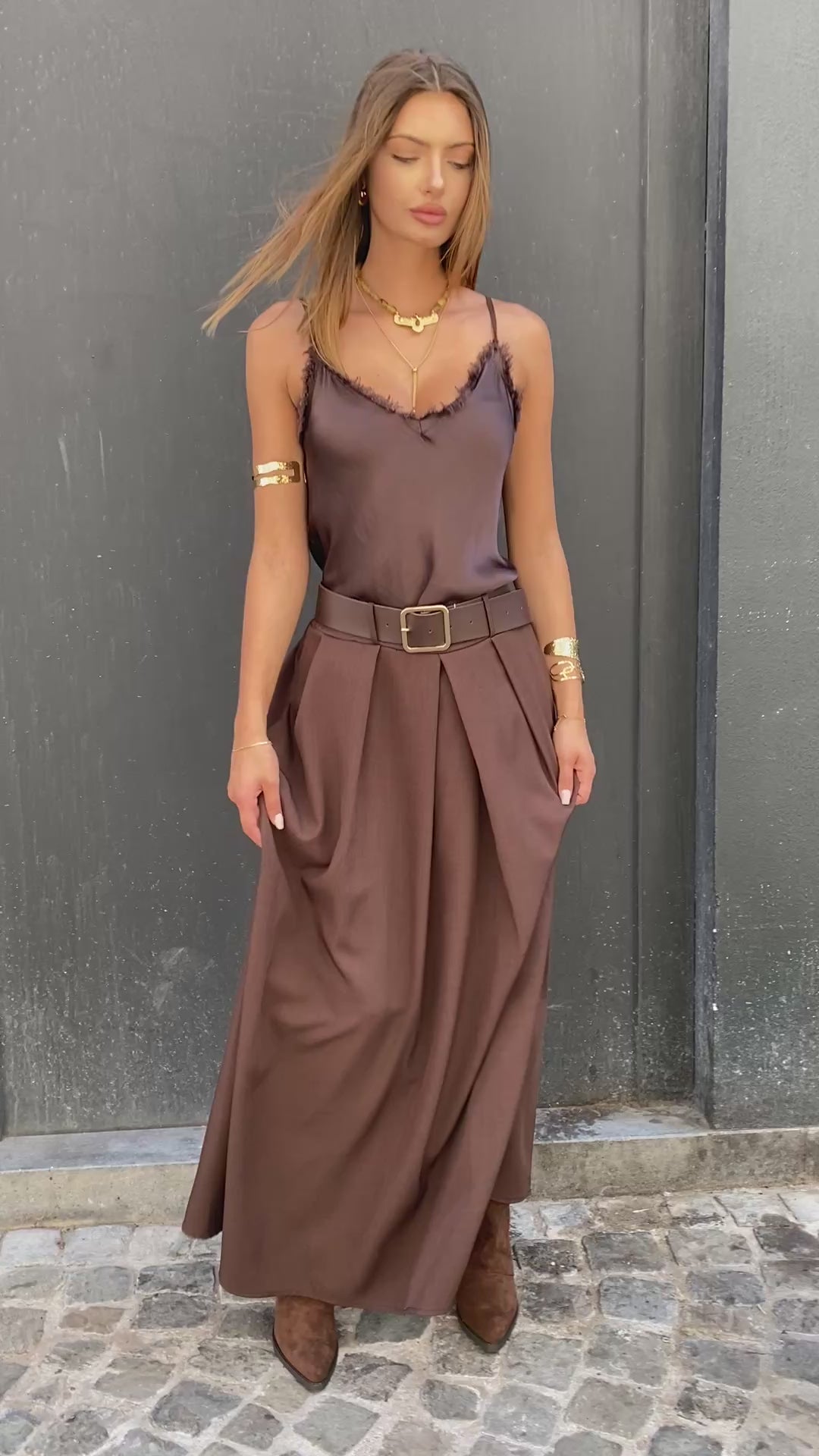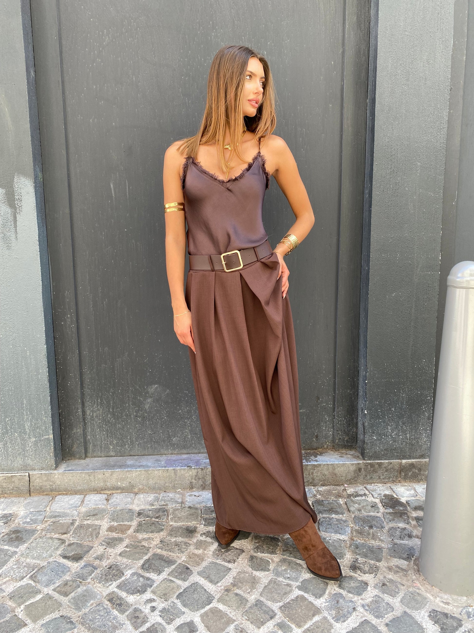 Jupe longue plissé sur l'avant, taille élastique avec une jolie ceinture boucles dorées. La matière est bien épaisse, elle la très beau tombé elle taille assez grande c'est une taille unique.