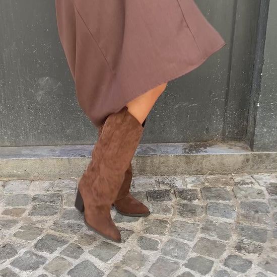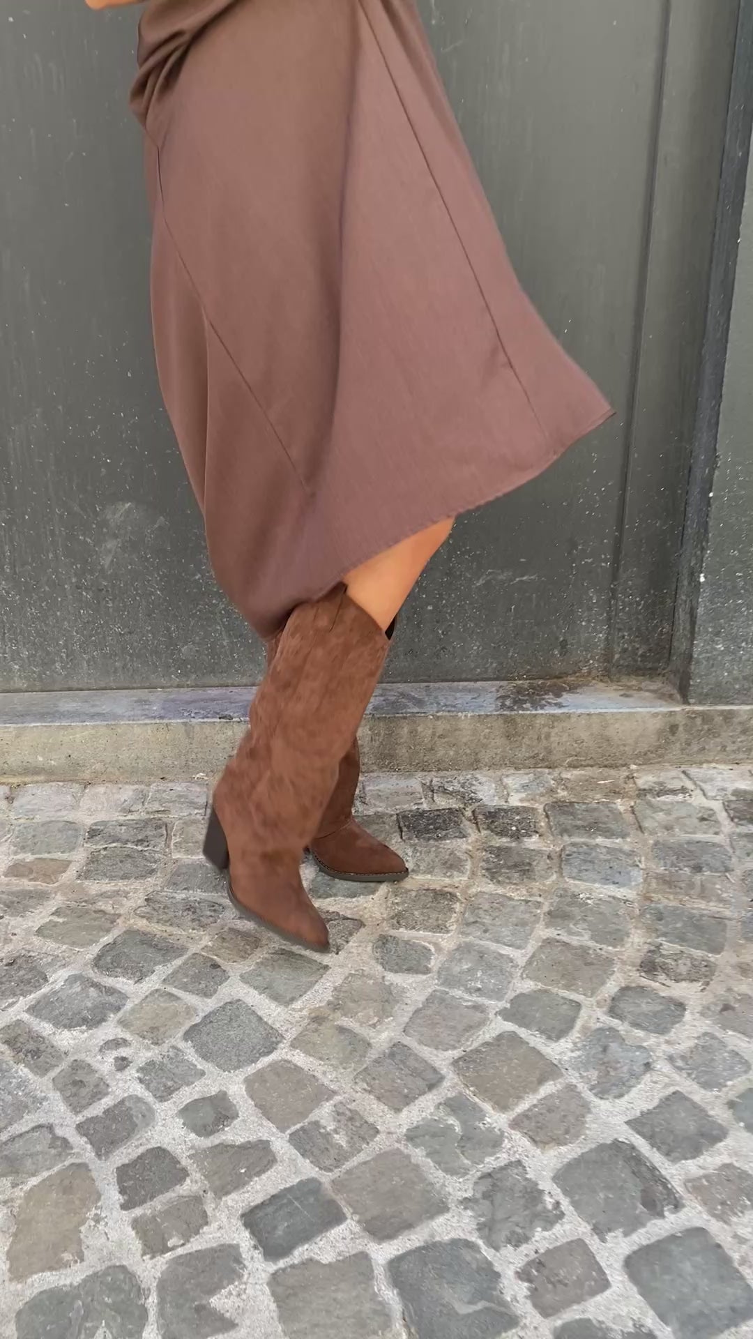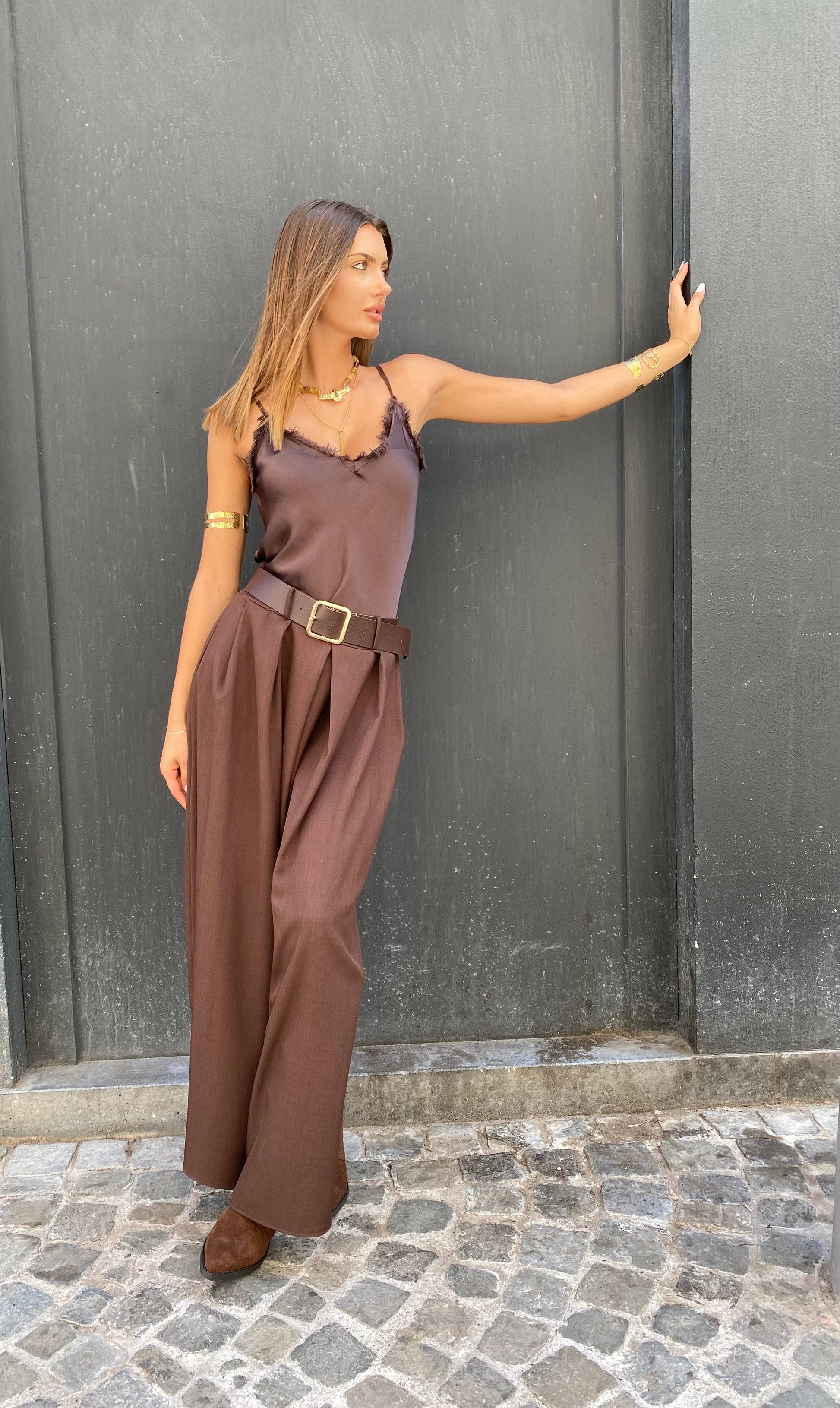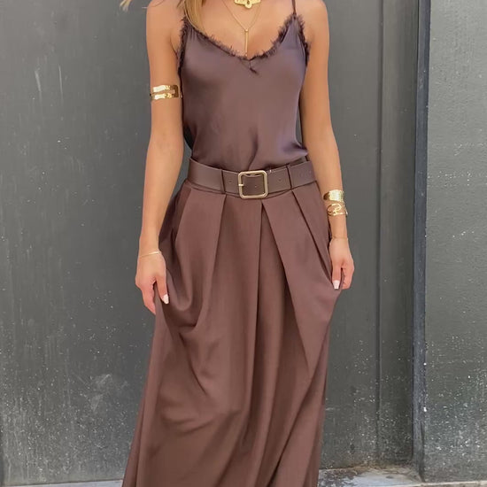 Jupe longue plissé sur l'avant, taille élastique avec une jolie ceinture boucles dorées. La matière est bien épaisse, elle la très beau tombé elle taille assez grande c'est une taille unique.