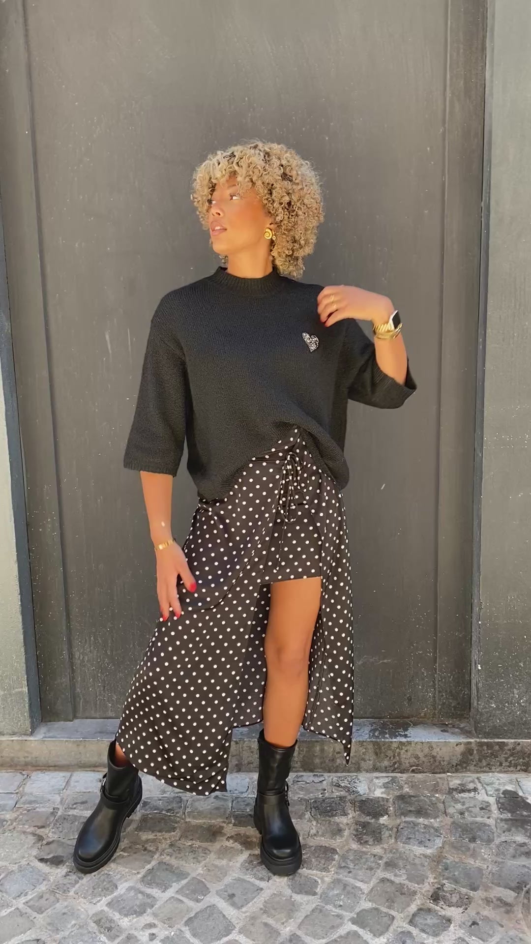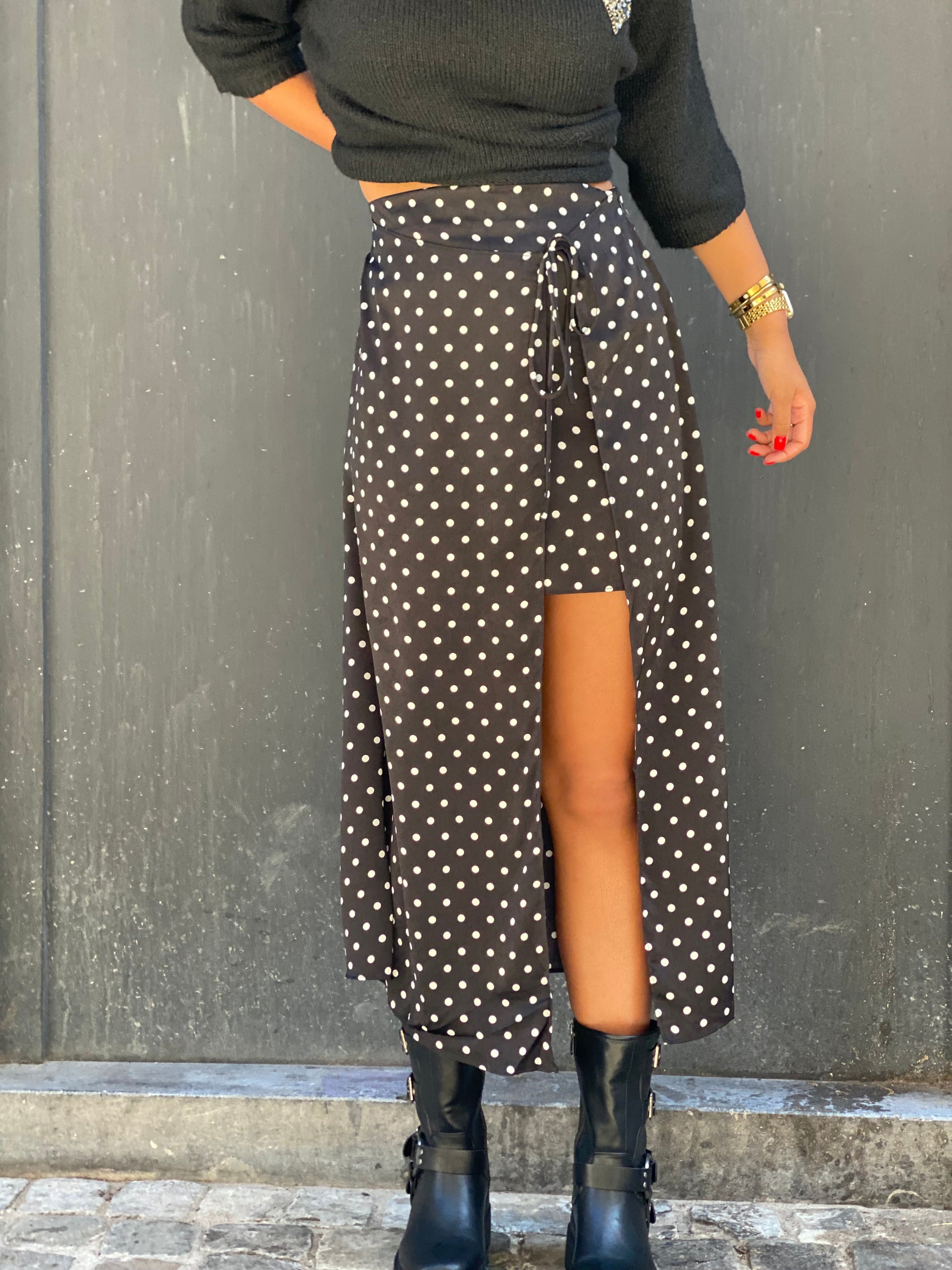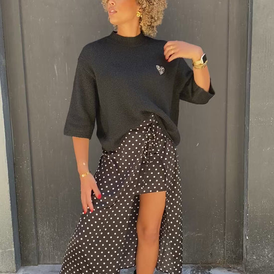 Jupe noire, à petits pois blanc mi long