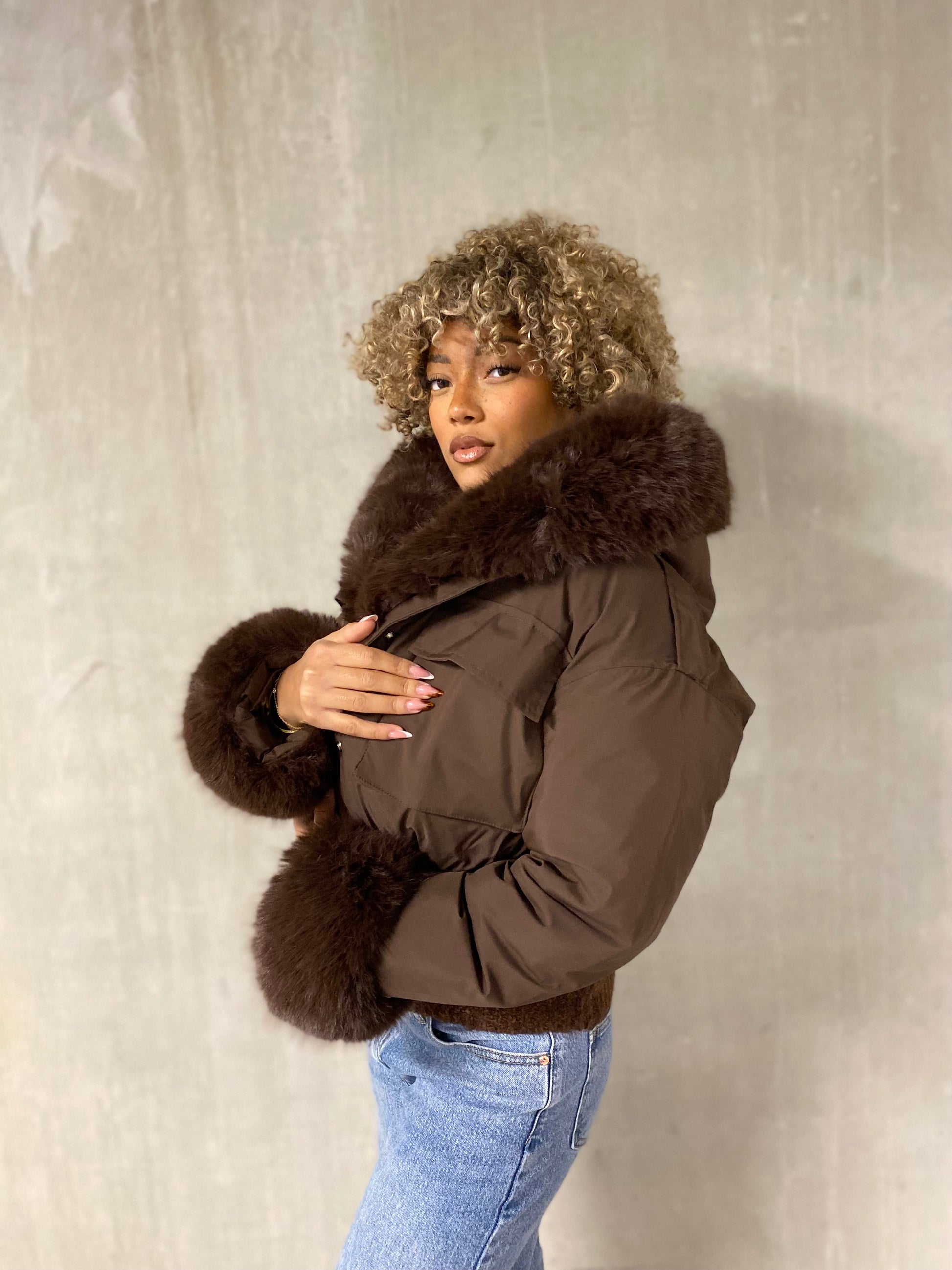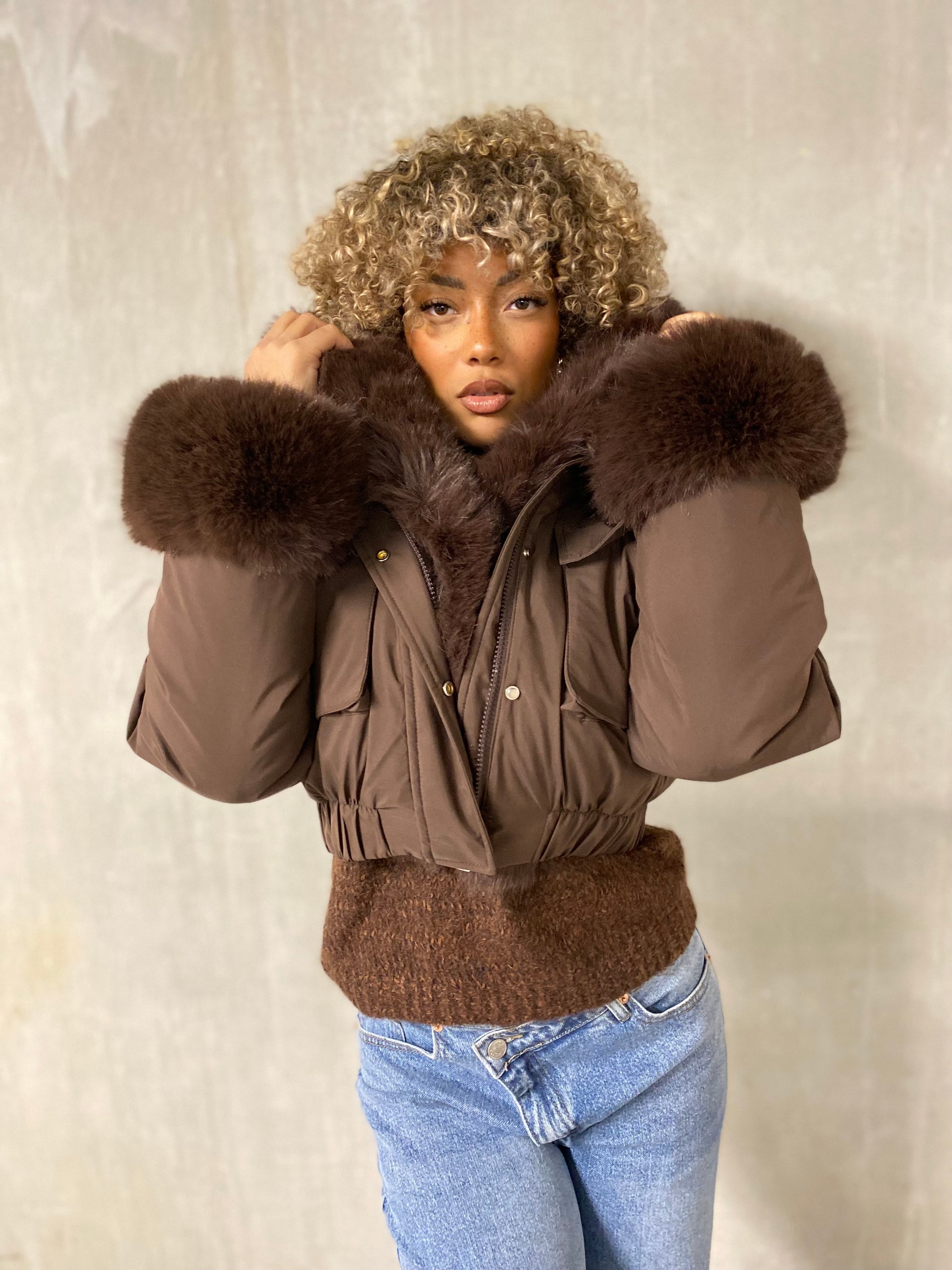 Veste doudoune courte, bien épaisse, très chaude avec des poches repris à la taille par un élastique et une très belle fausse fourrure qui contourne la La veste et la capuche