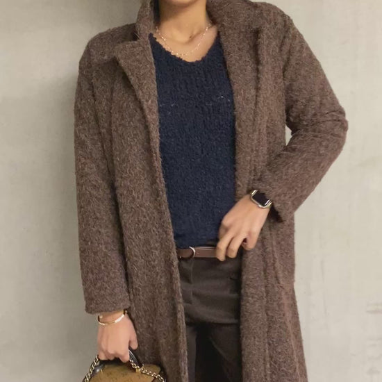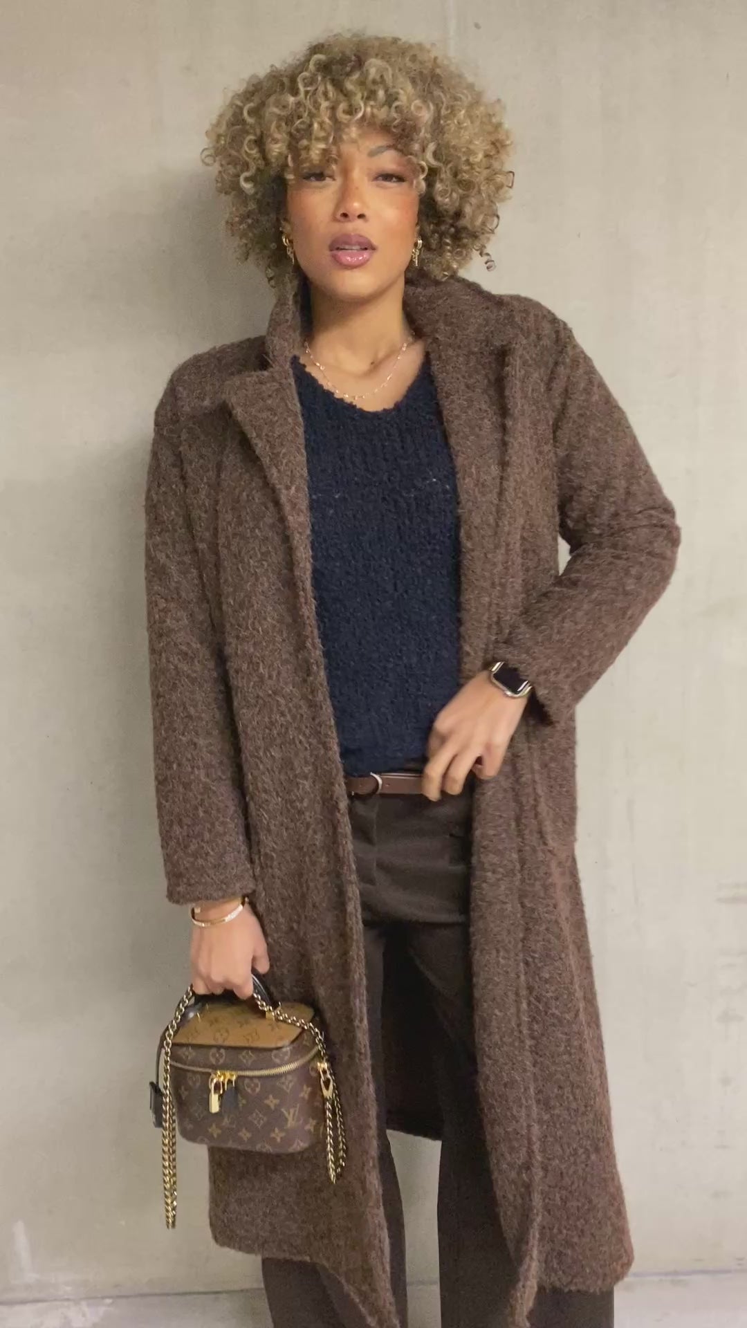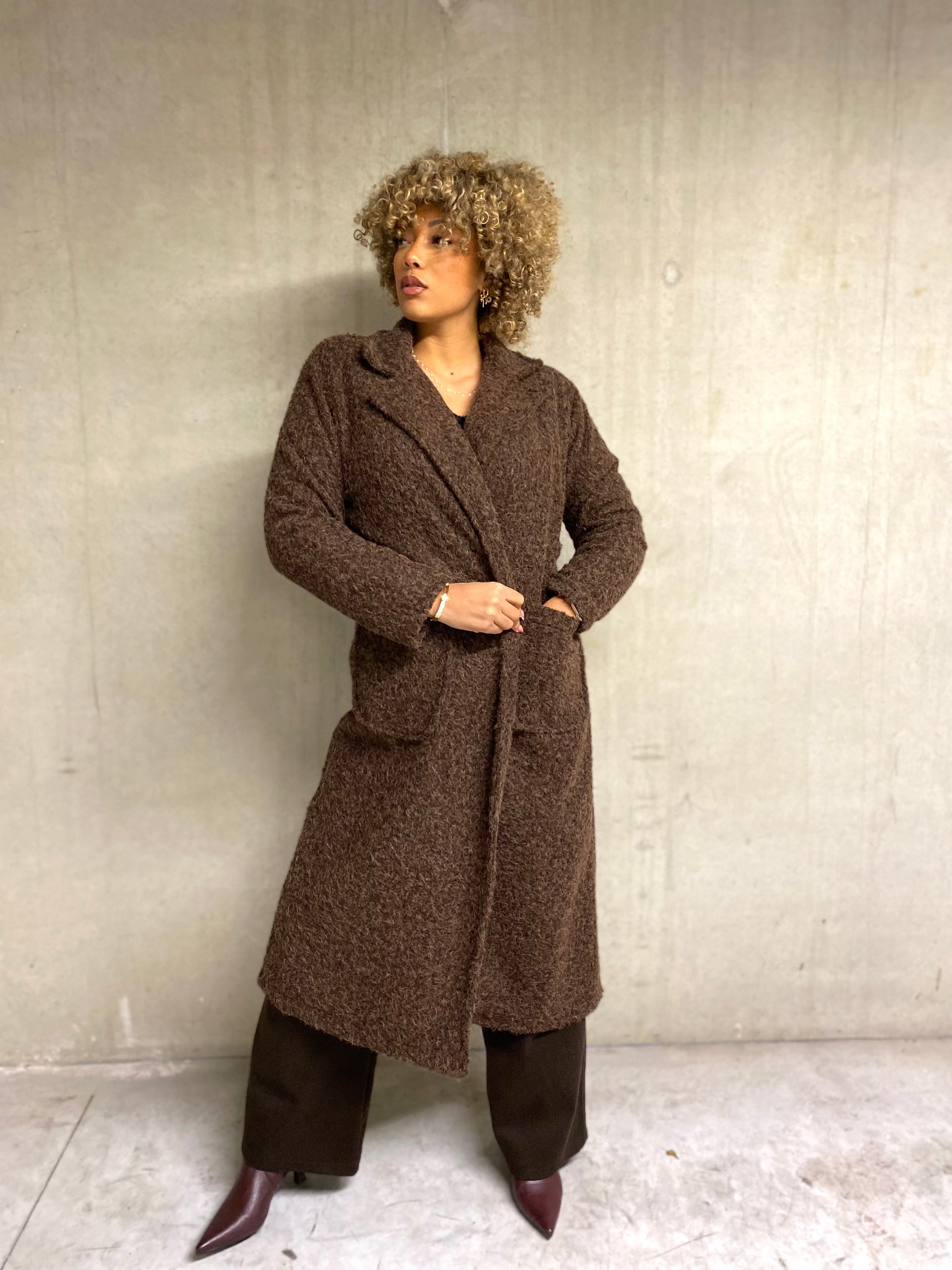 Manteau long en matière façon laine bouillie, doté de deux grandes poches pratiques. Il est fourni avec une ceinture pour le porter ouvert ou ajusté selon vos envies. Taille unique, chaud et élégant pour toutes vos tenues d’hiver.