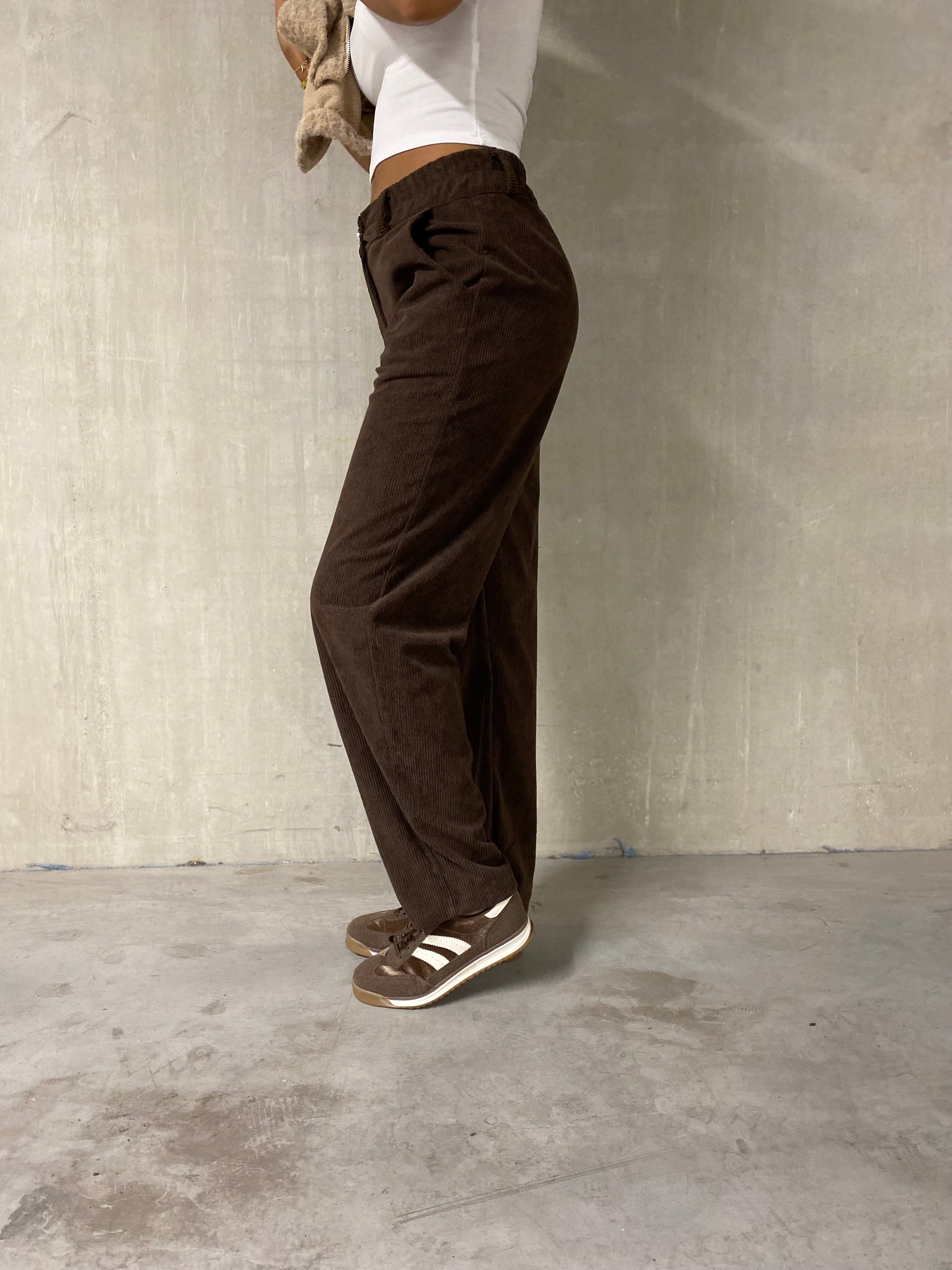Bras Chocolat, taille élastique avec des passants, deux poches, la coupe est droite, large, légèrement resserrer dans le bas