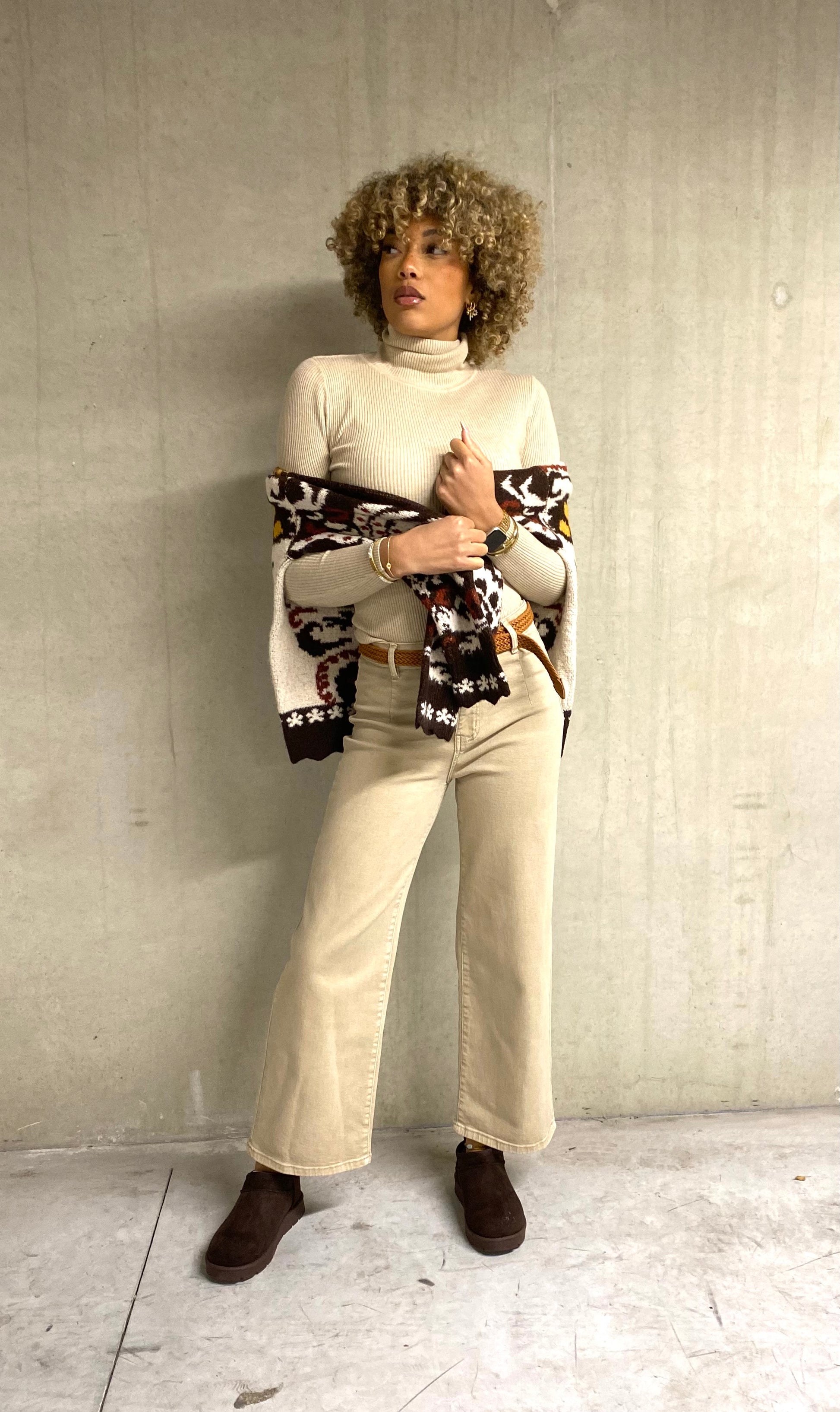 Pantalon beige en denim coton, taille haute et coupe 7/8, doté d’une matière ultra-élastique pour un confort absolu. Il possède des poches arrière et est accompagné d’une ceinture tressée camel. Une pièce agréable à porter et facile à associer au quotidien.