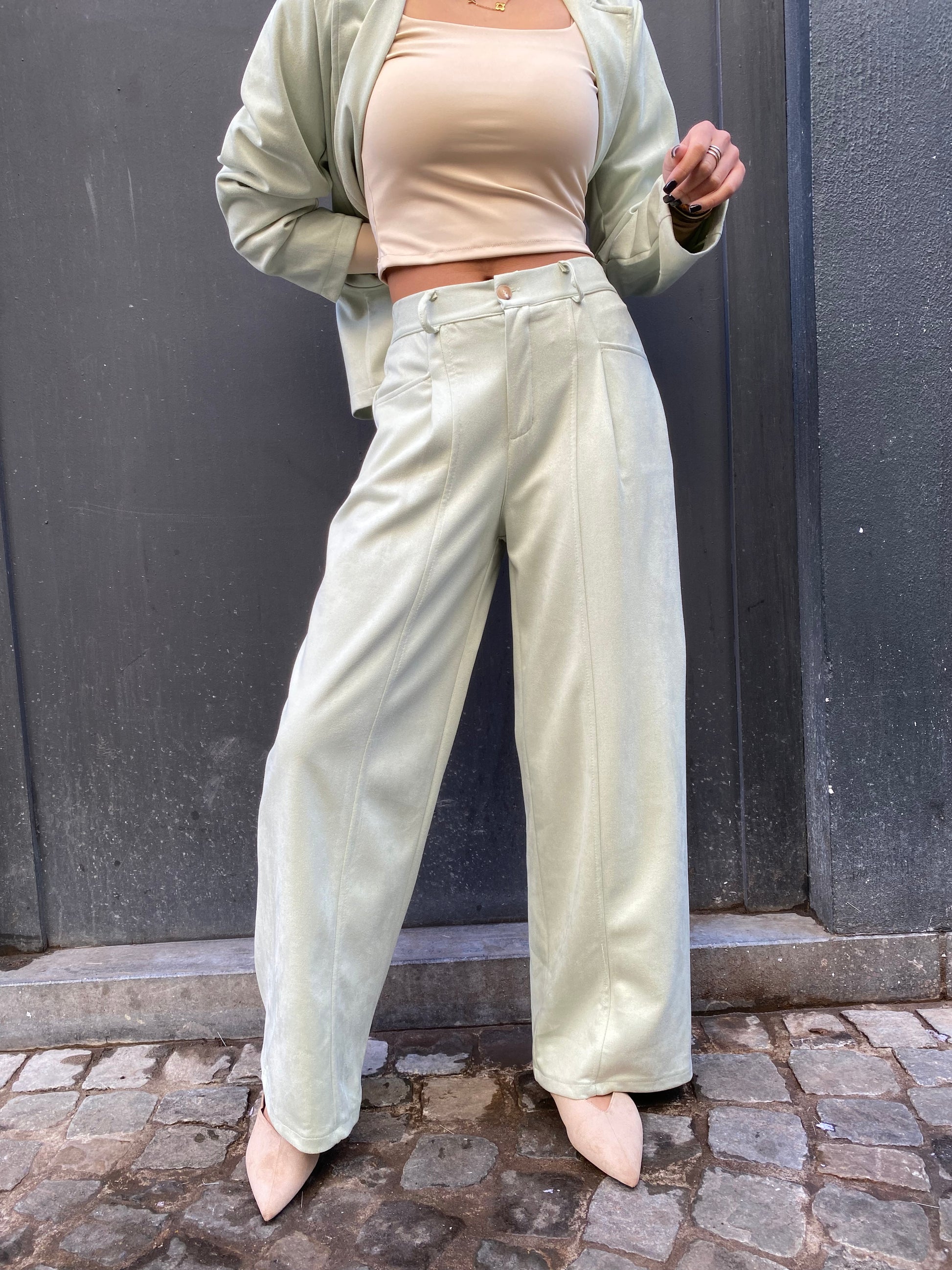 Pantalon en matière suédine esprit daim, au toucher doux et à l’allure raffinée. Décliné dans un magnifique coloris vert menthe / vert eau, une teinte fraîche et ultra tendance qui illumine instantanément la silhouette.