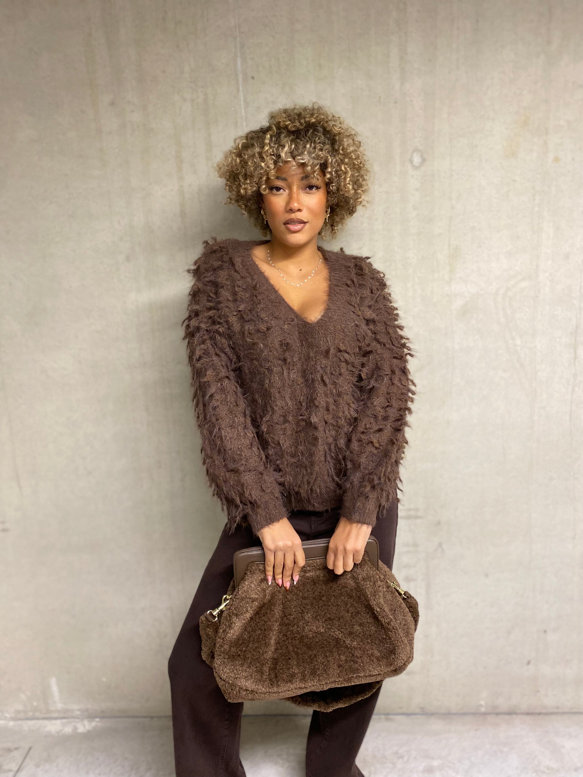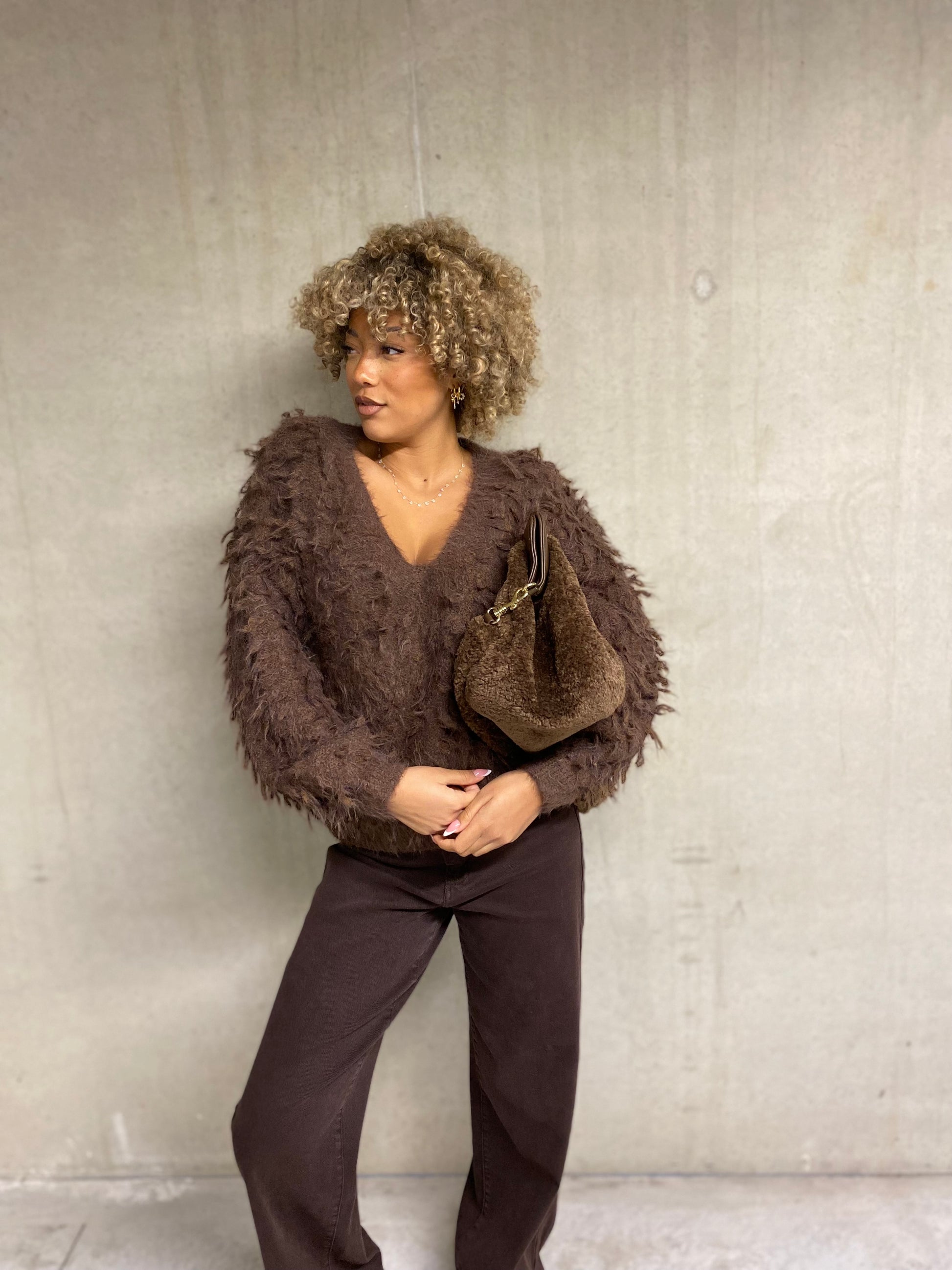 Magnifique, pull colle en V coupe droite, arrive à la taille d'une matière très agréable en lainage avec un relief de lainage qui dépasse