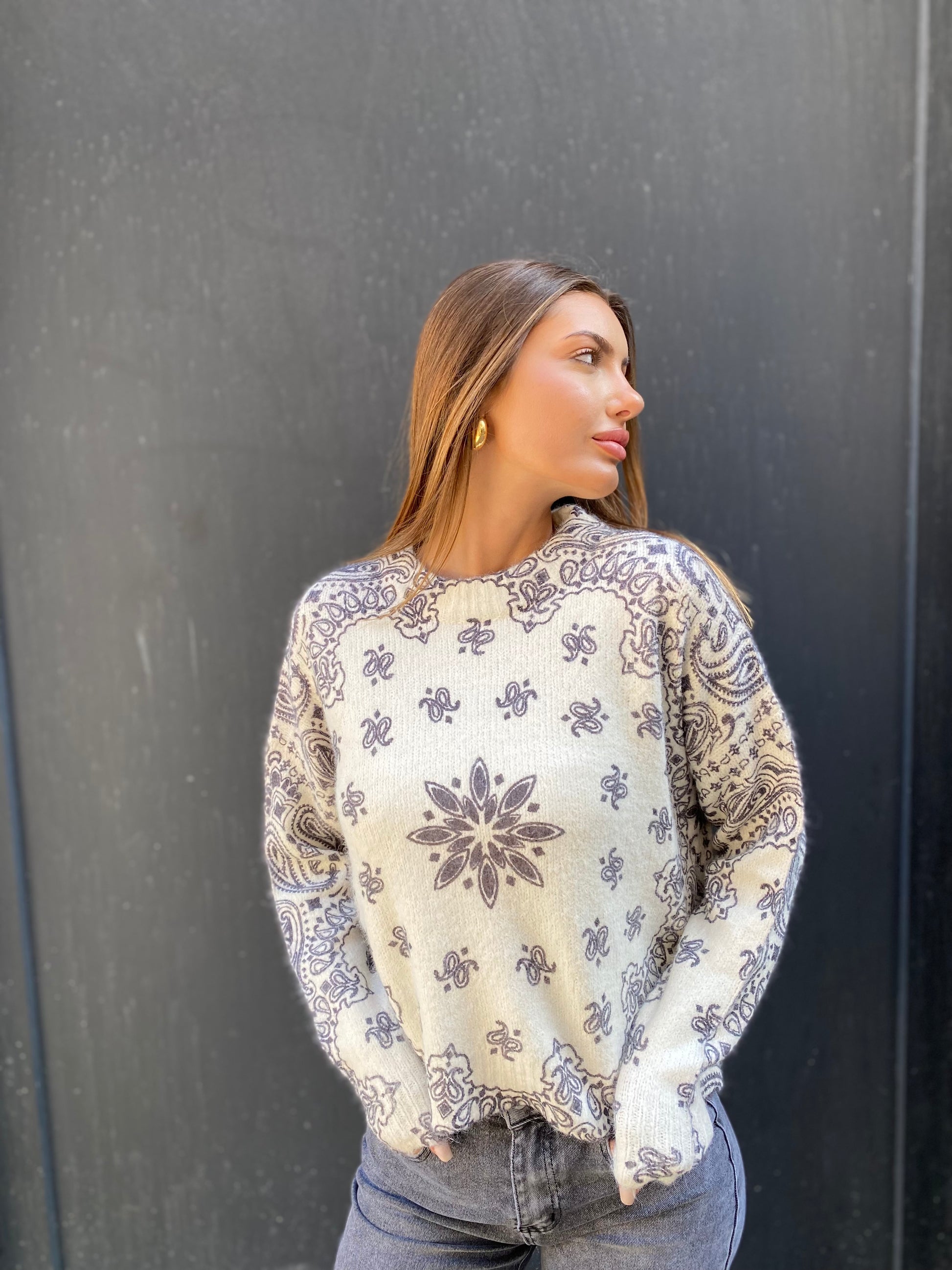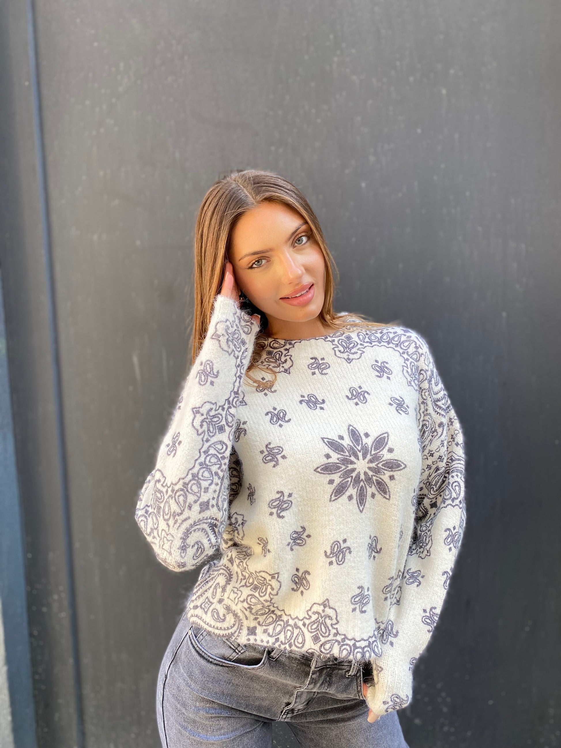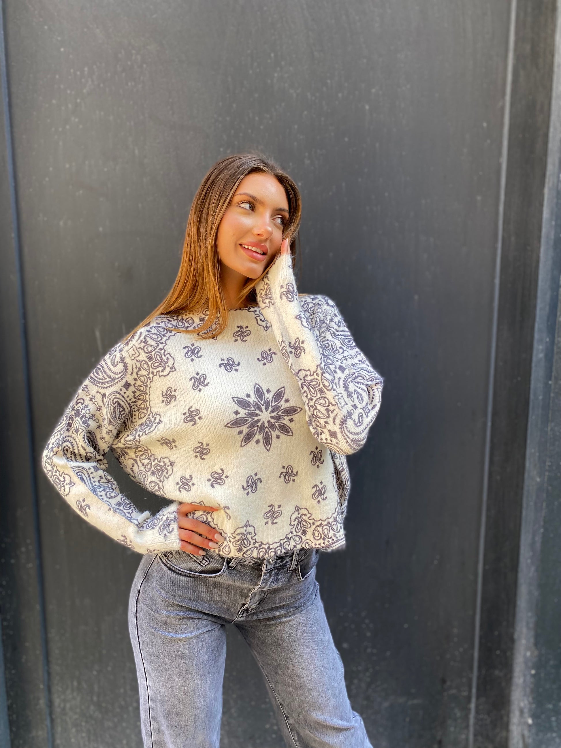 Joli pull, qualité supérieure, bien doux, et bien chaud beige avec un imprimé bandana gris anthracite