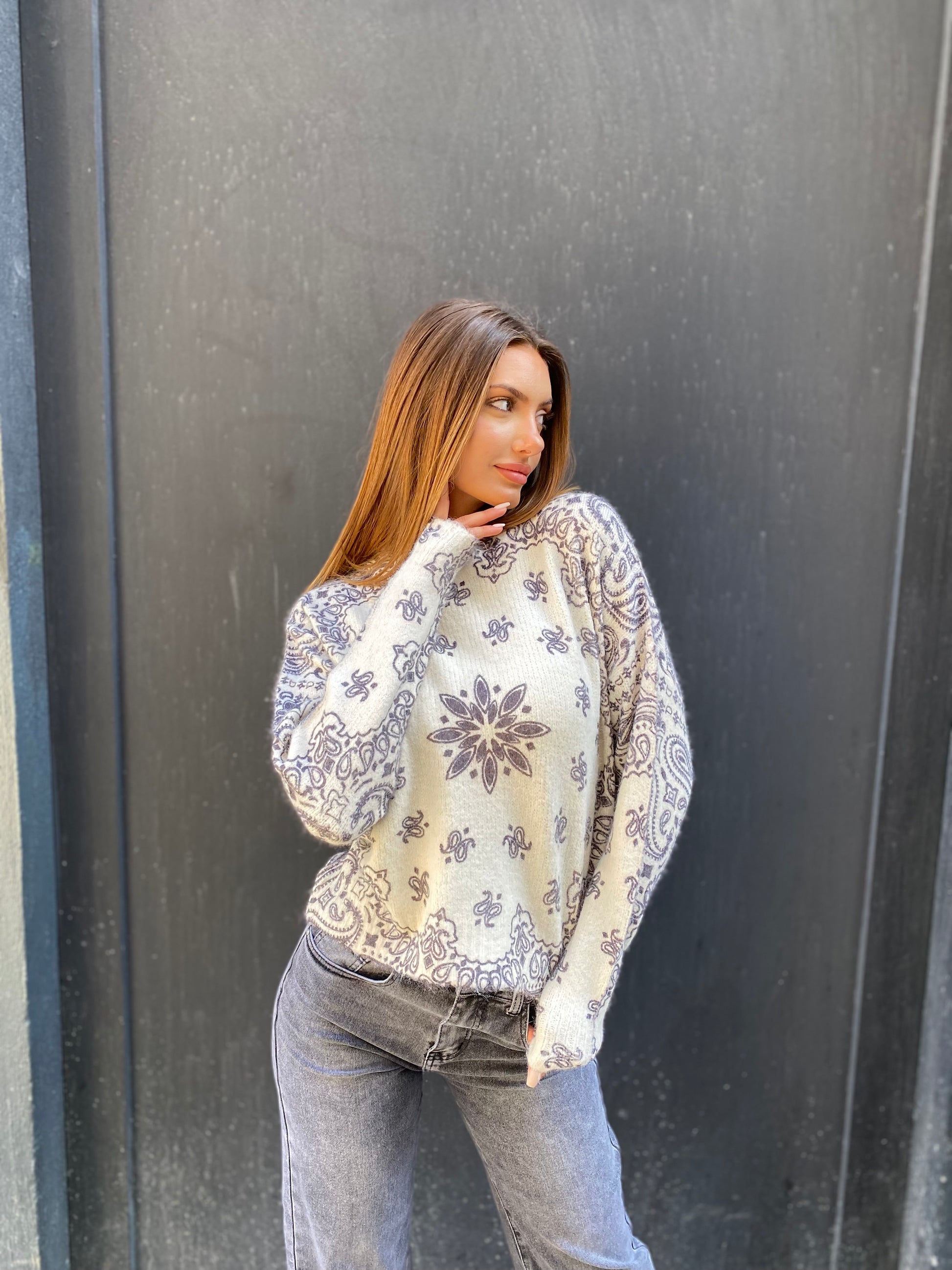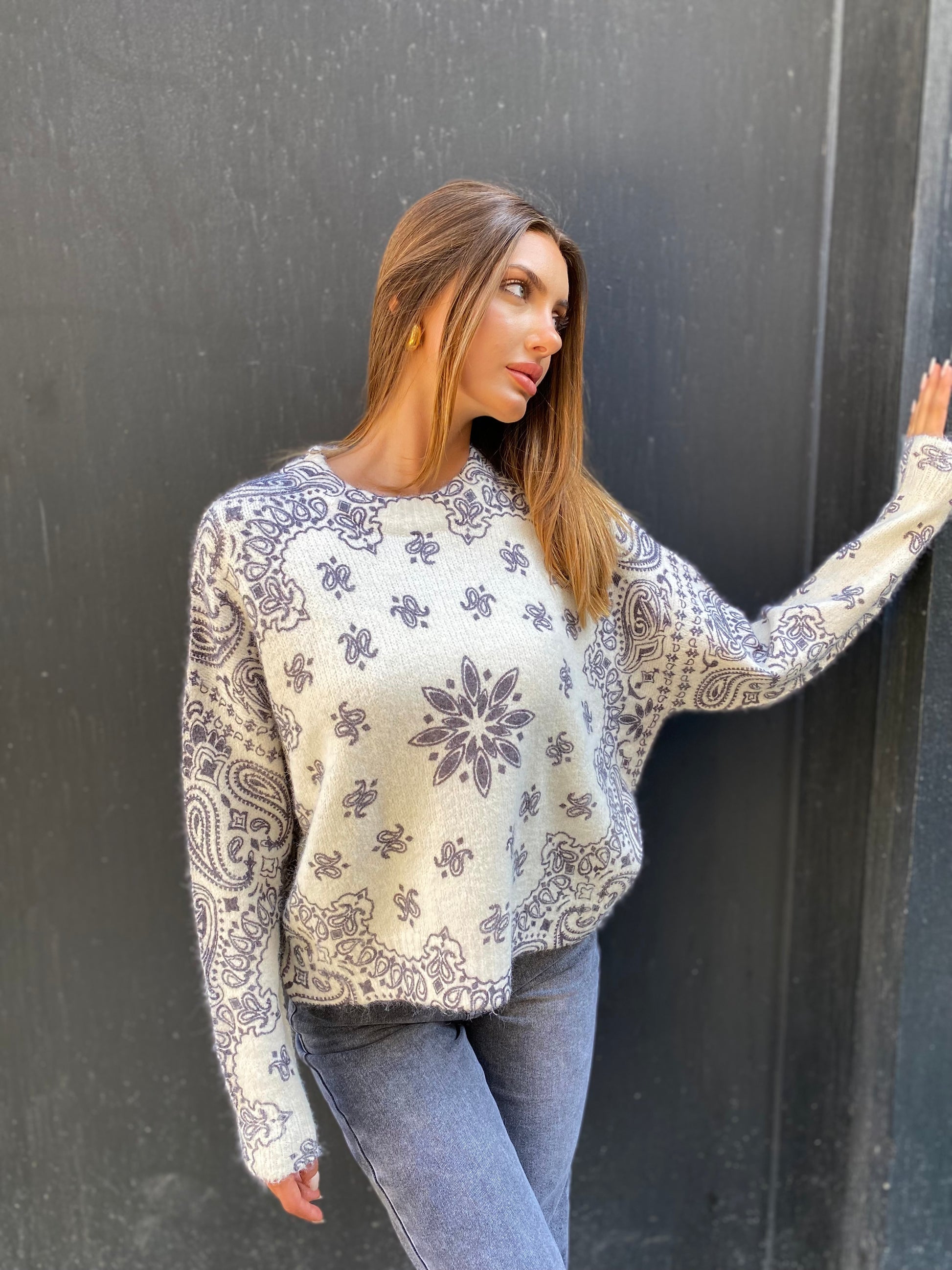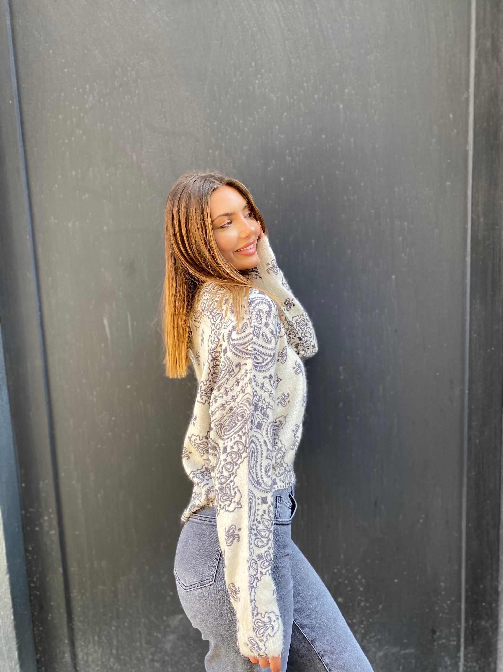 Joli pull, qualité supérieure, bien doux, et bien chaud beige avec un imprimé bandana gris anthracite