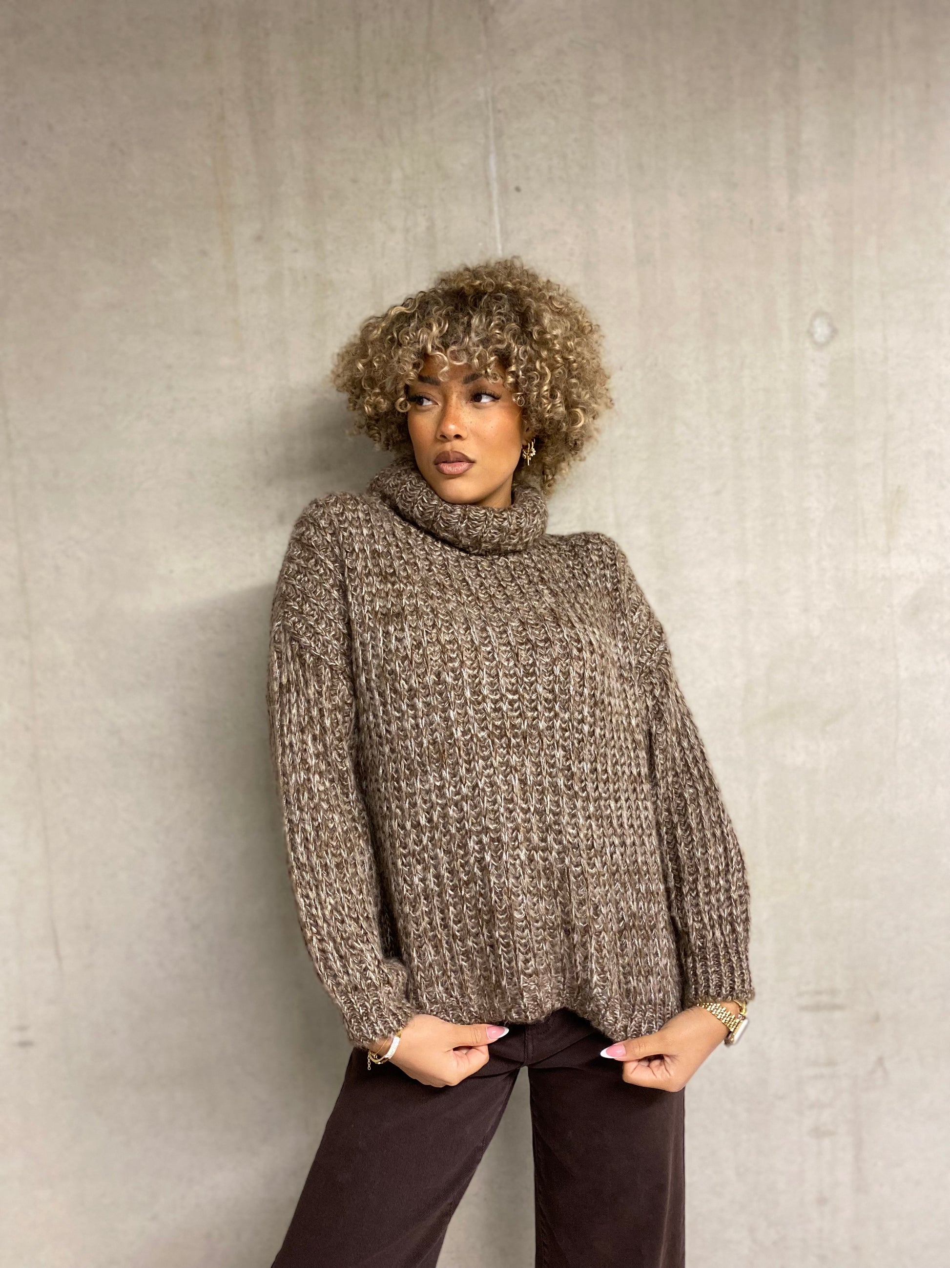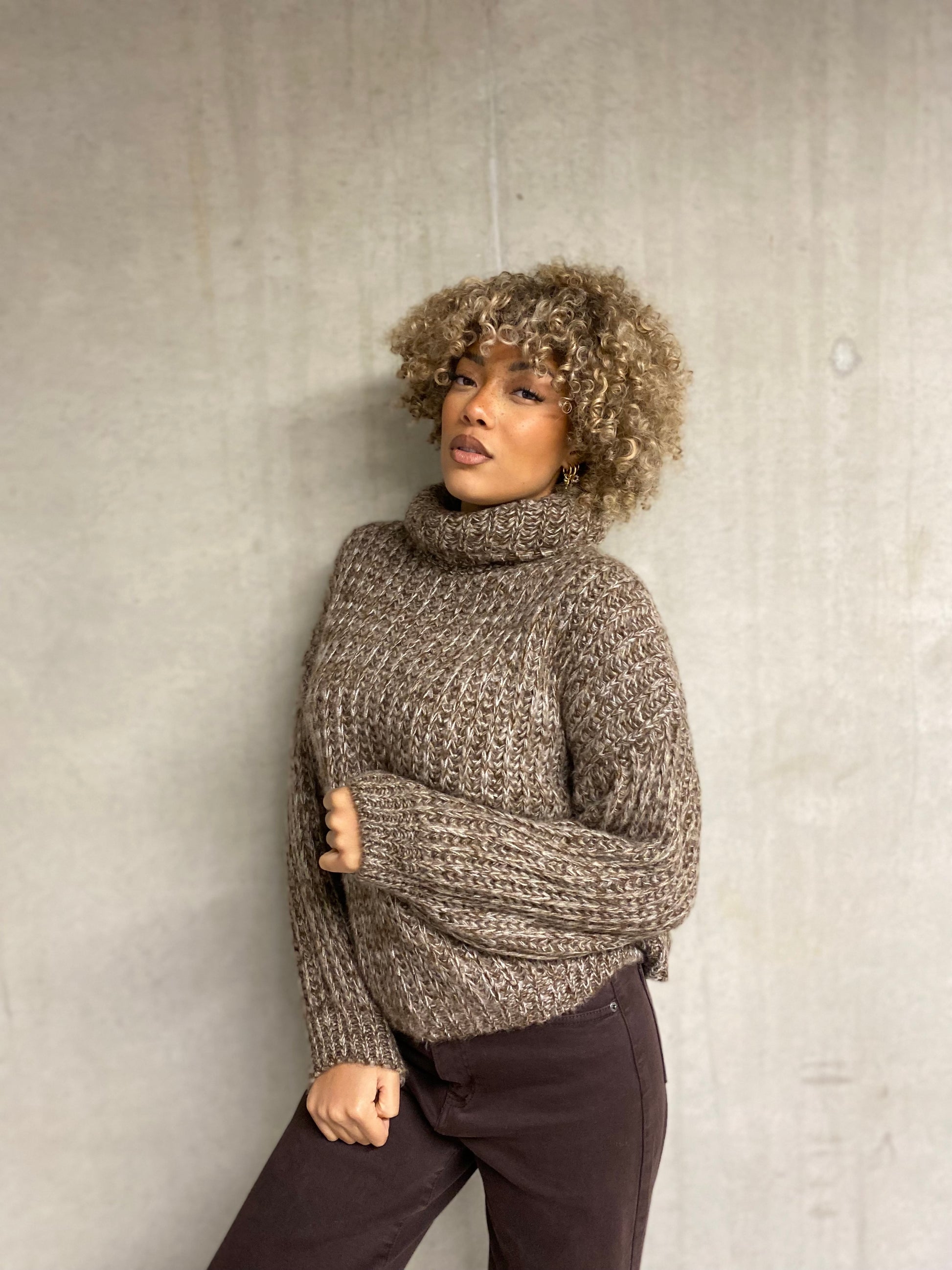 Joli pull, bien chaud, brun, chiné, beige avec un grand col roulé manches longues matière très douce