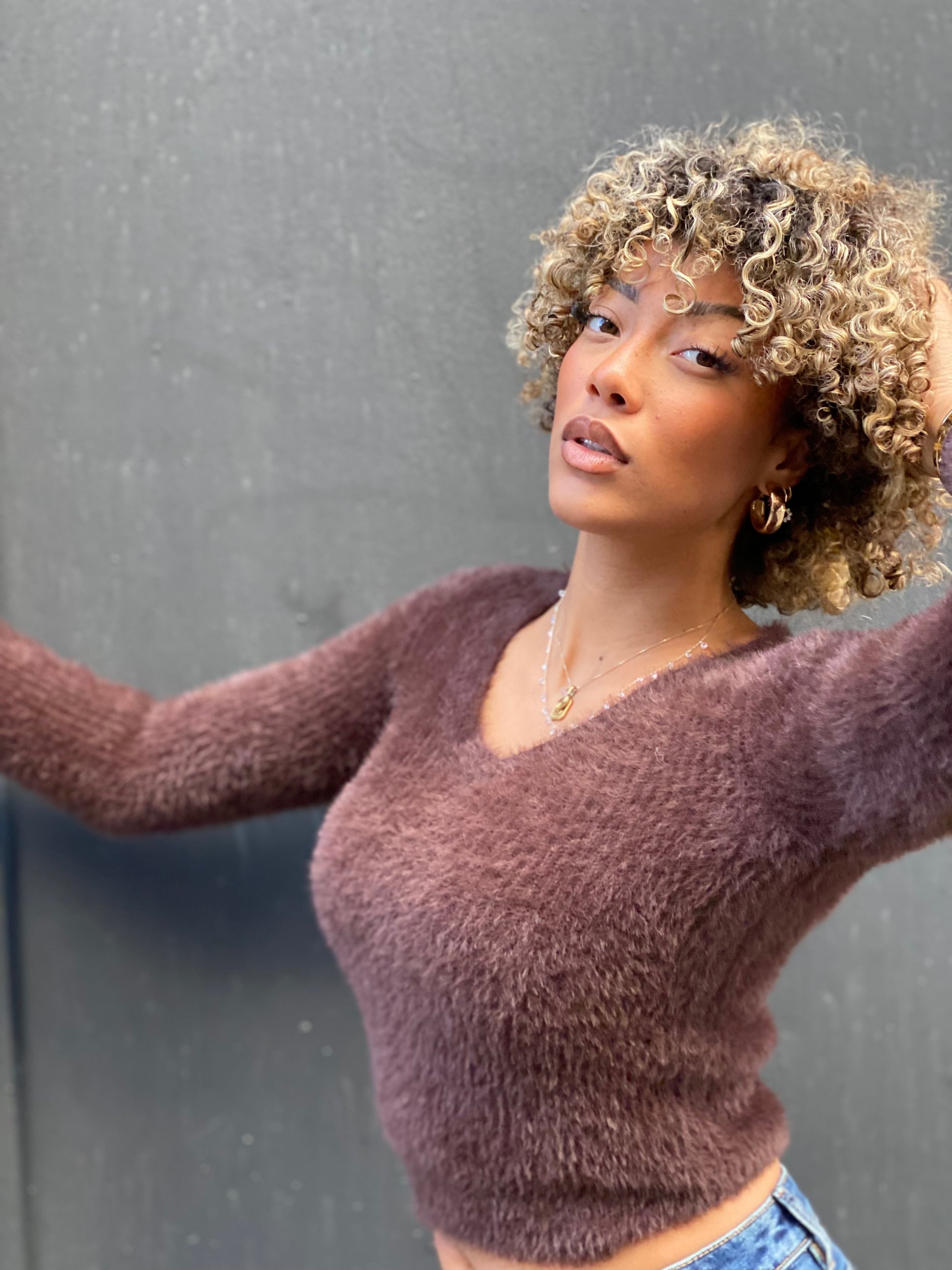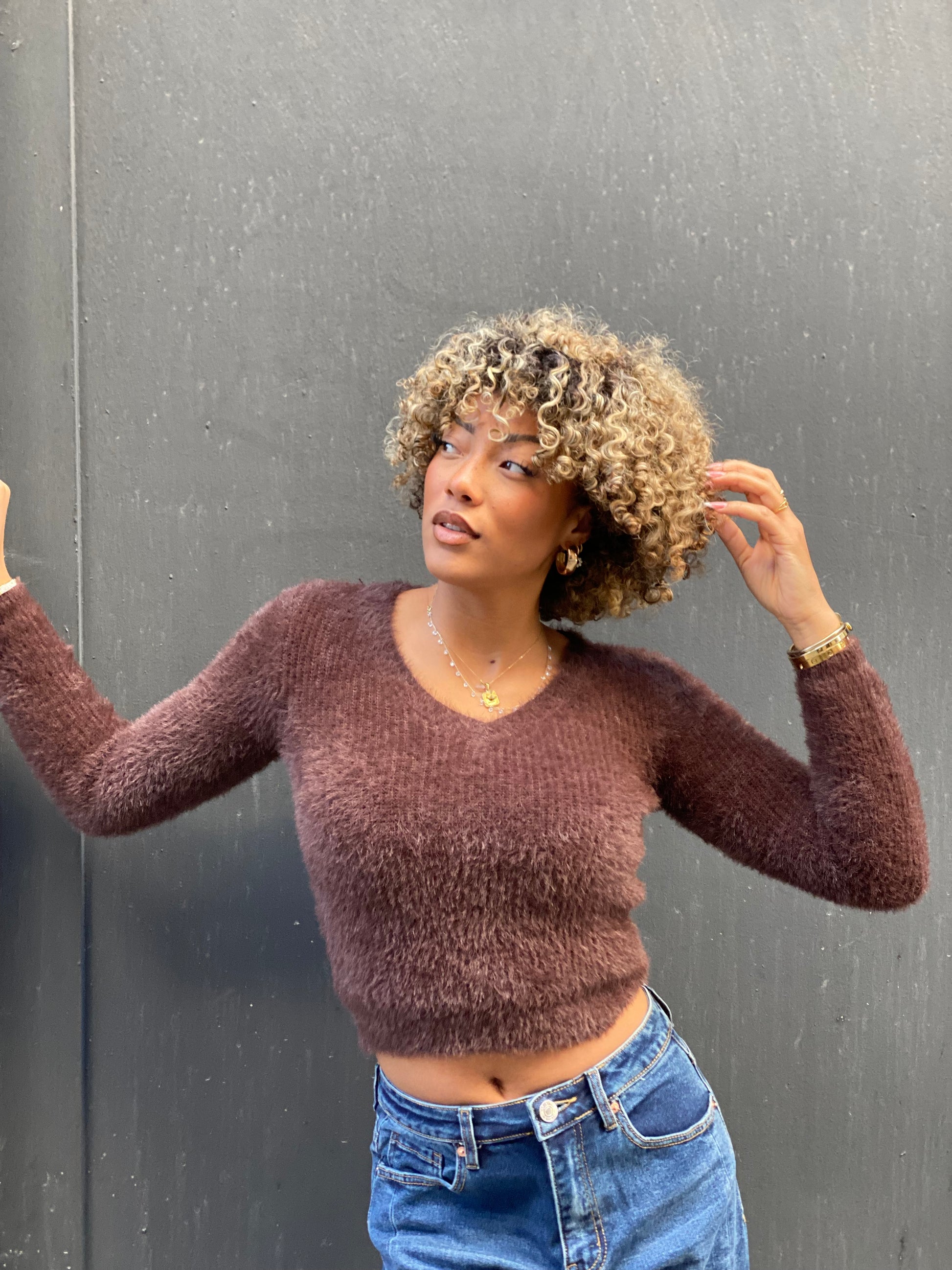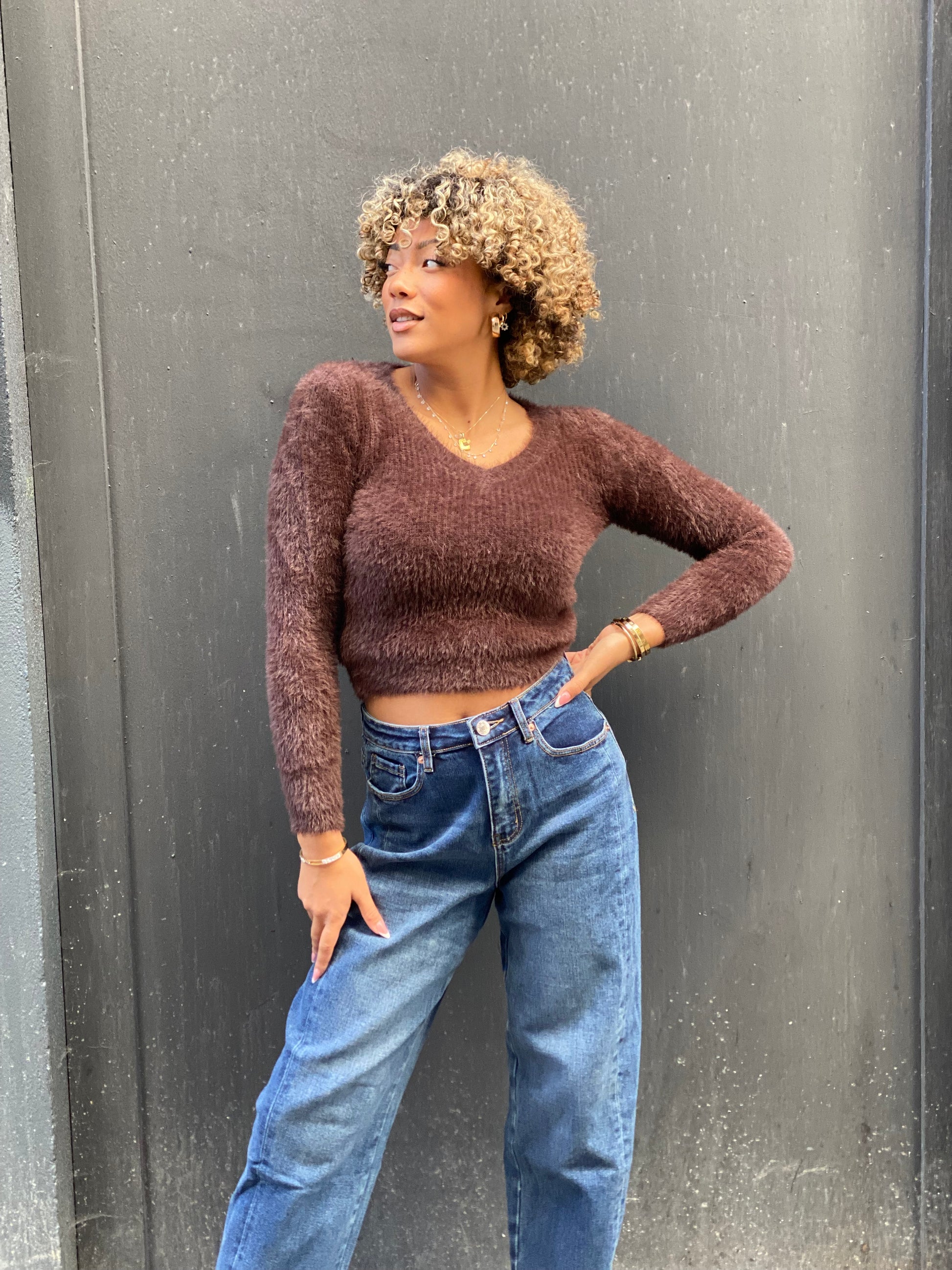 Joli petit pull col en V matière, toute douce toute chaude, la coupe est près du corps et arrive pile à la taille manches longues