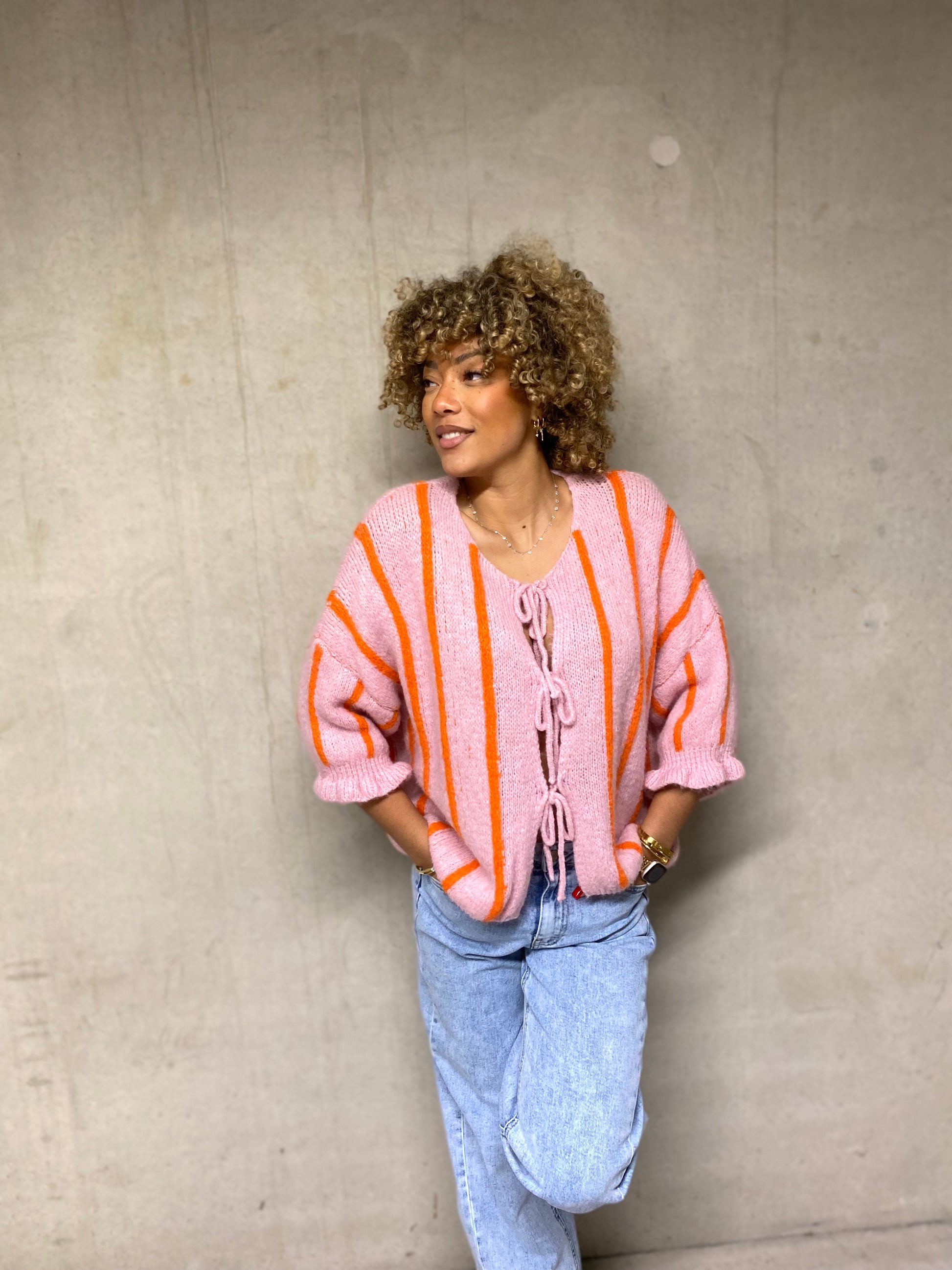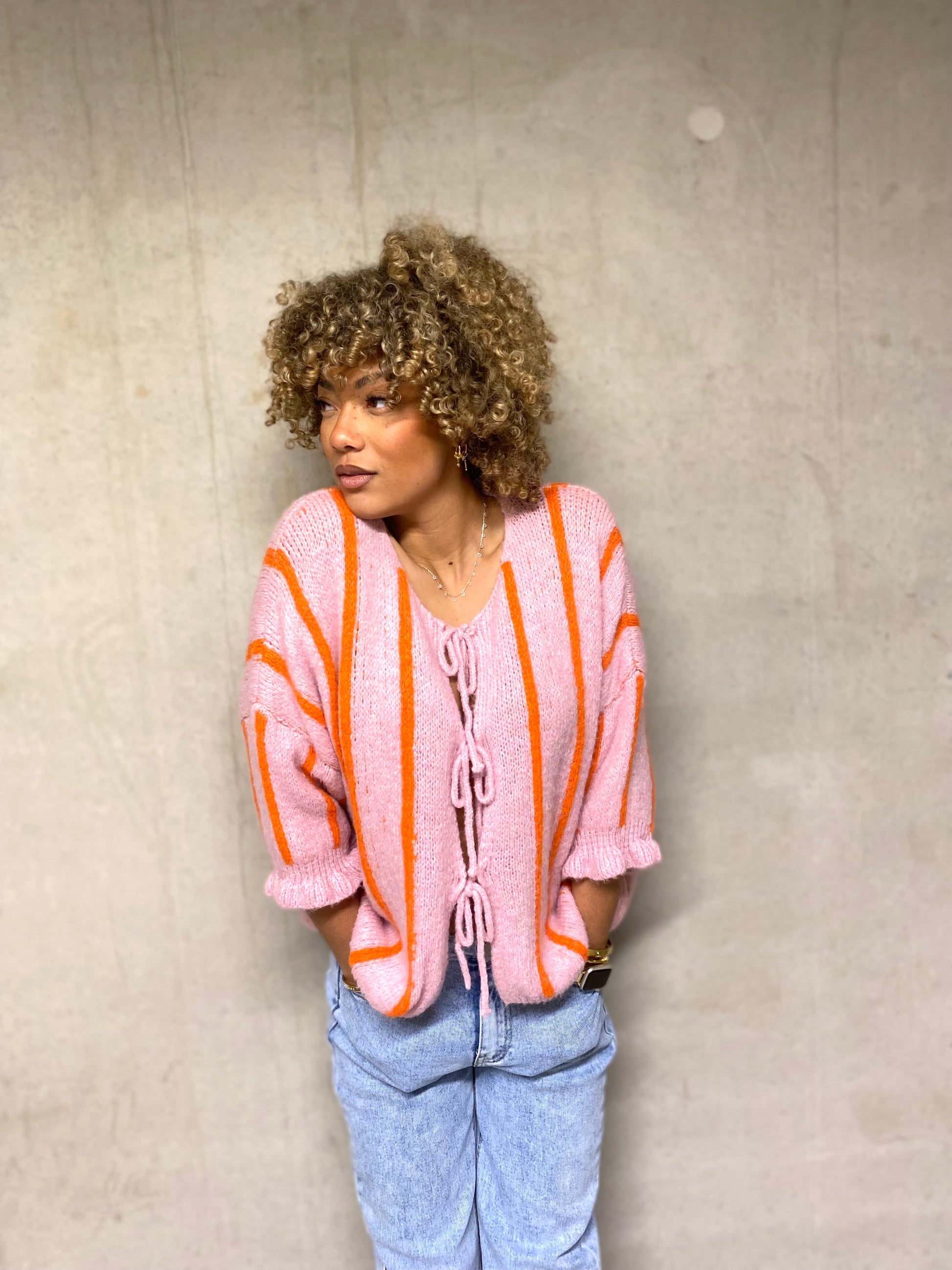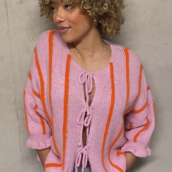Ce gilet tout mignon séduit au premier regard avec son joli rose bonbon lumineux rehaussé de fines lignes verticales orange peps. Un mélange de couleurs à la fois tendre et dynamique qui apporte instantanément de la bonne humeur à la tenue.