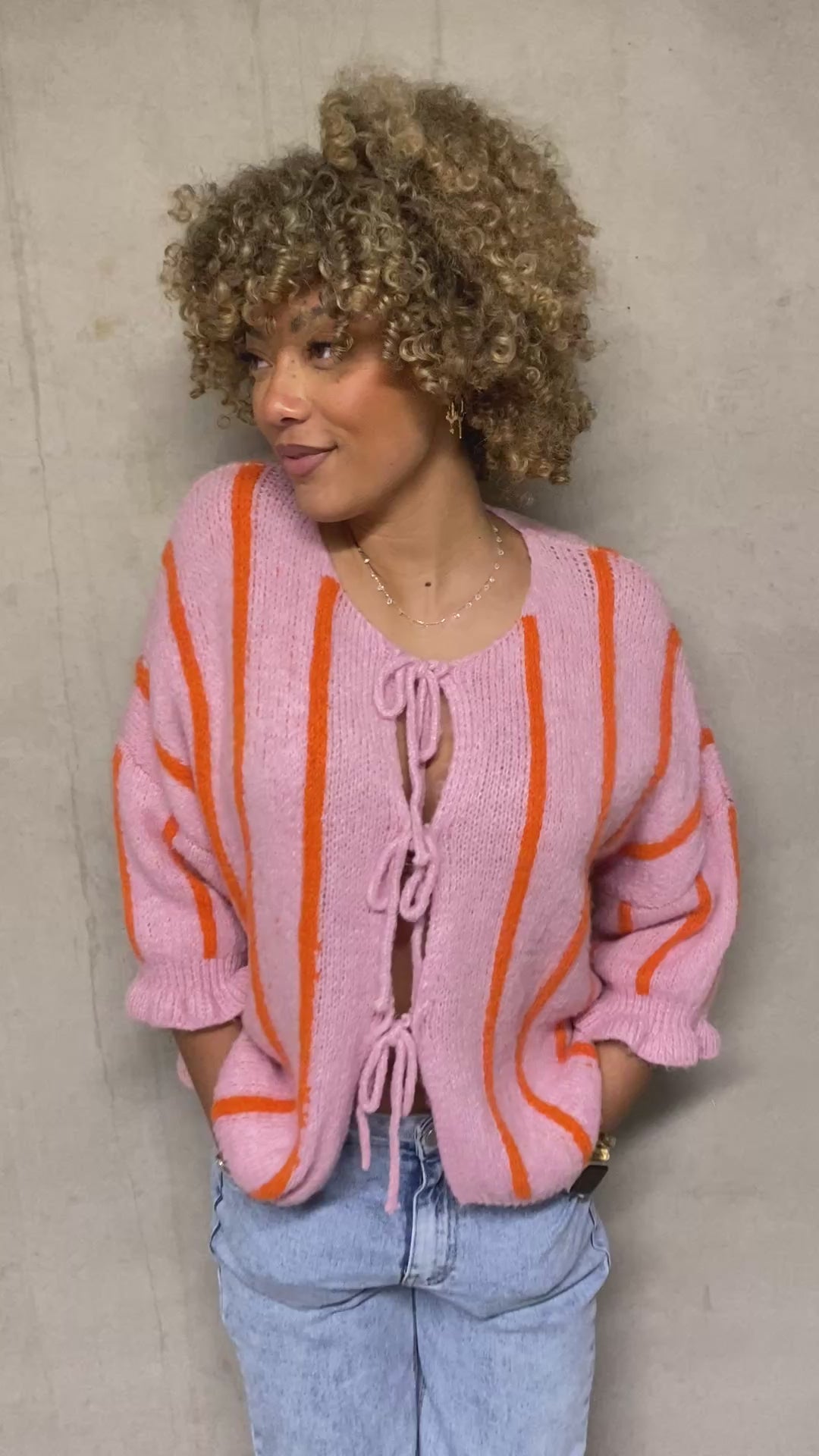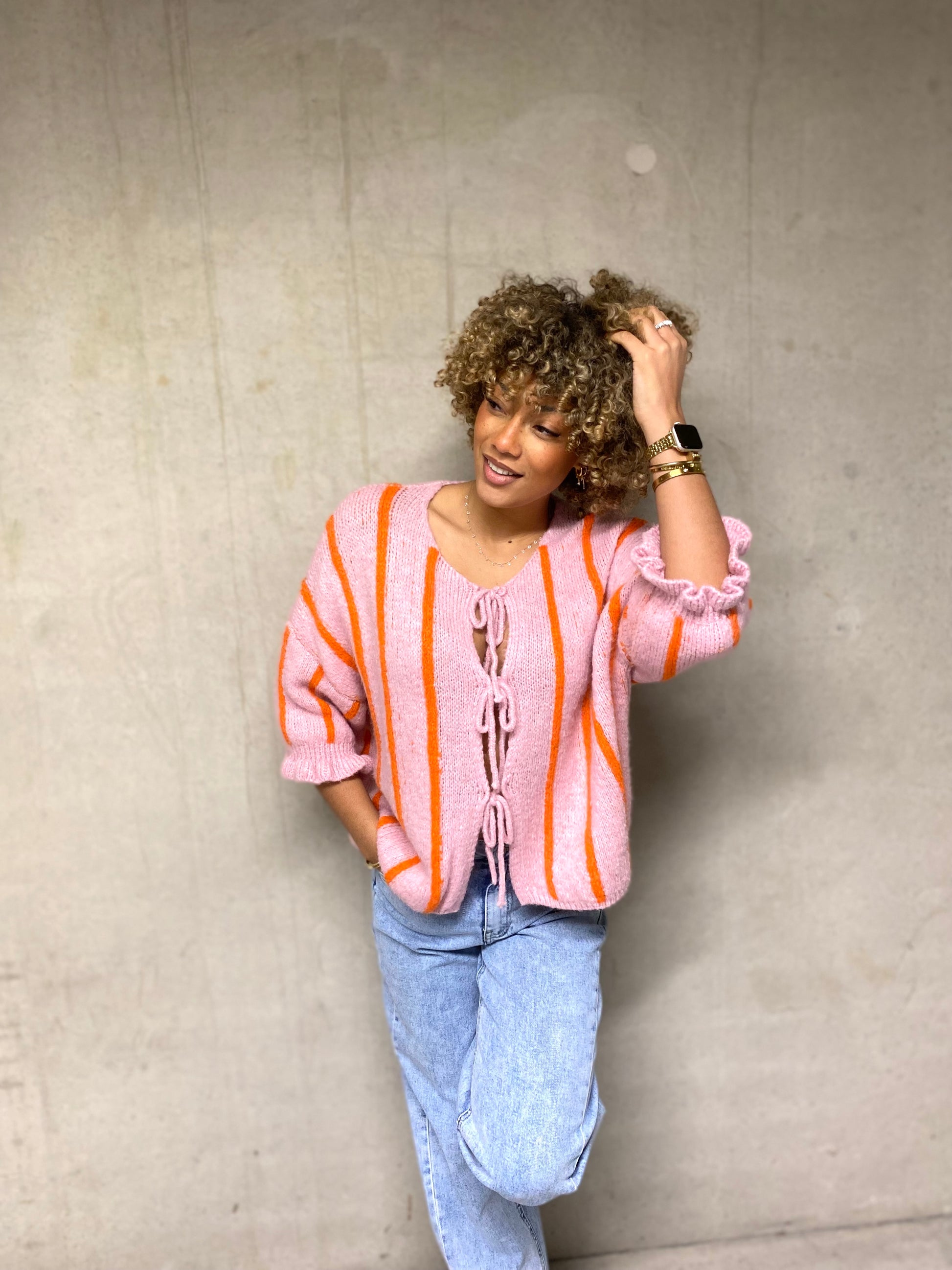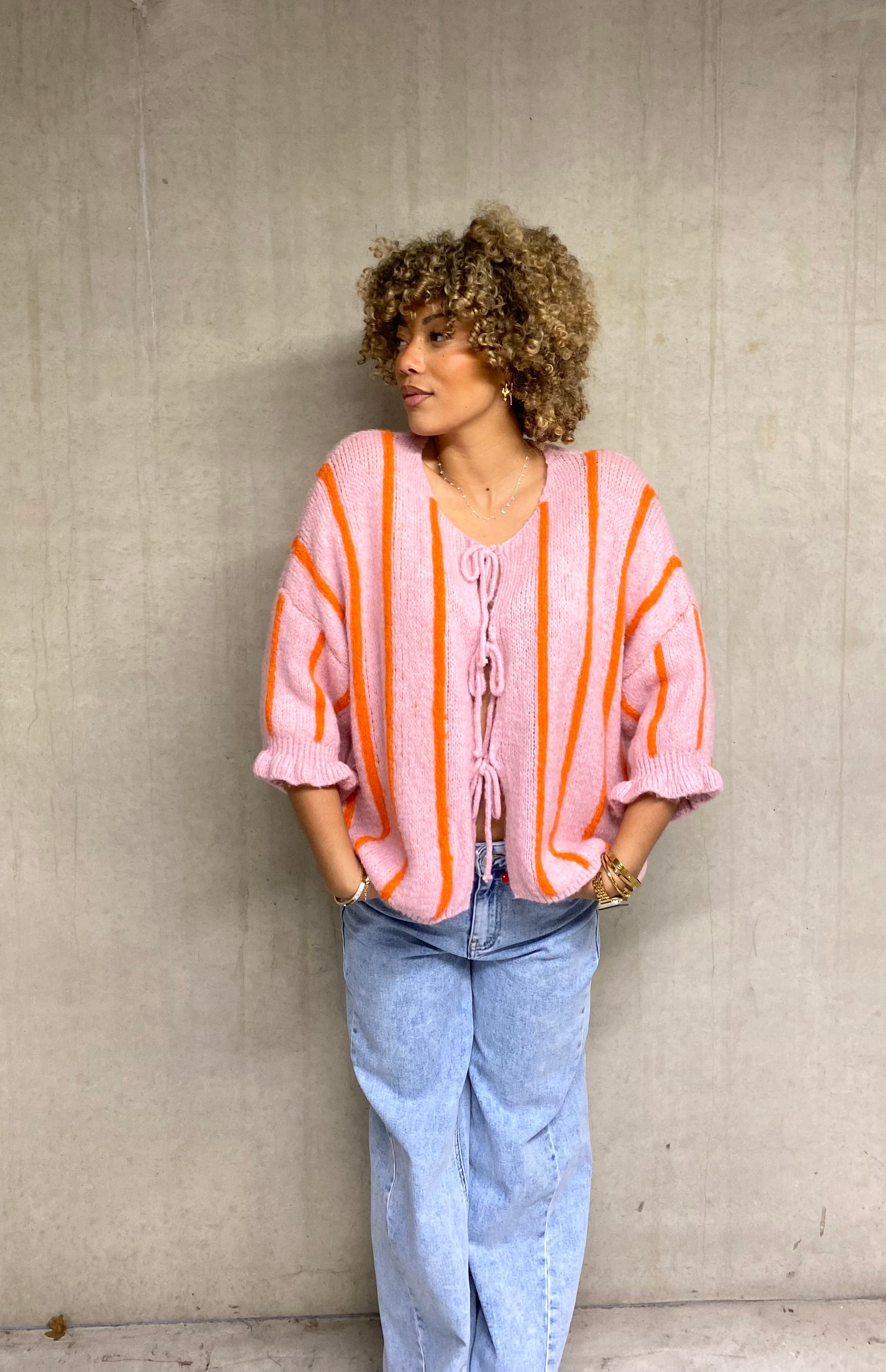 Ce gilet tout mignon séduit au premier regard avec son joli rose bonbon lumineux rehaussé de fines lignes verticales orange peps. Un mélange de couleurs à la fois tendre et dynamique qui apporte instantanément de la bonne humeur à la tenue.