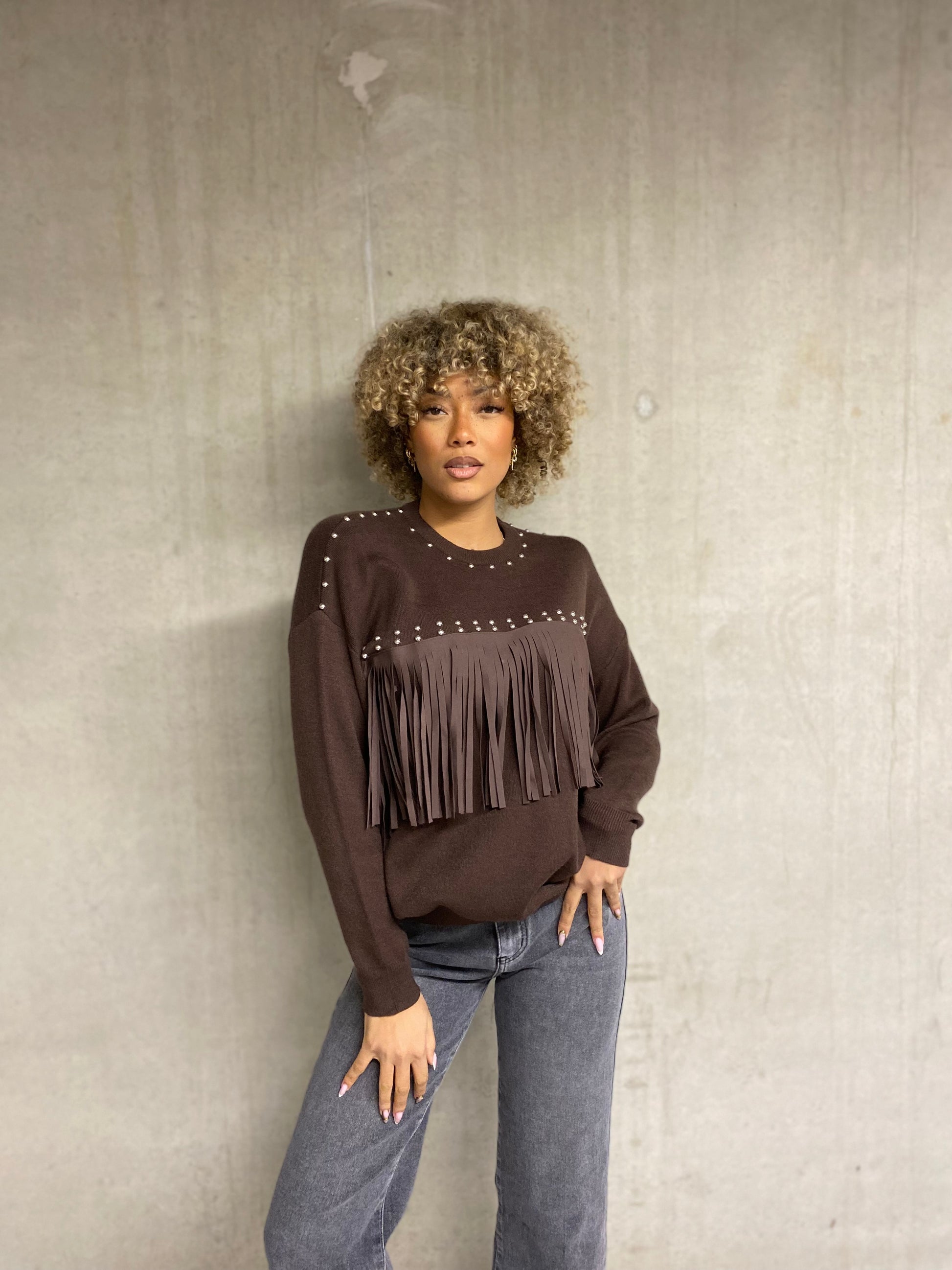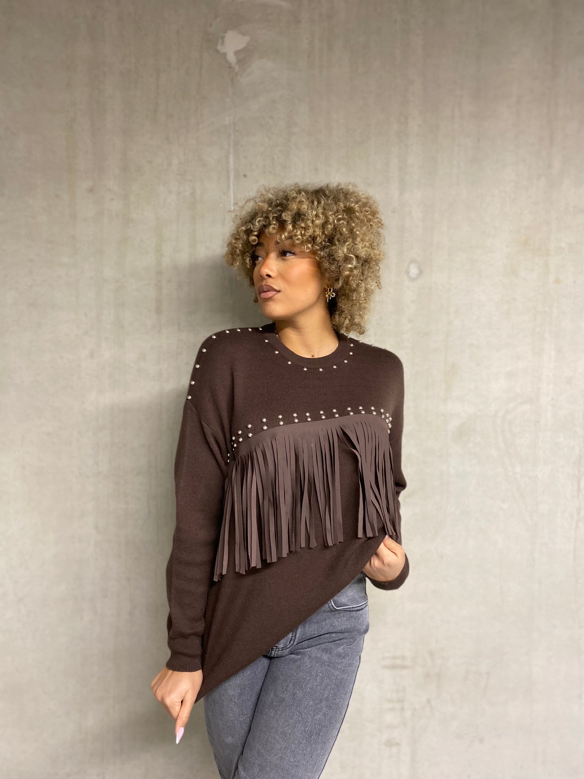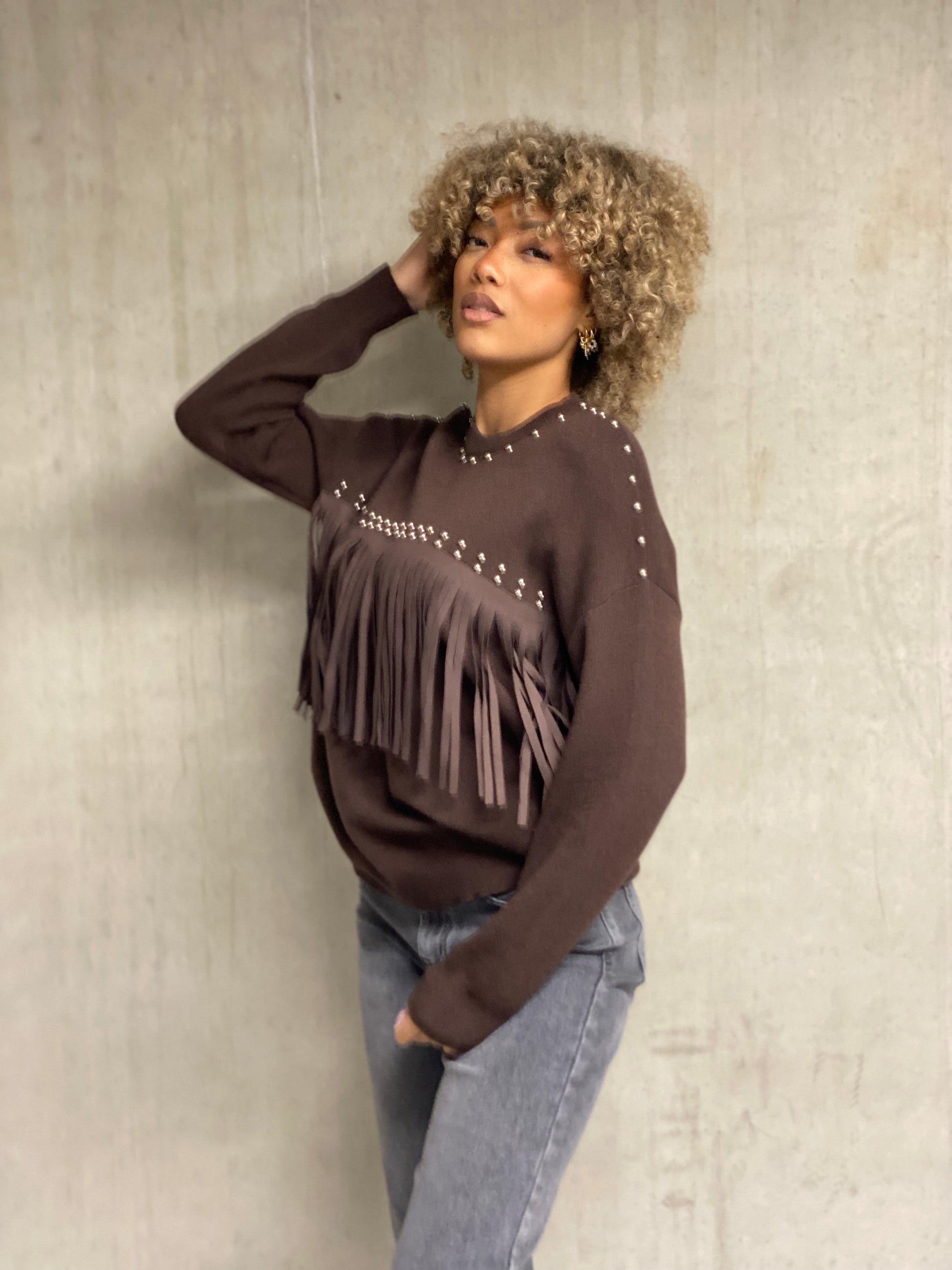 Optez pour l’originalité avec ce magnifique pull brun chocolat, sublimé par de franges élégantes et de petits clous métalliques pour une touche tendance et moderne. Sa coupe droite et légèrement ample offre un confort absolu tout en mettant en valeur la silhouette. Une pièce de très belle qualité, unique et stylée, idéale pour apporter du caractère à vos tenues
