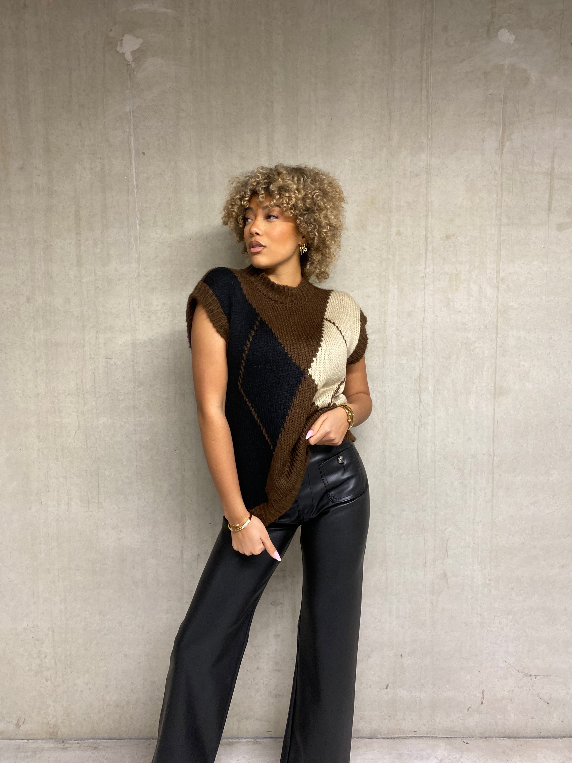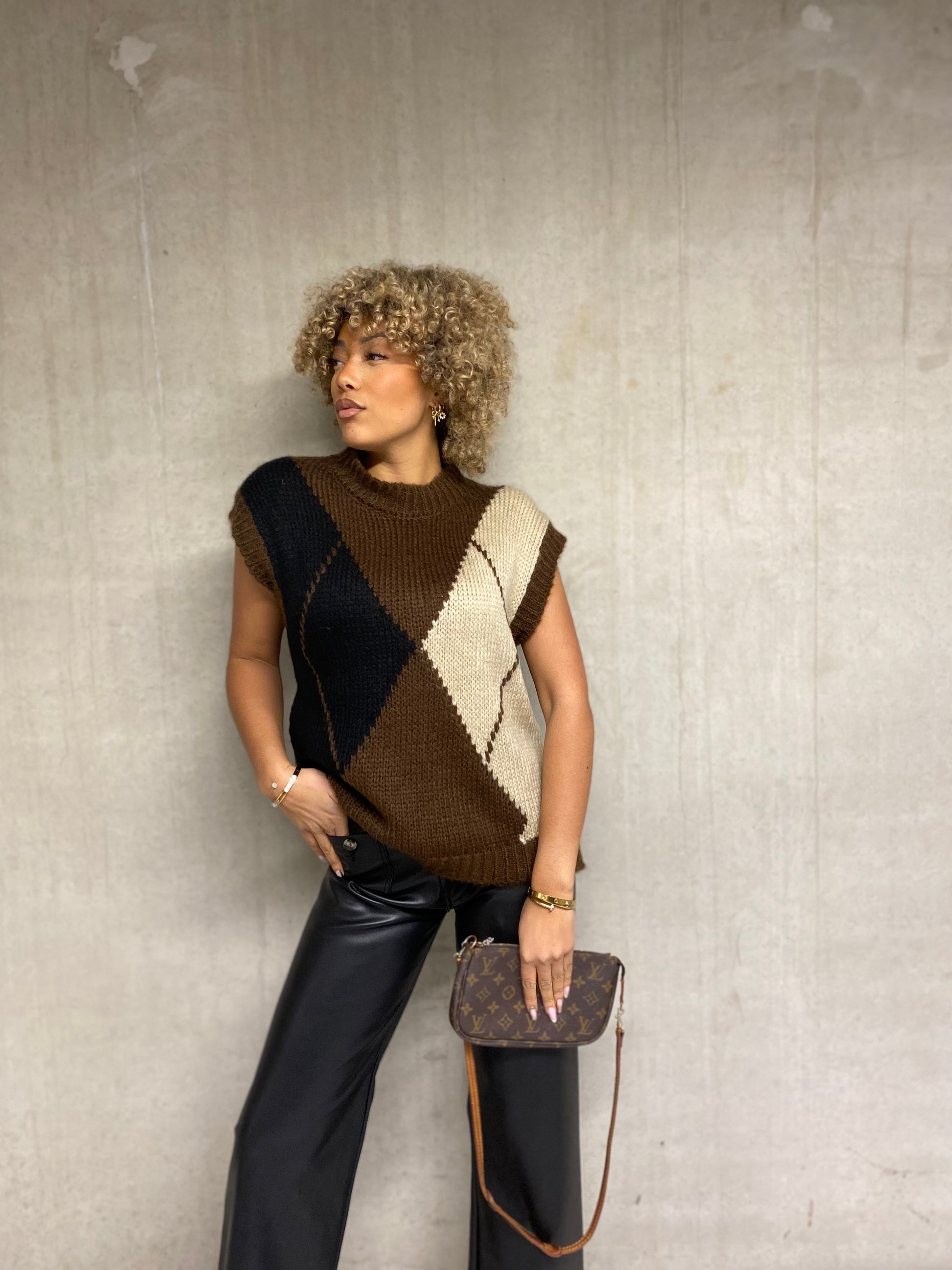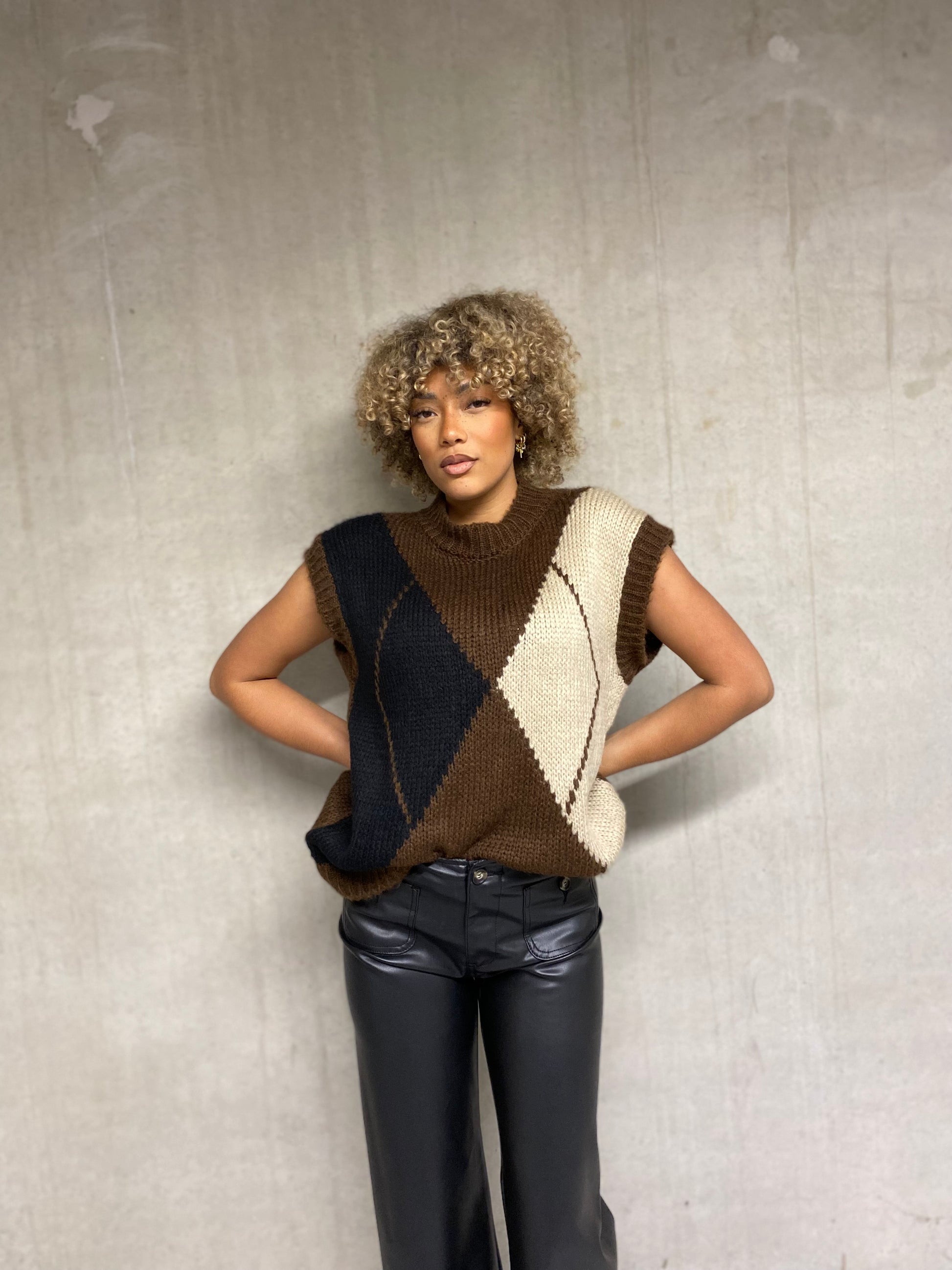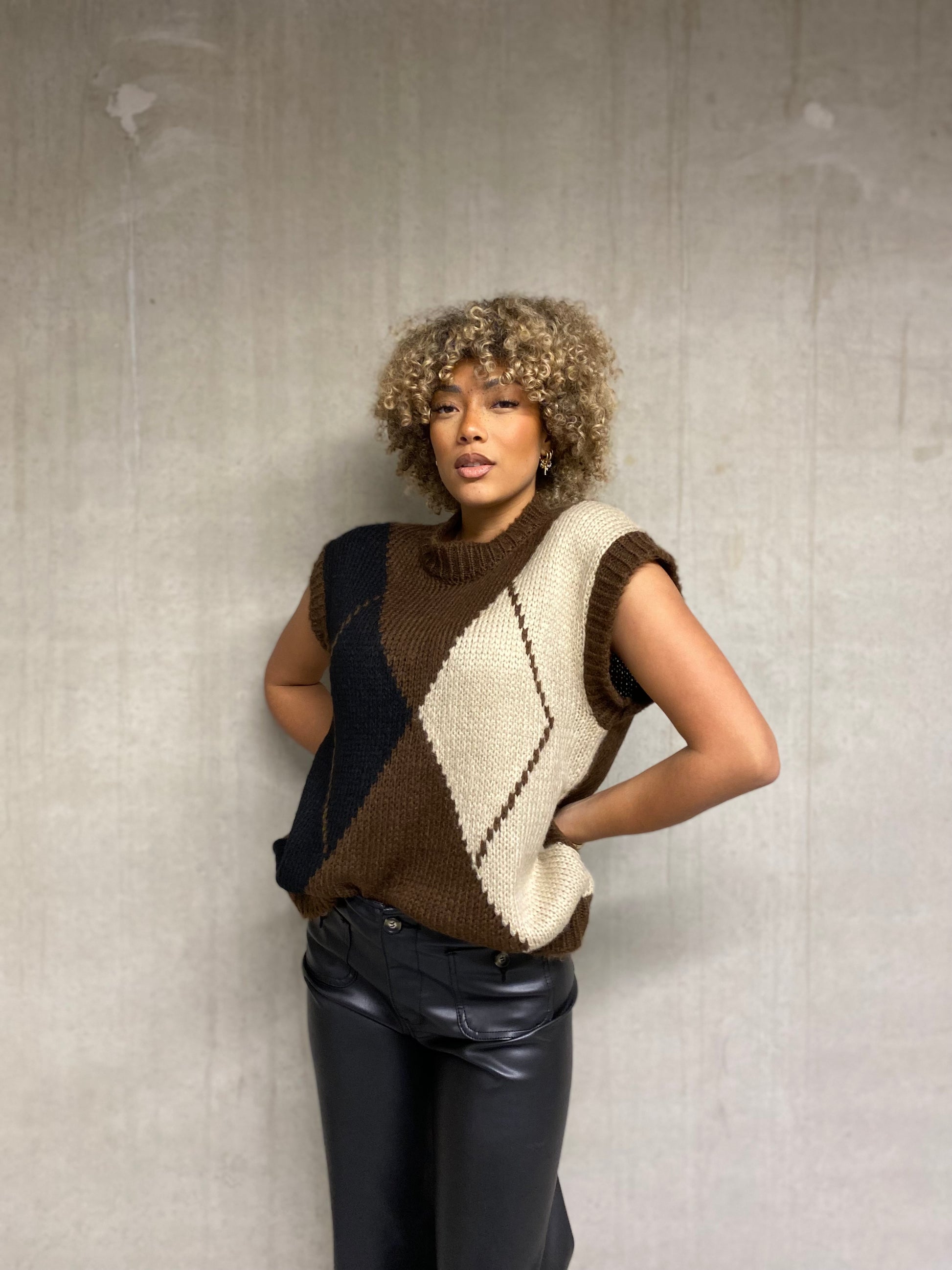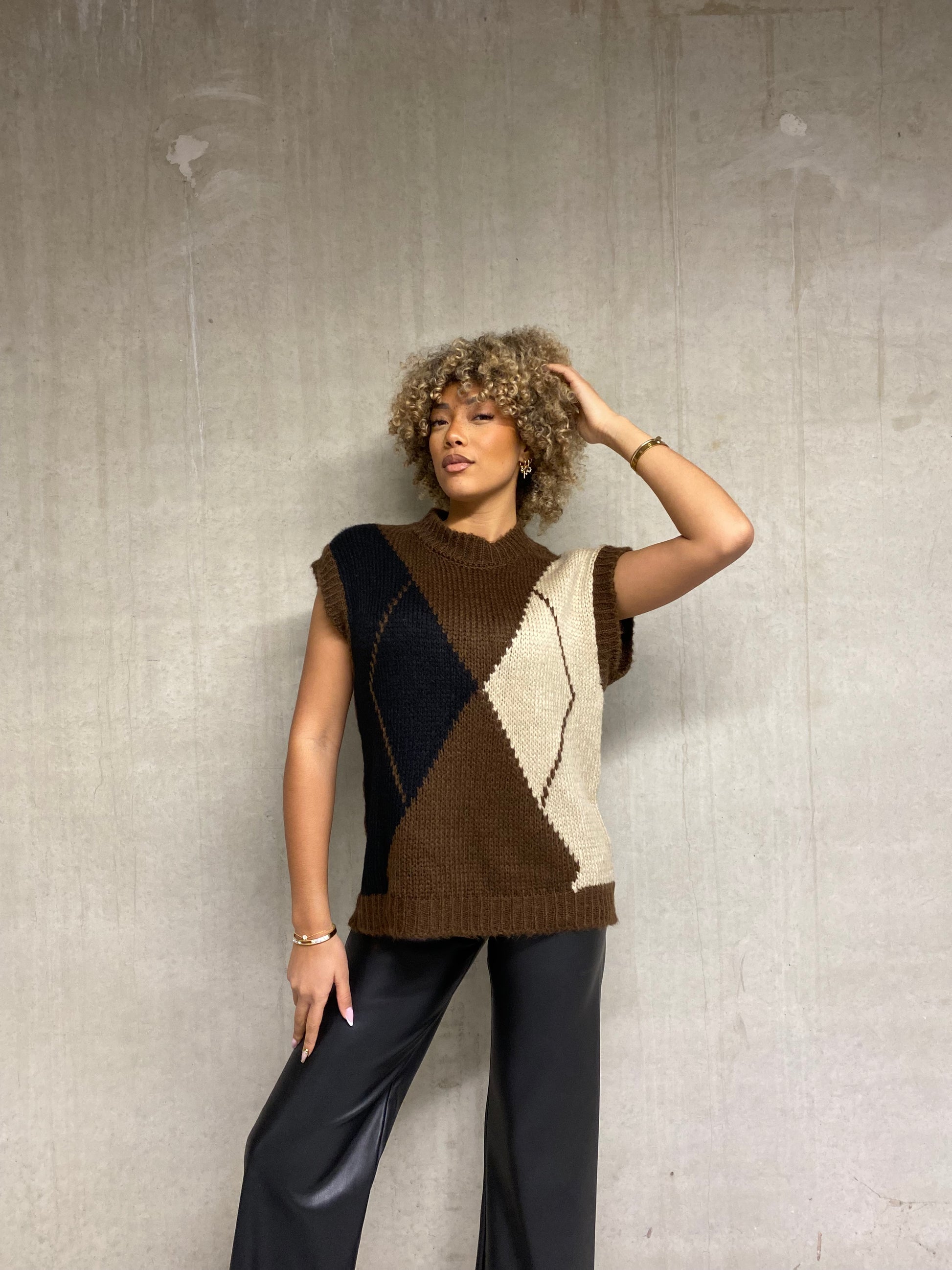 Pull sans manches brun à motif jacquard losanges (brun, beige, noir).