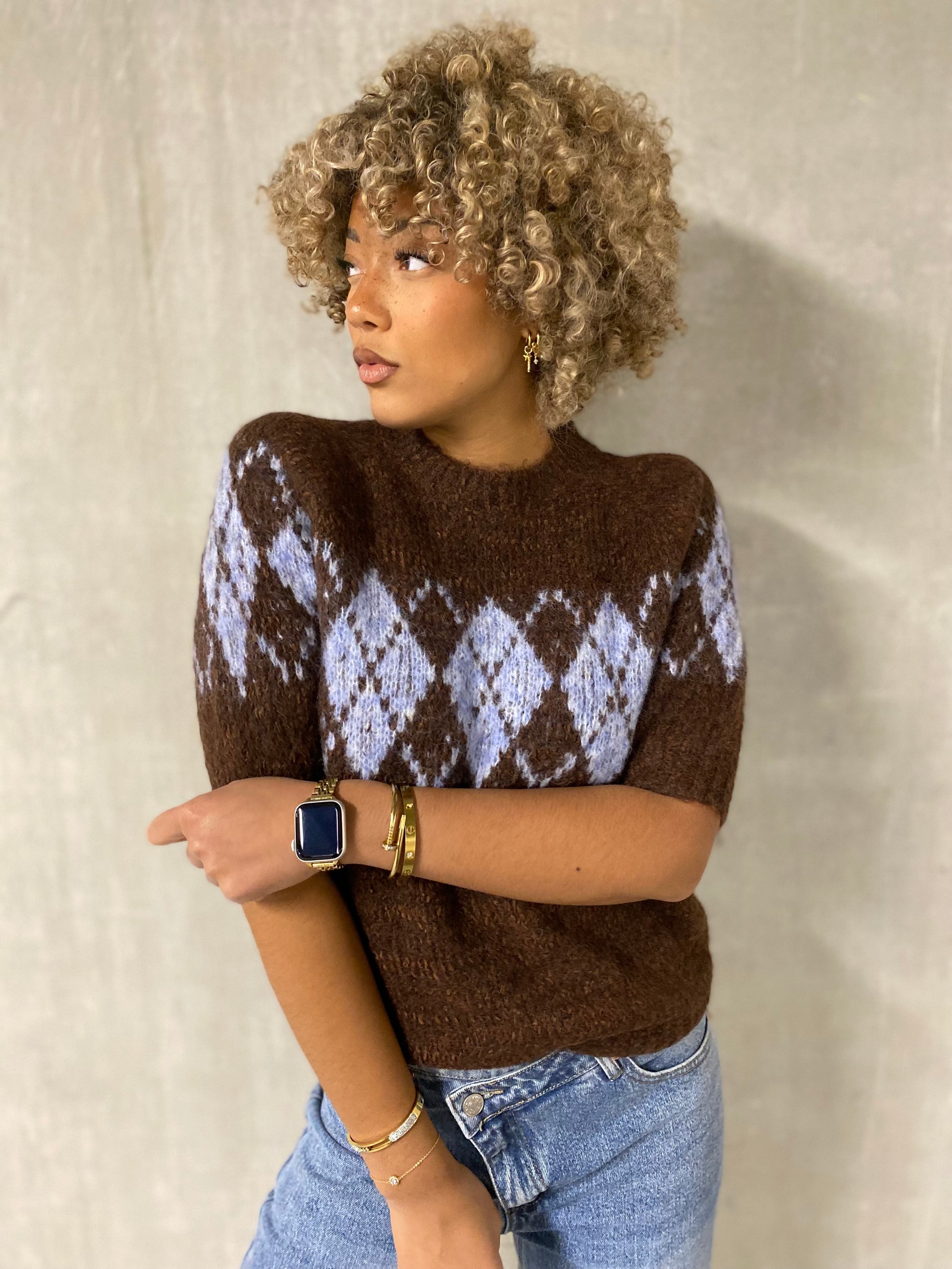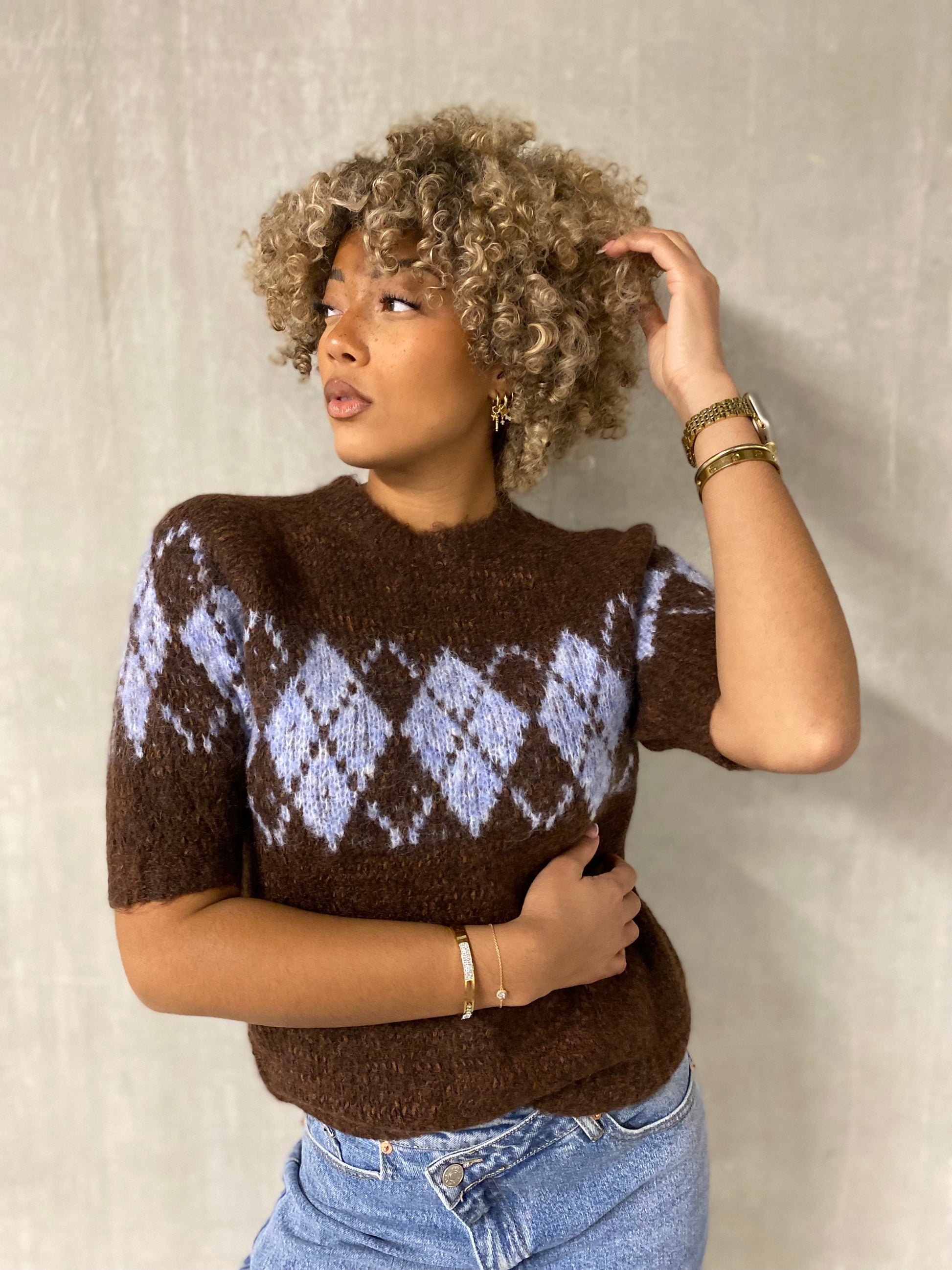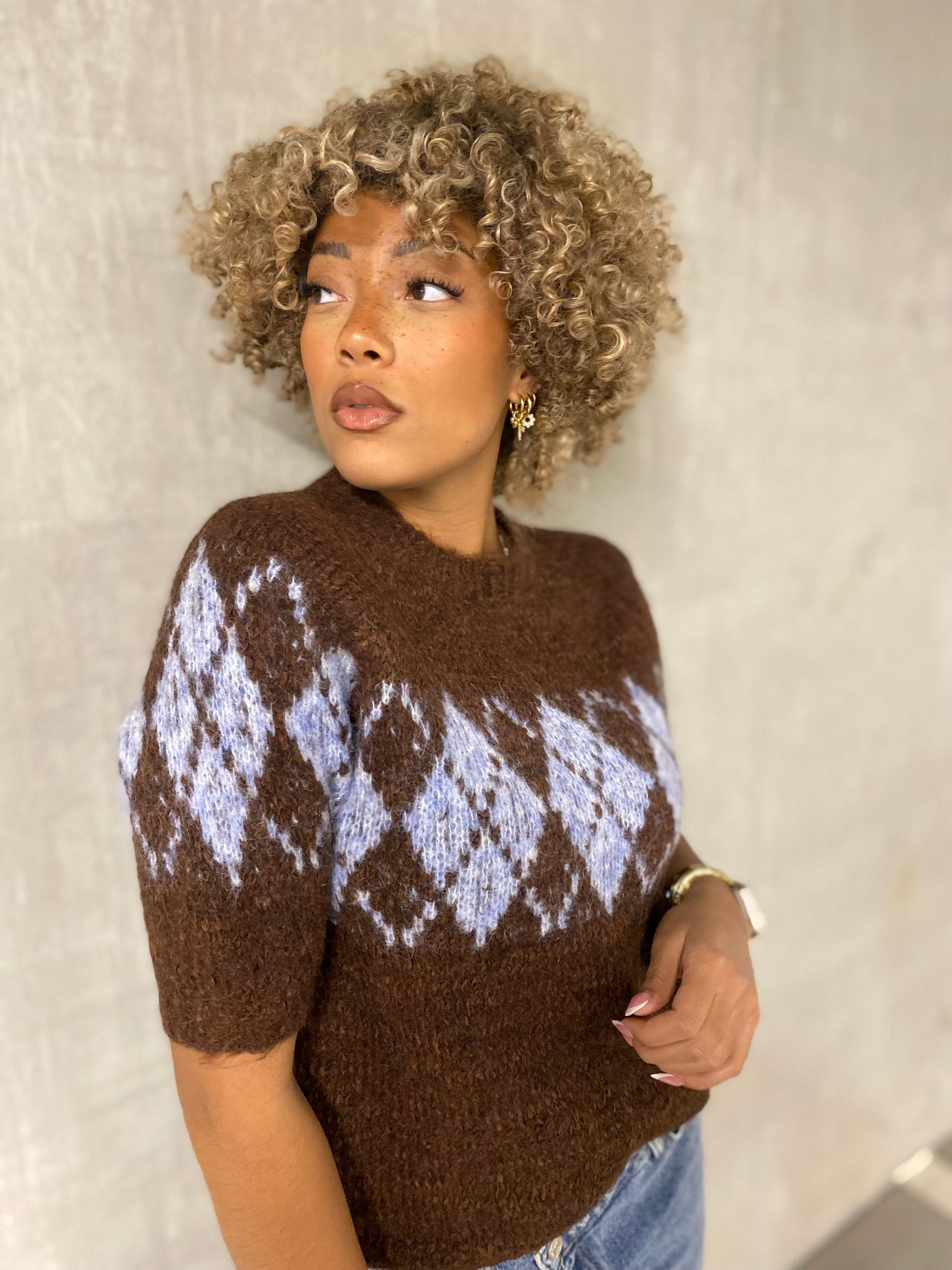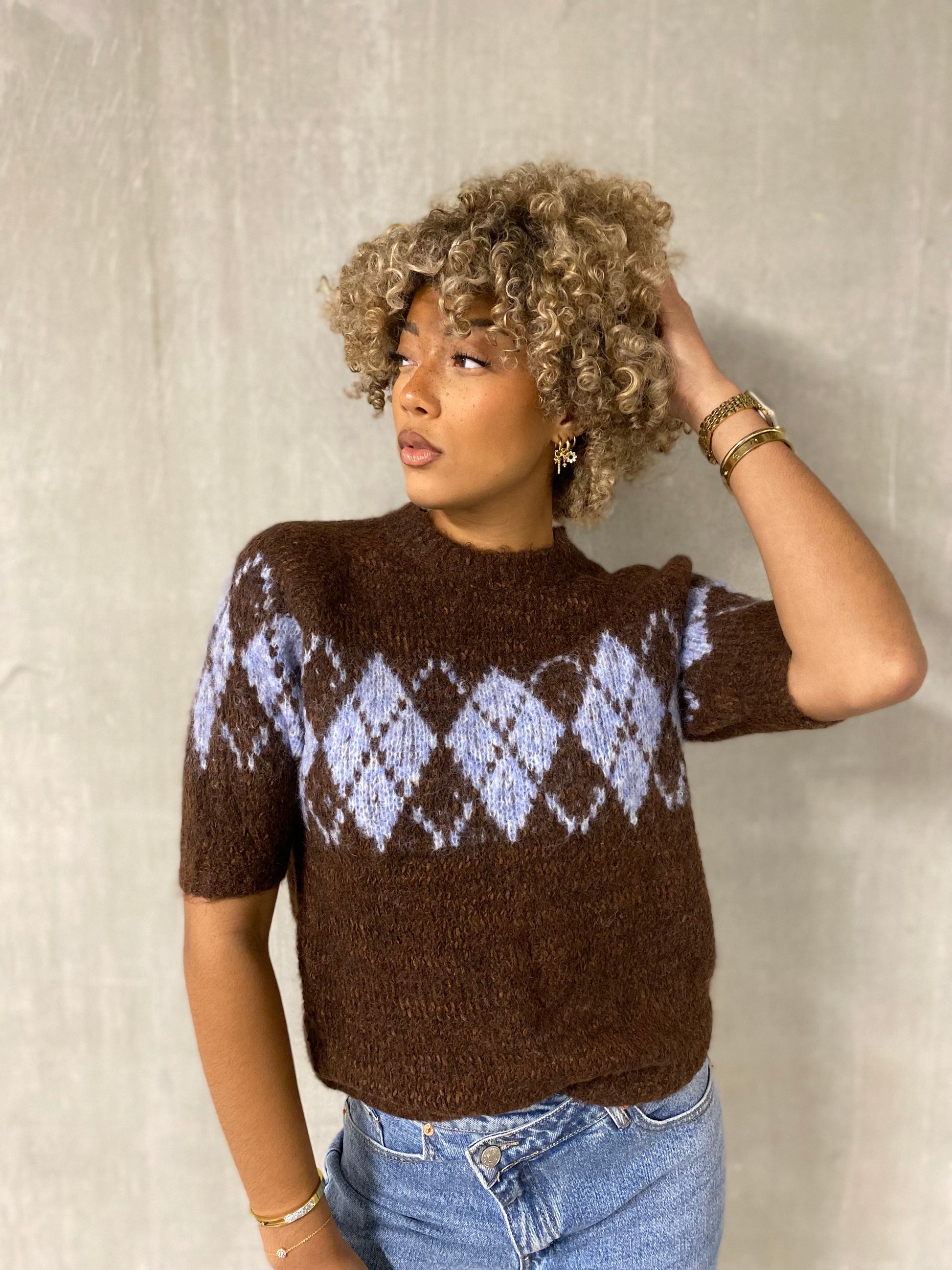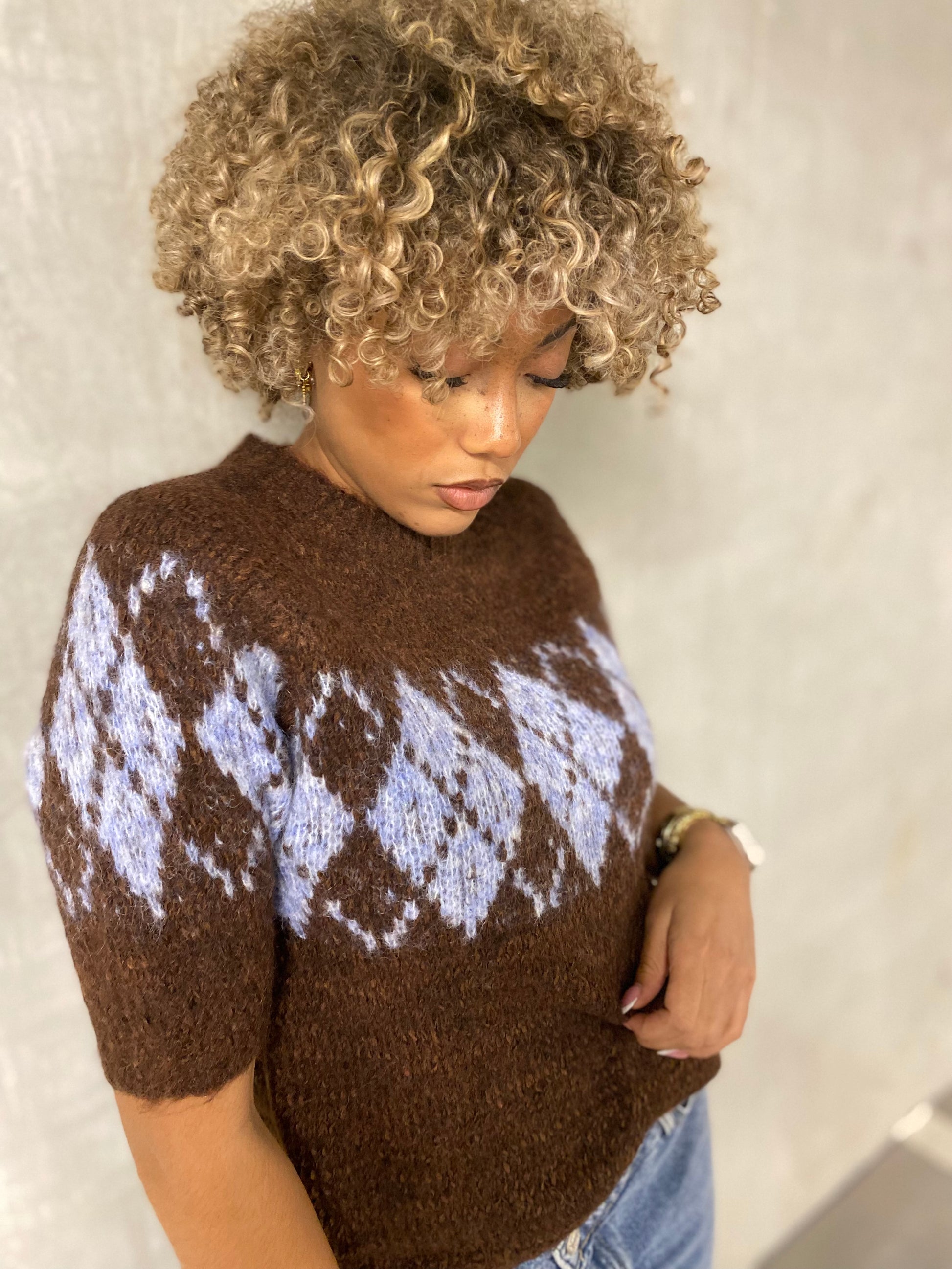 Pull brun, col rond manches courtes avec des losanges, style jacquard bleu ciel