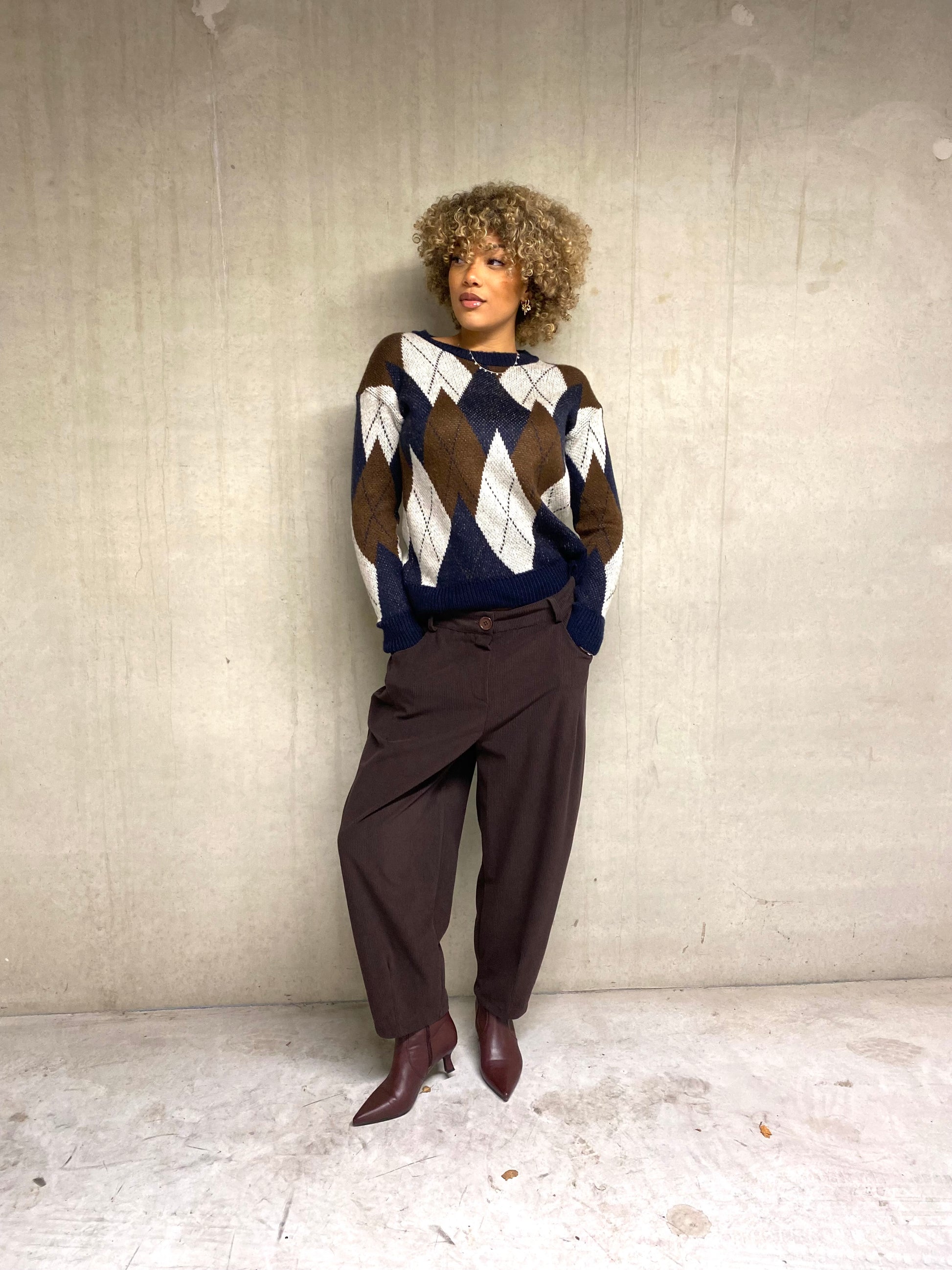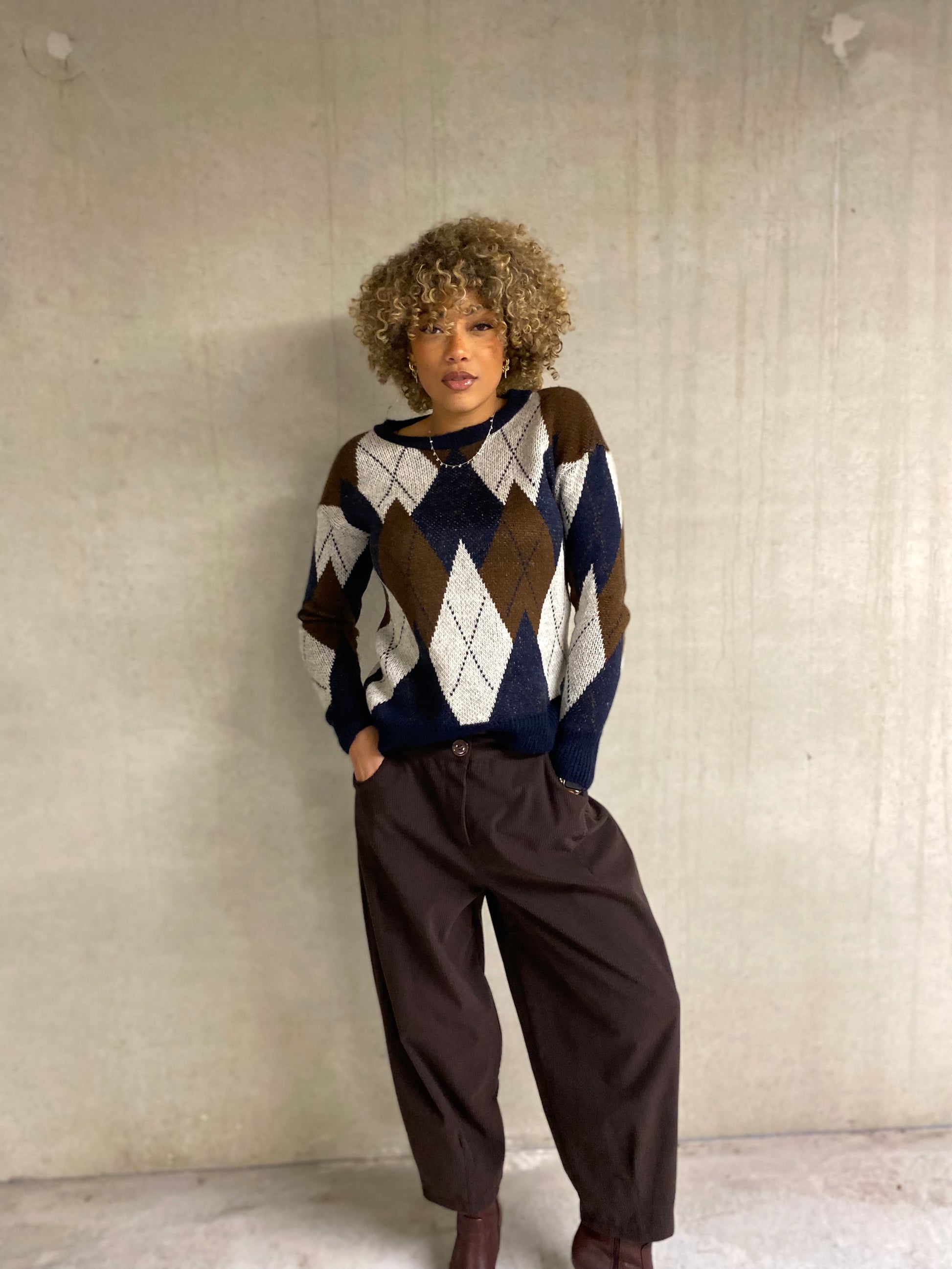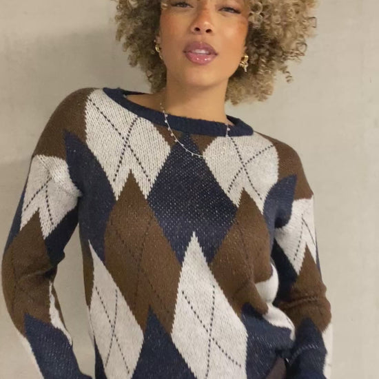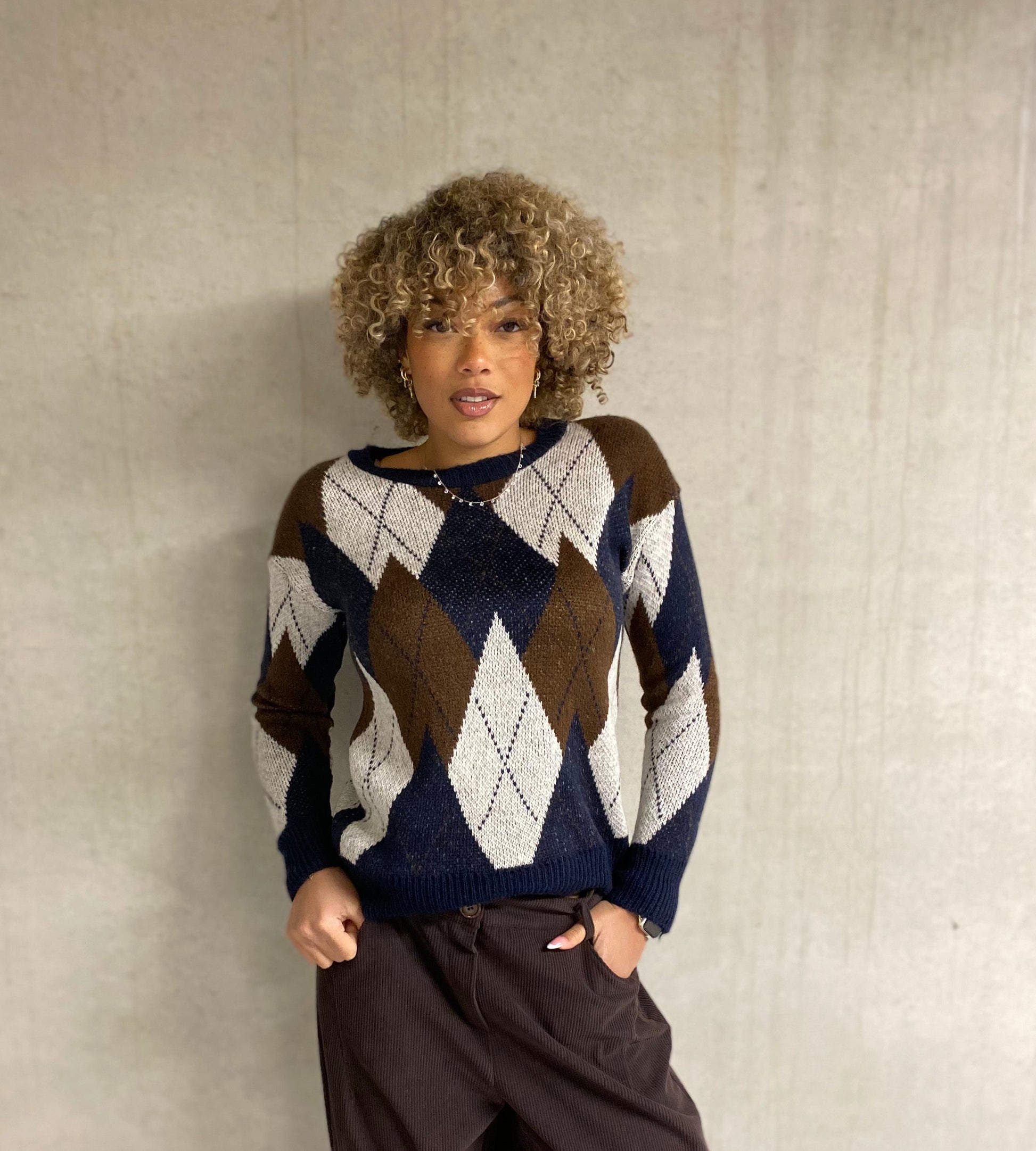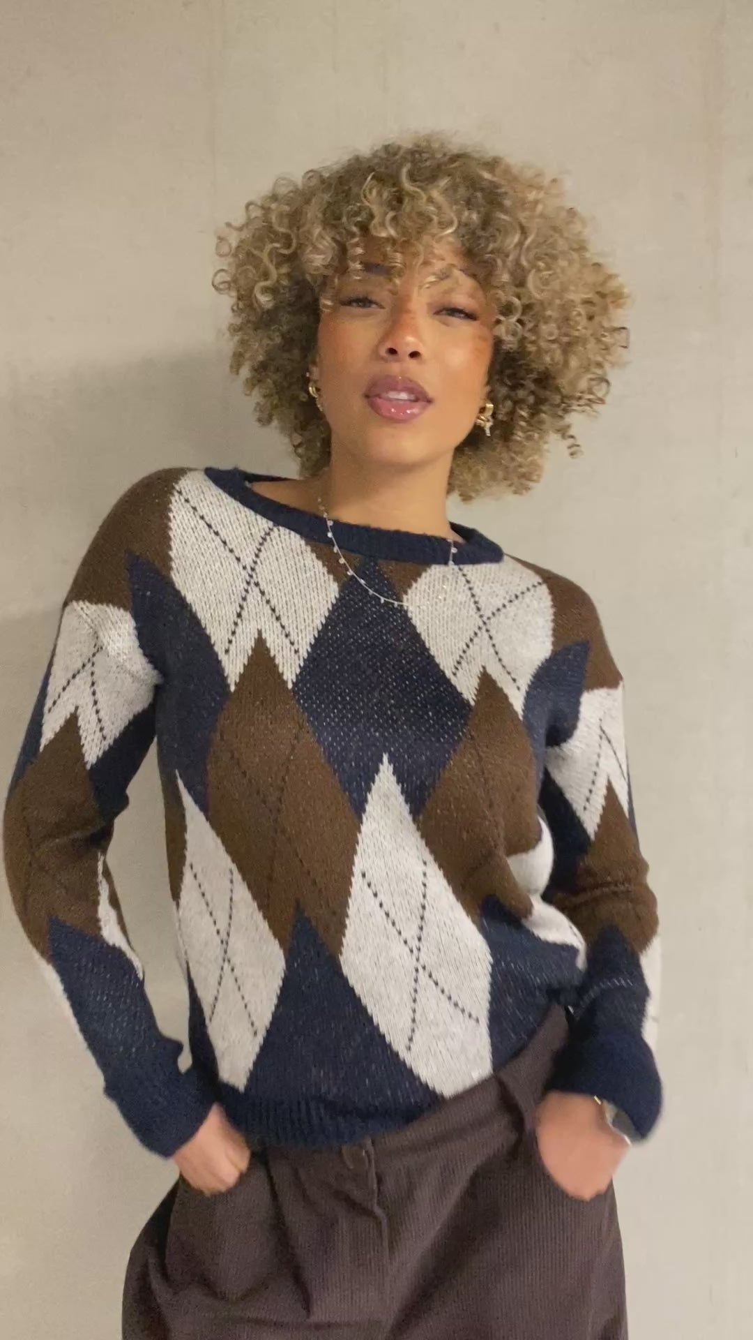 Pull en lainage col rond, manches longues à motifs Jacquard dans les tons de beige, bleu et brun