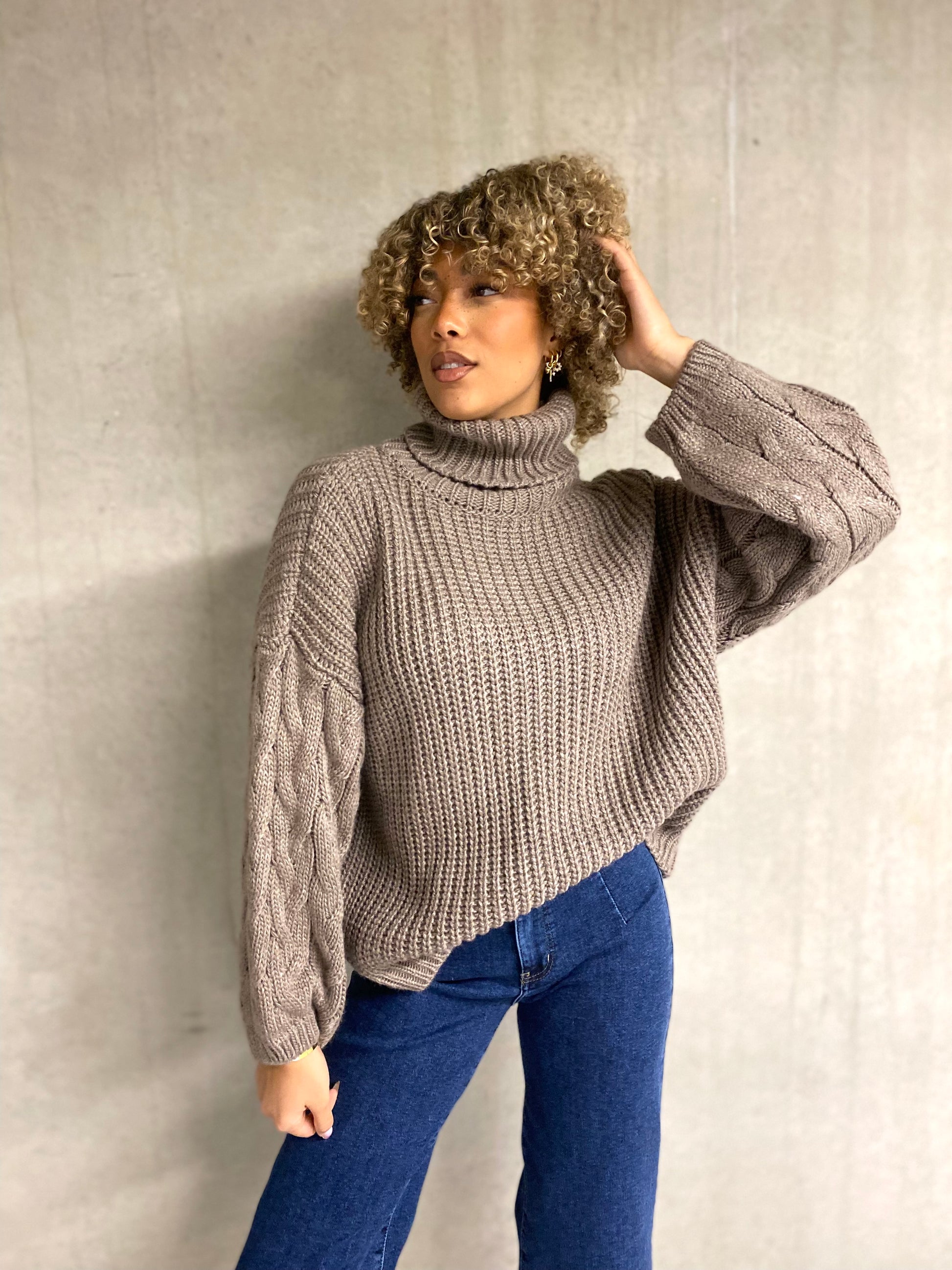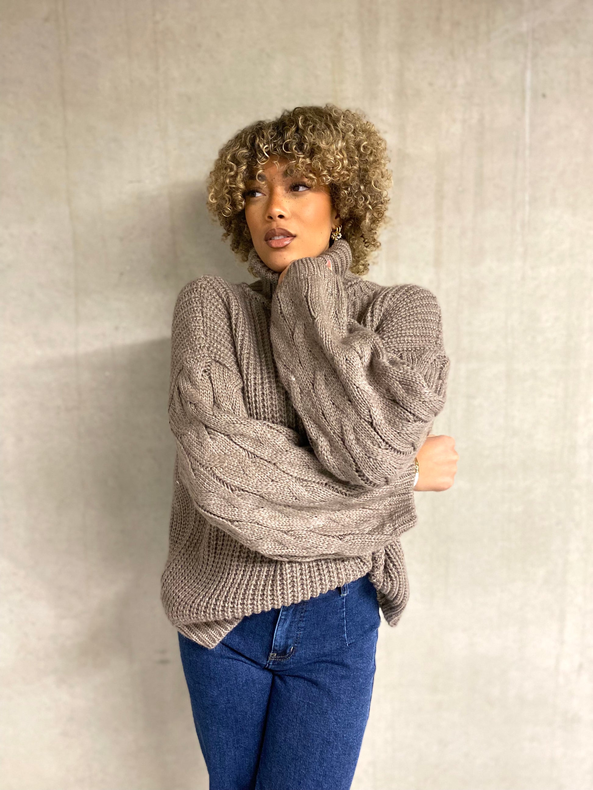 Pull oversize brun taupe, une pièce douce et chaleureuse conçue pour vous accompagner tout l’automne-hiver.