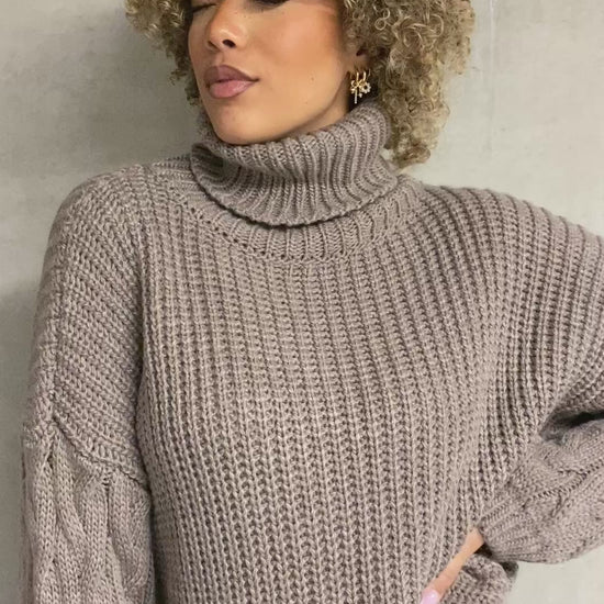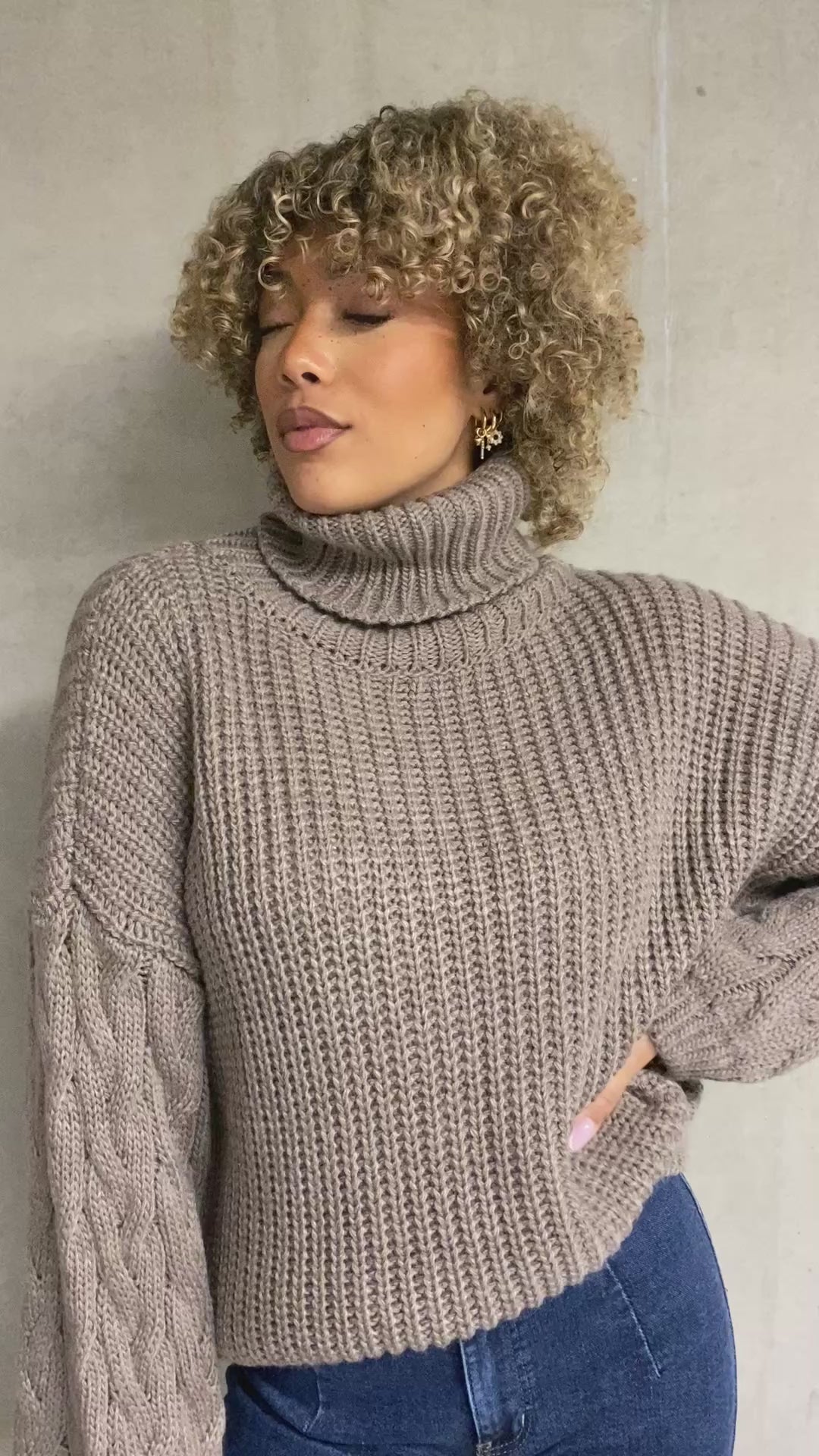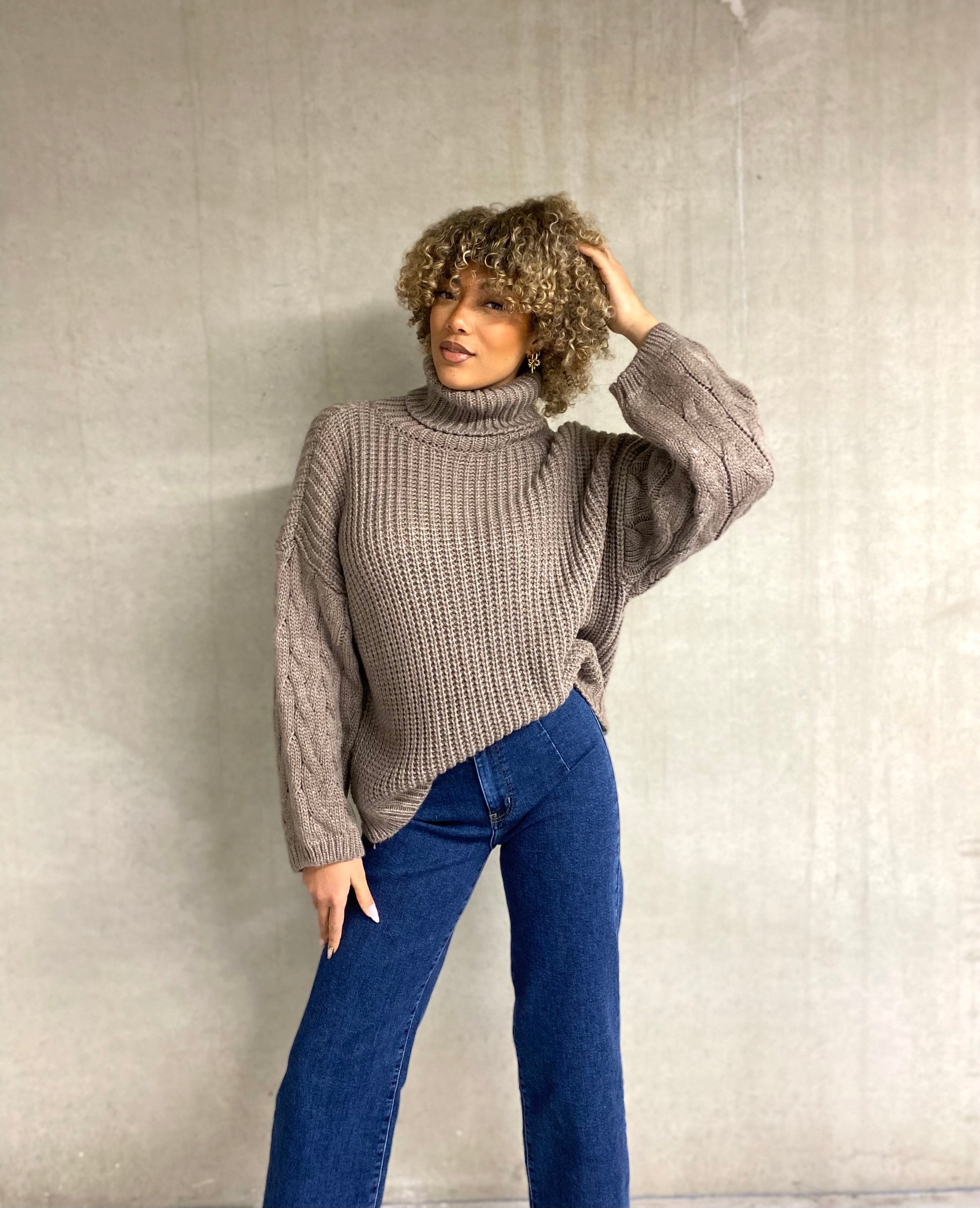 Son gros col roulé enveloppant apporte un confort irrésistible, tandis que ses manches torsadées offrent une touche d’originalité qui fait toute la différence.