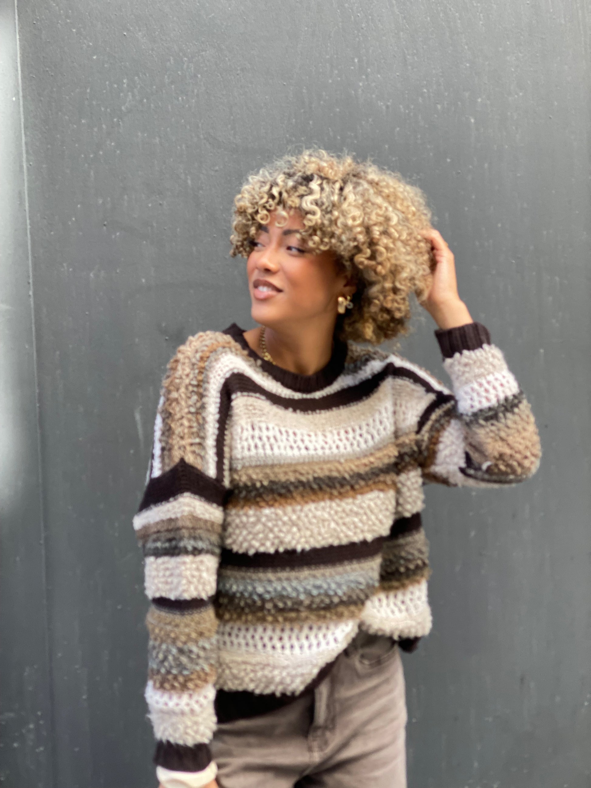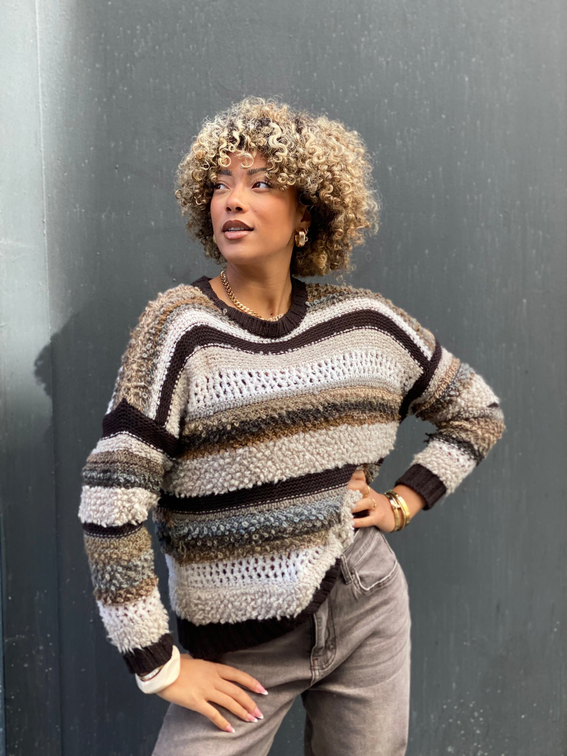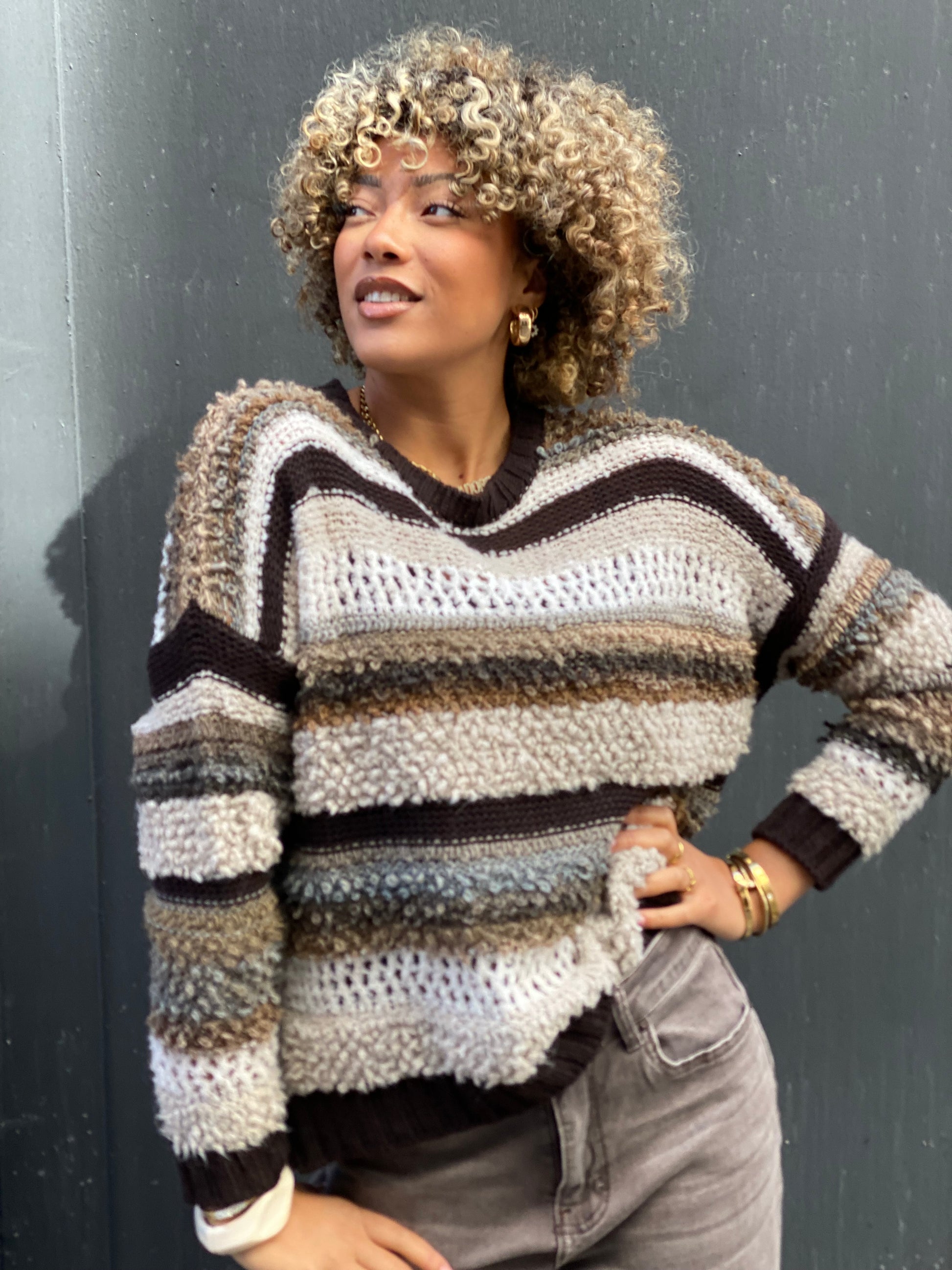 Magnifique, pull en lainage de différents tons de brun, taupe, matière lainage, bouclettes