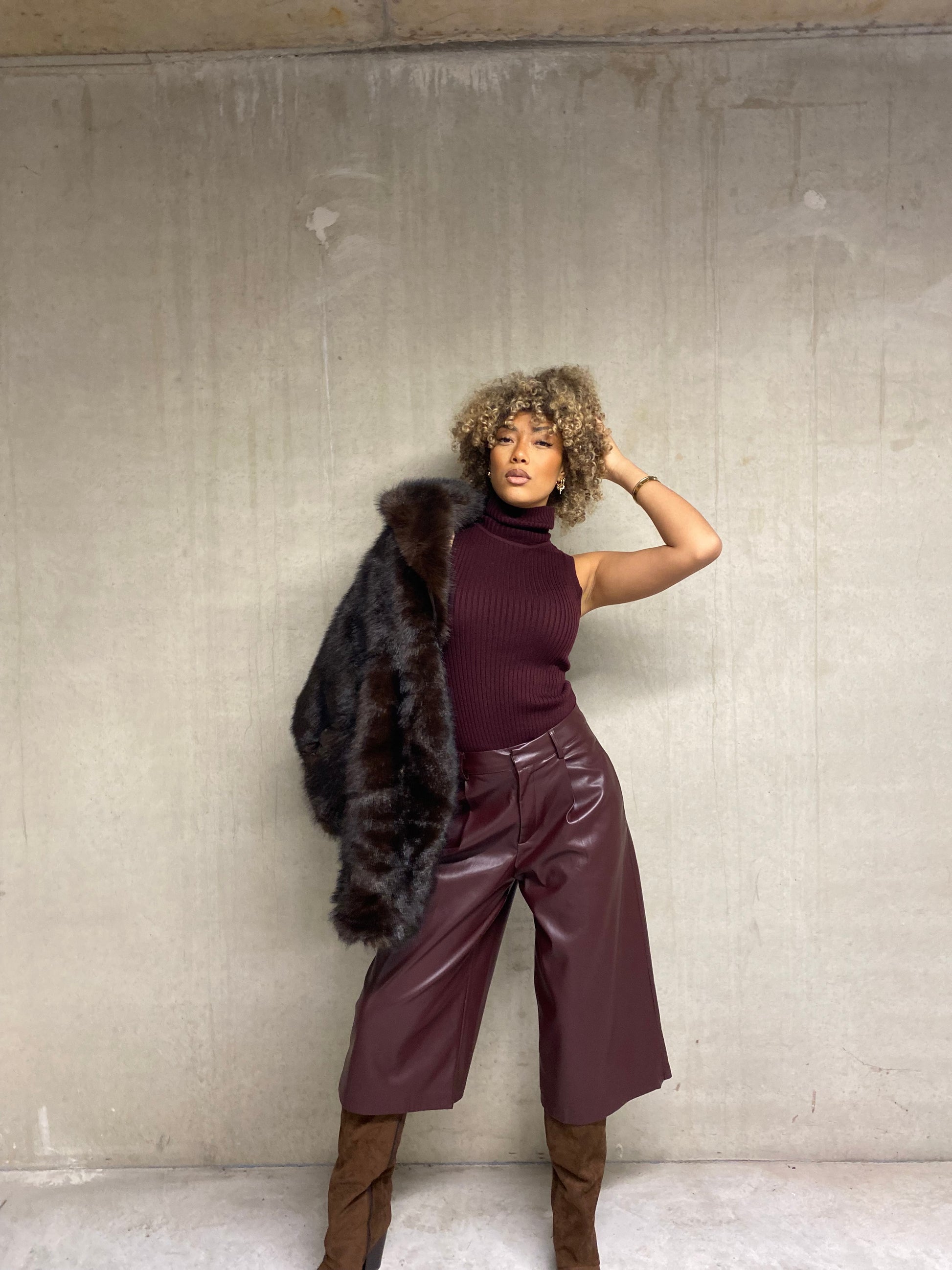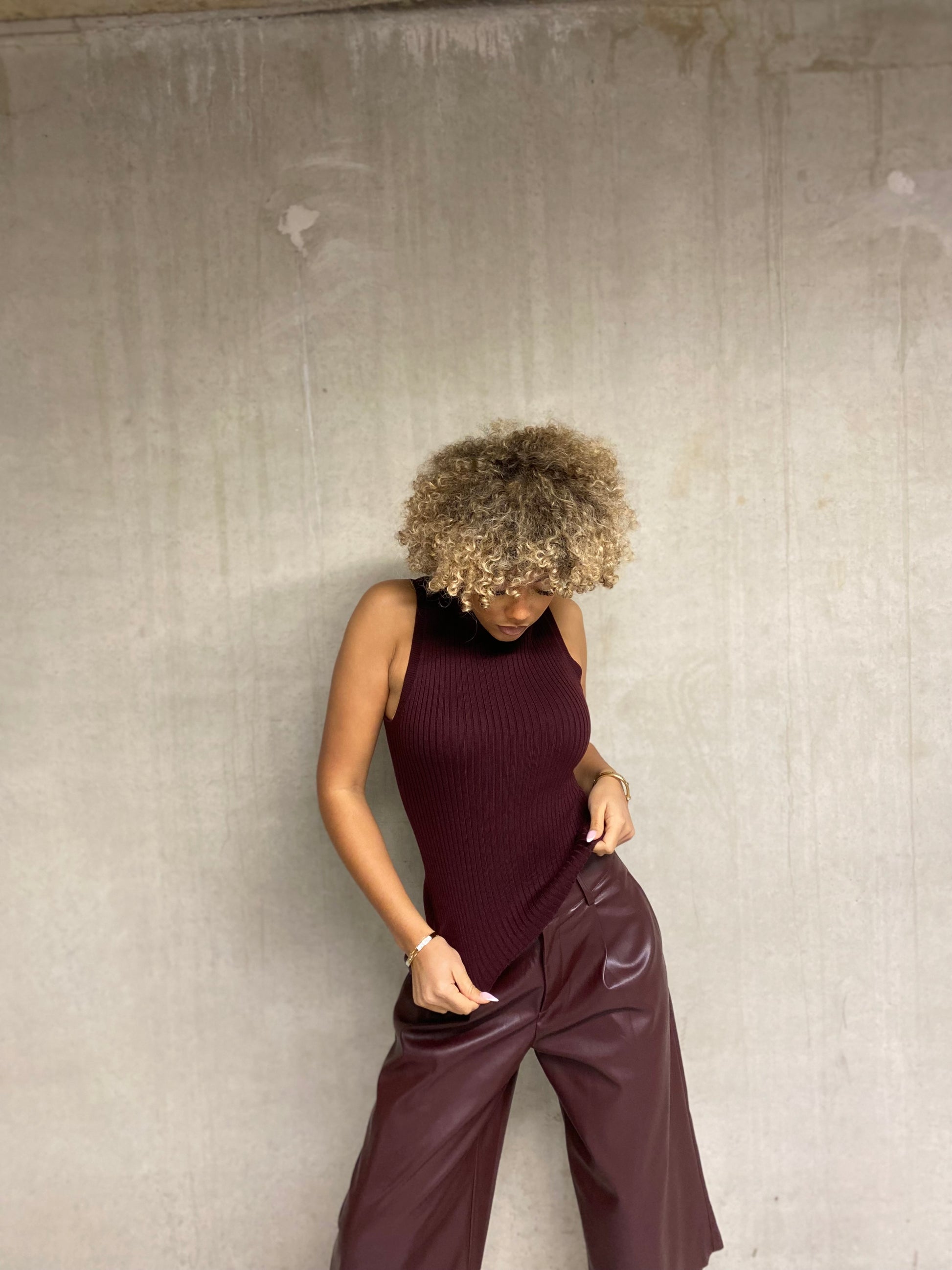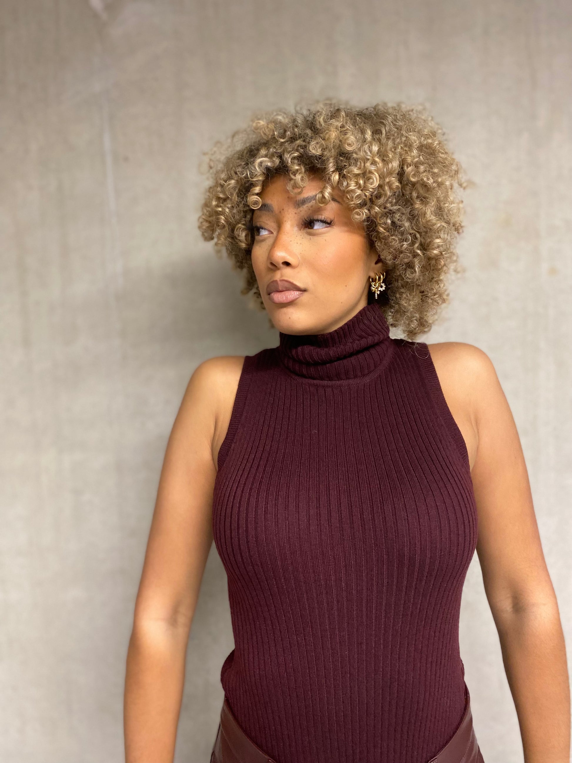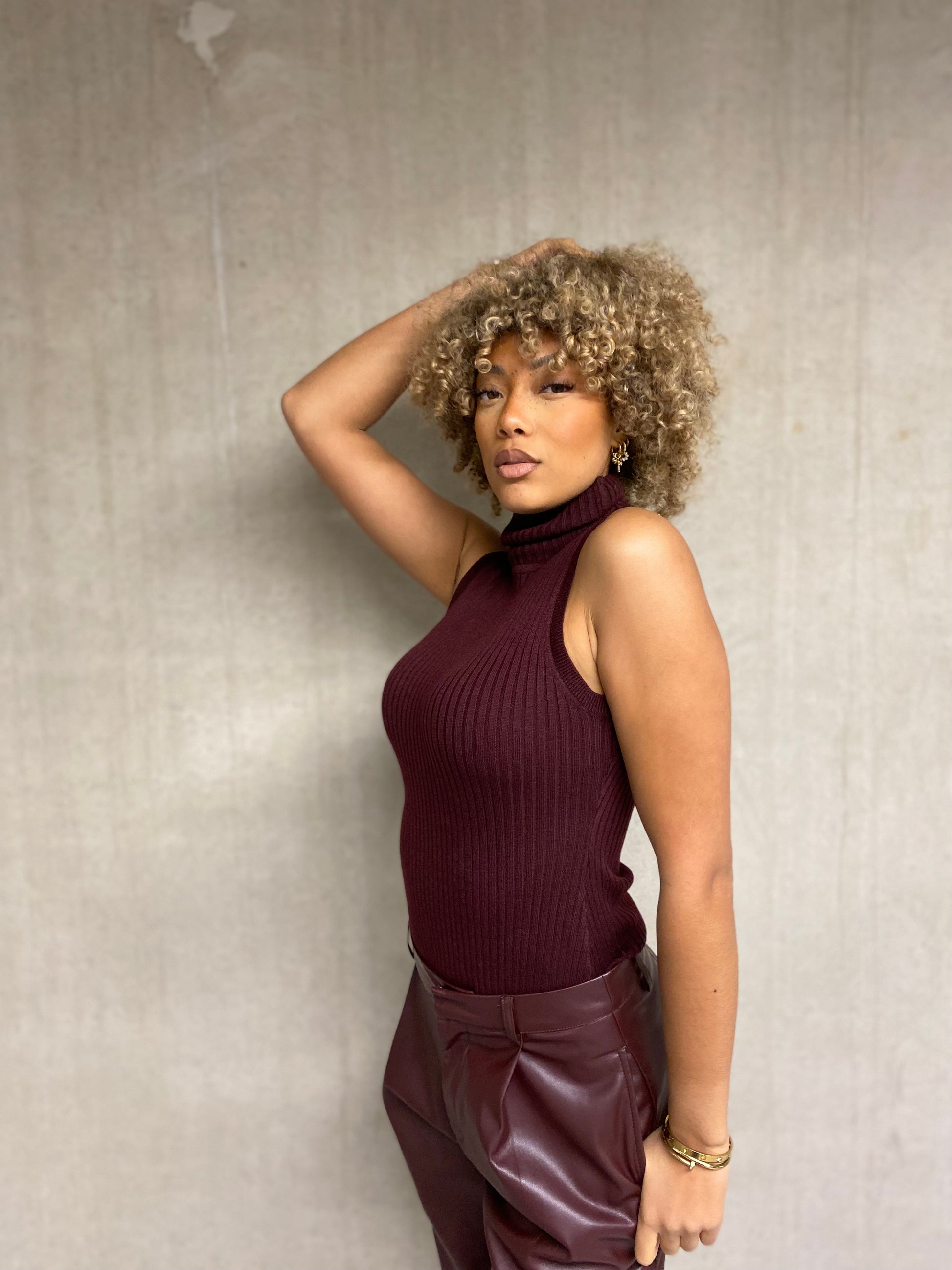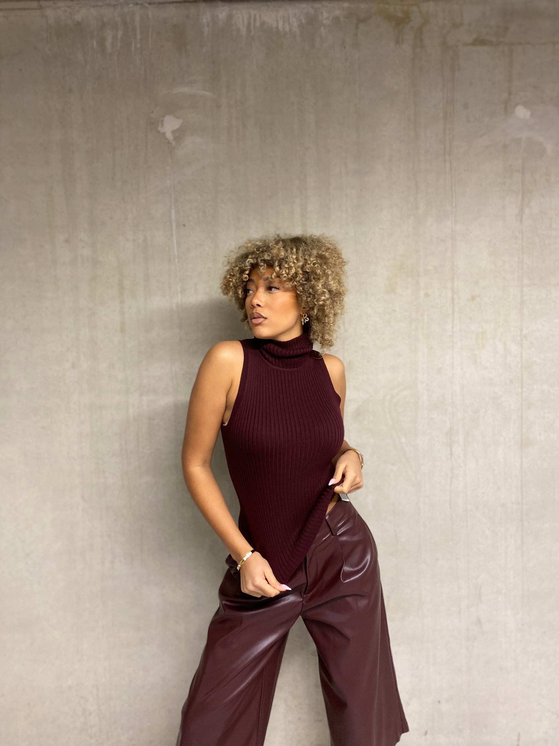 Petit pull côtelé, sans manches, avec un joli col roulé. Tout doux, très agréable à porter et parfait pour superposer. Sa couleur bordeaux apporte une touche chic et chaleureuse.