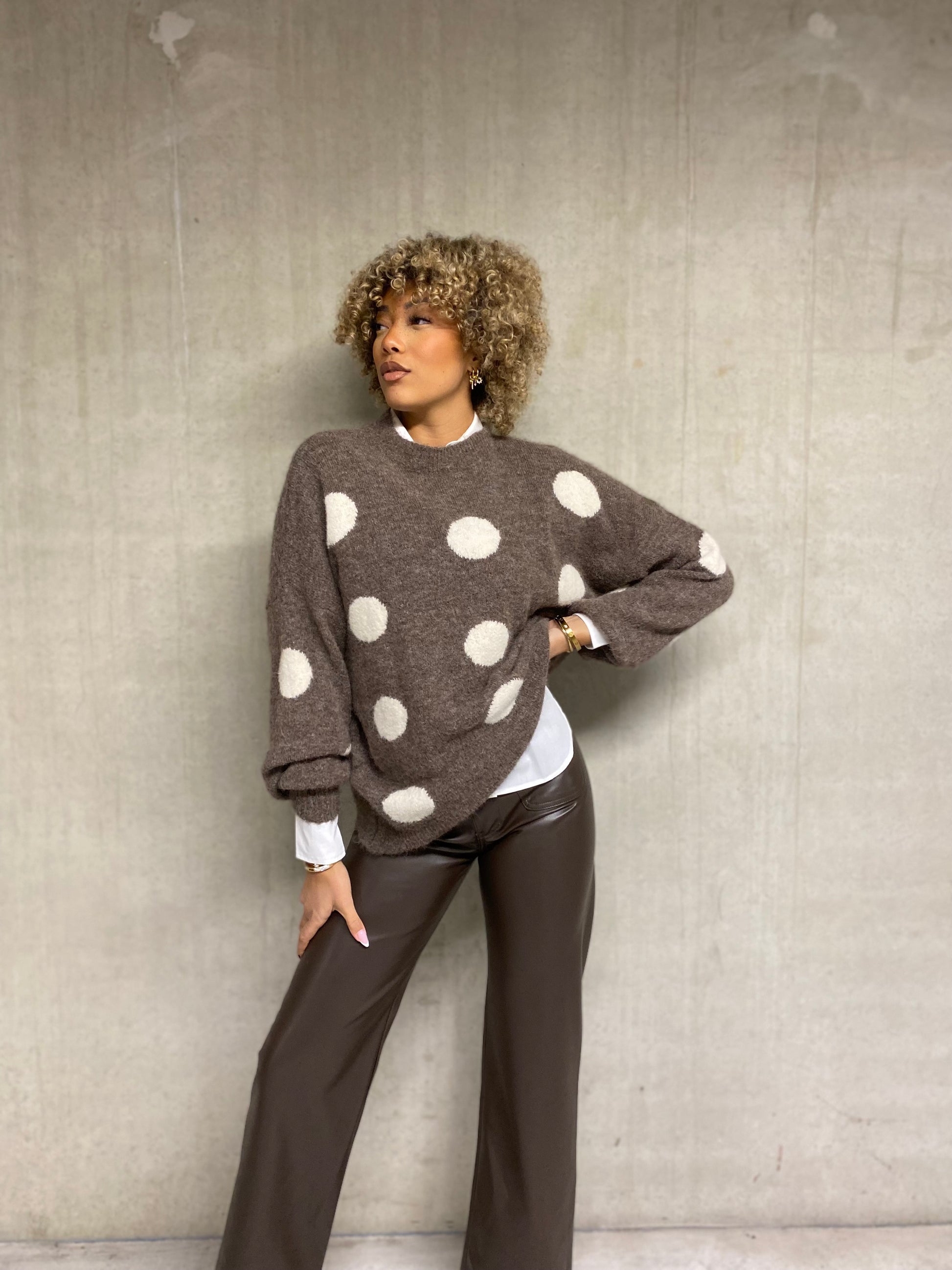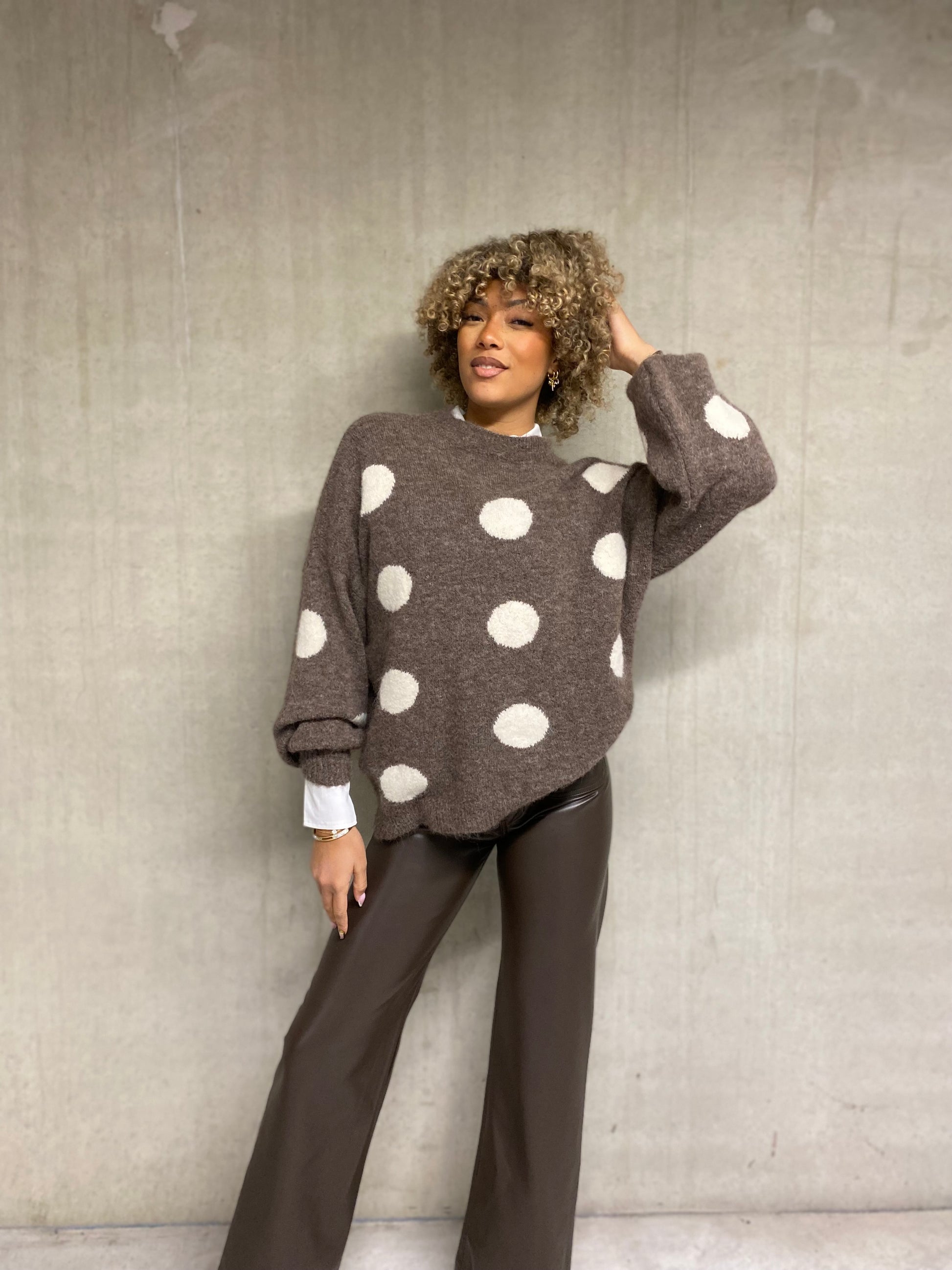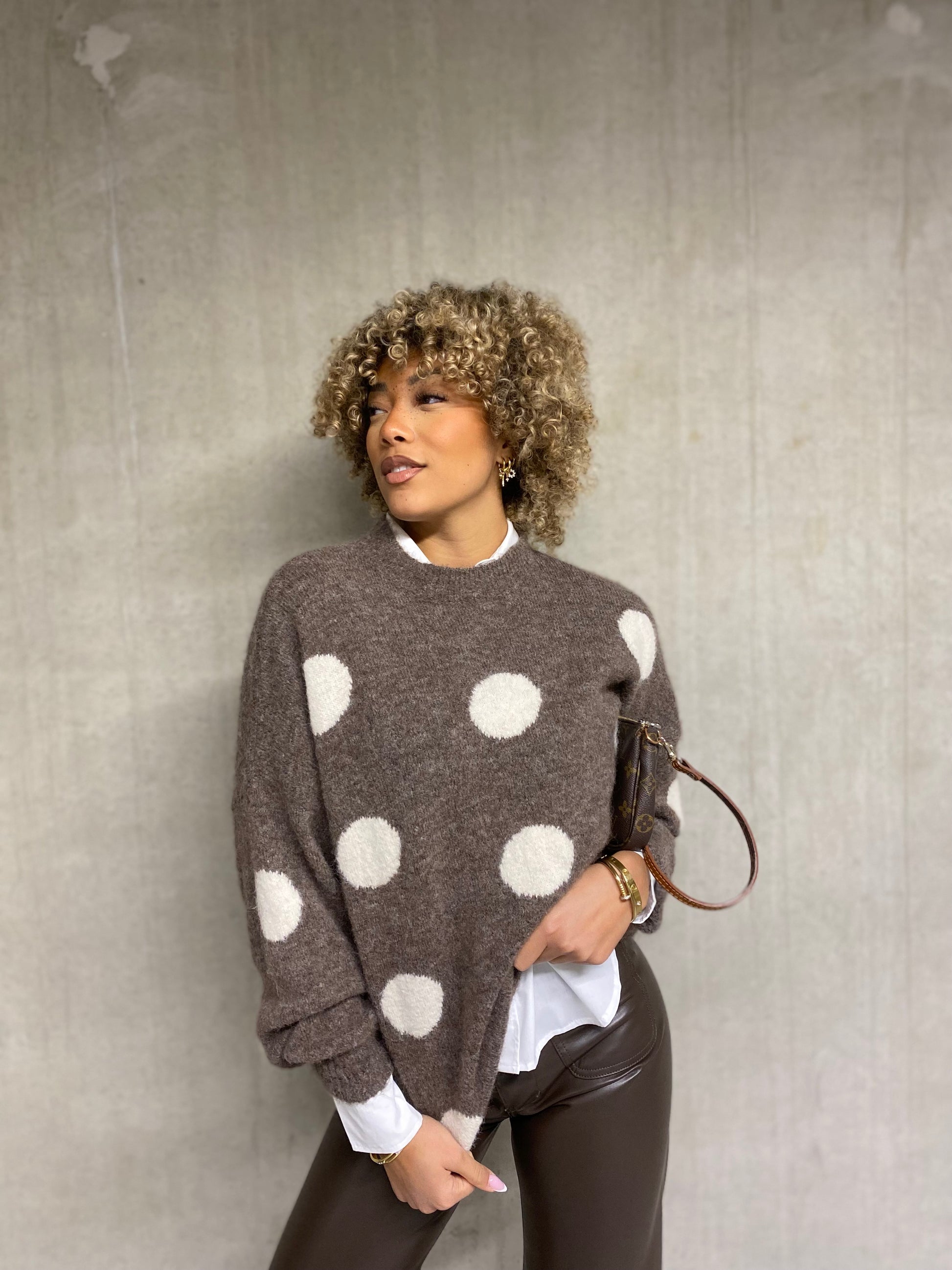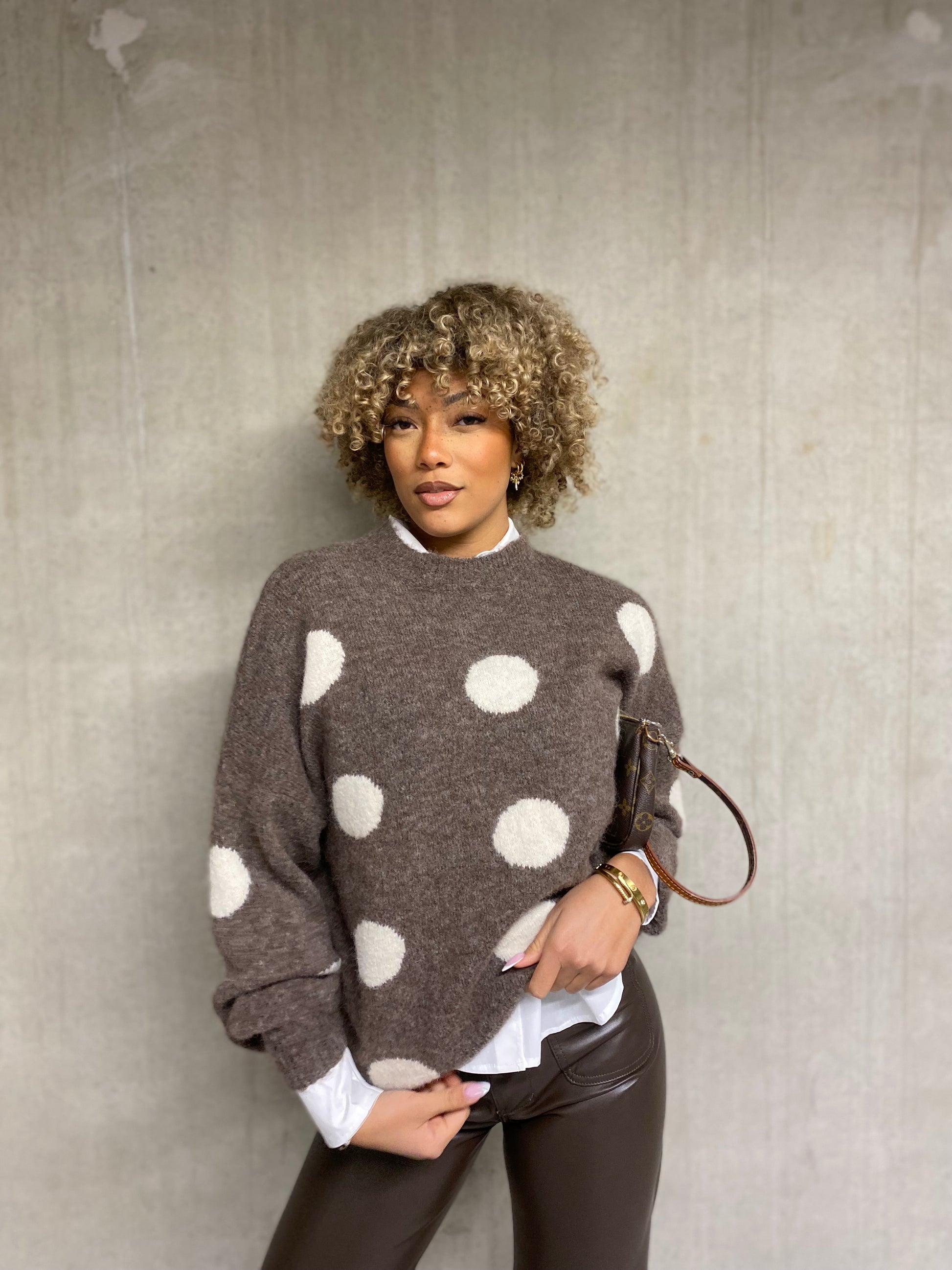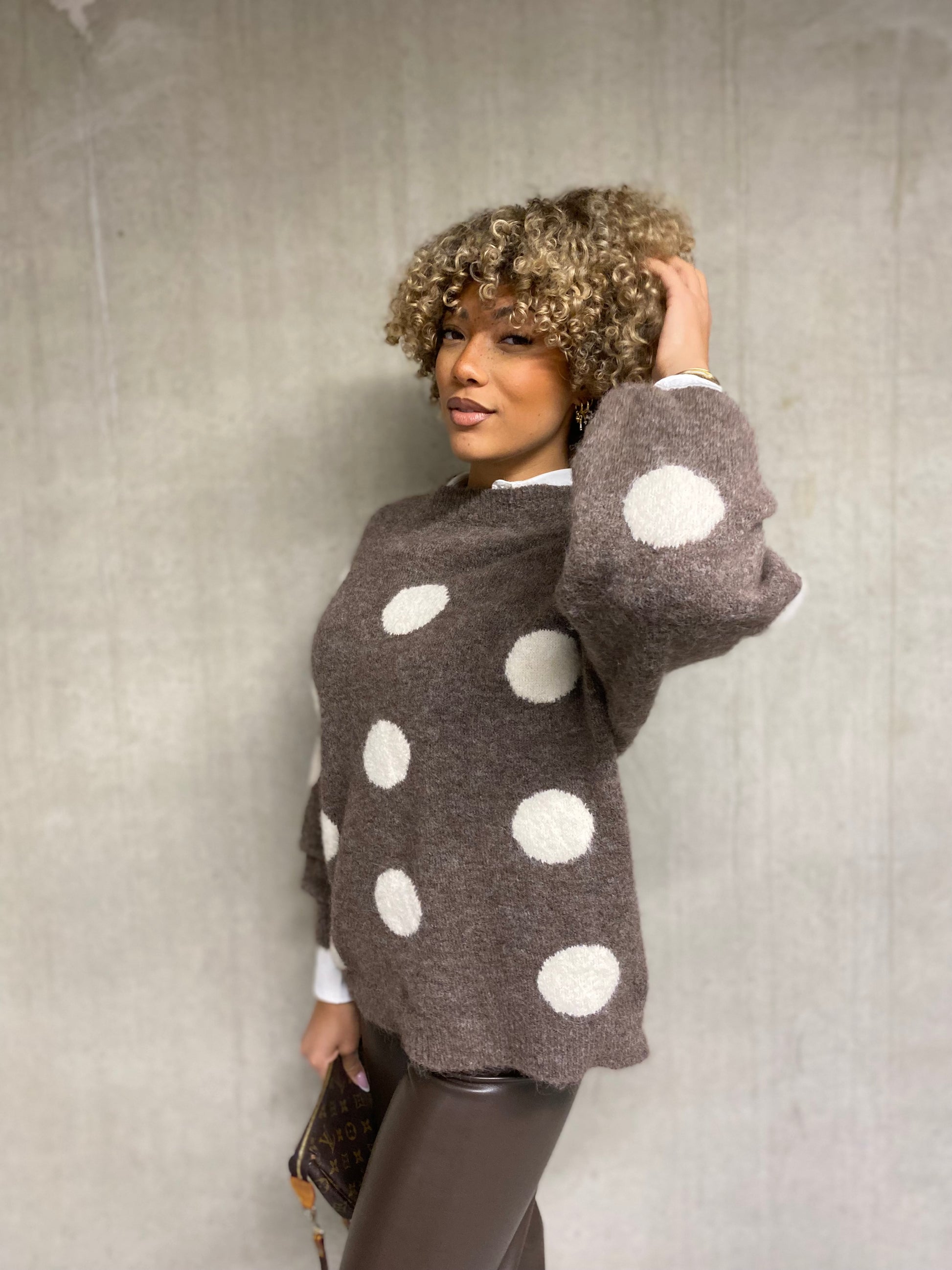 Craquez pour ce pull en laine taupe à gros pois beige, une pièce aussi douce que mignonne.