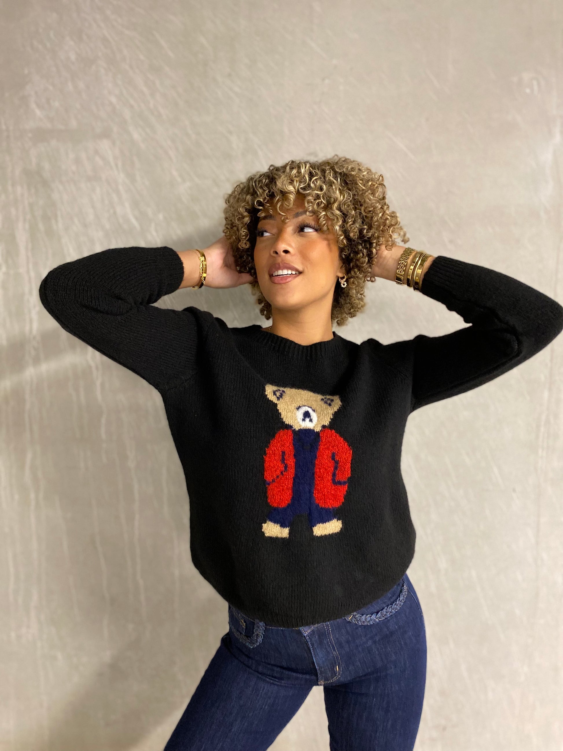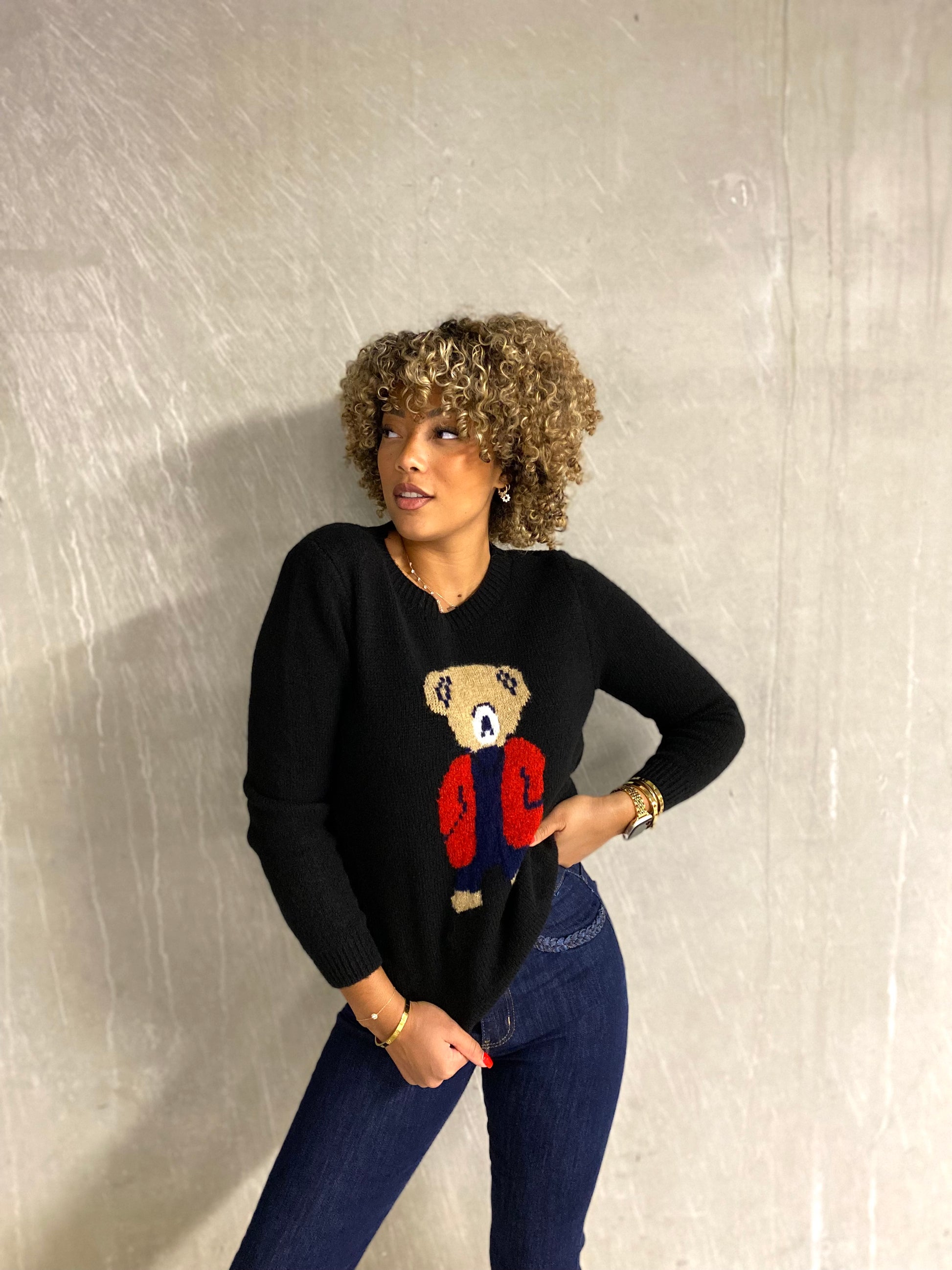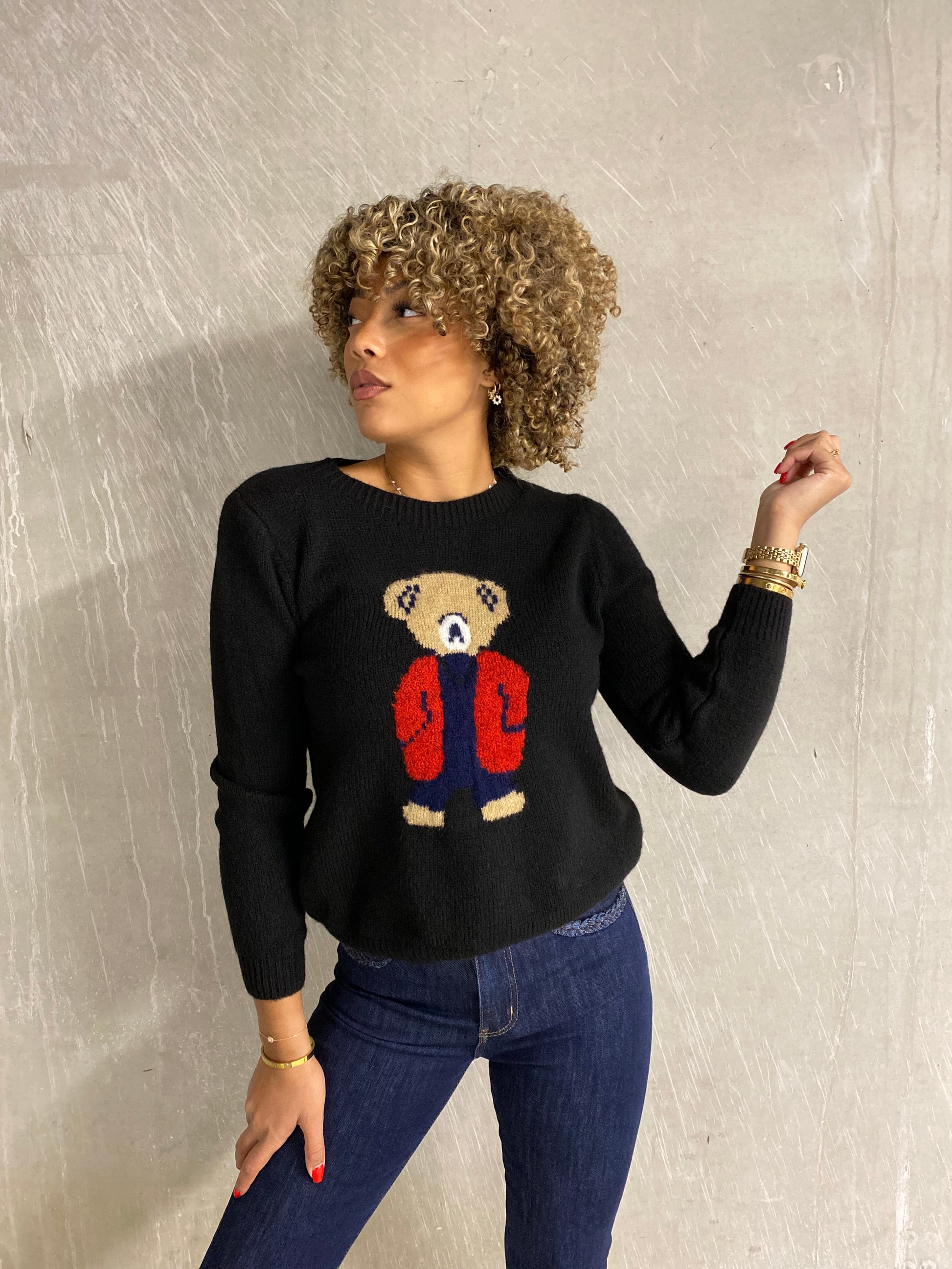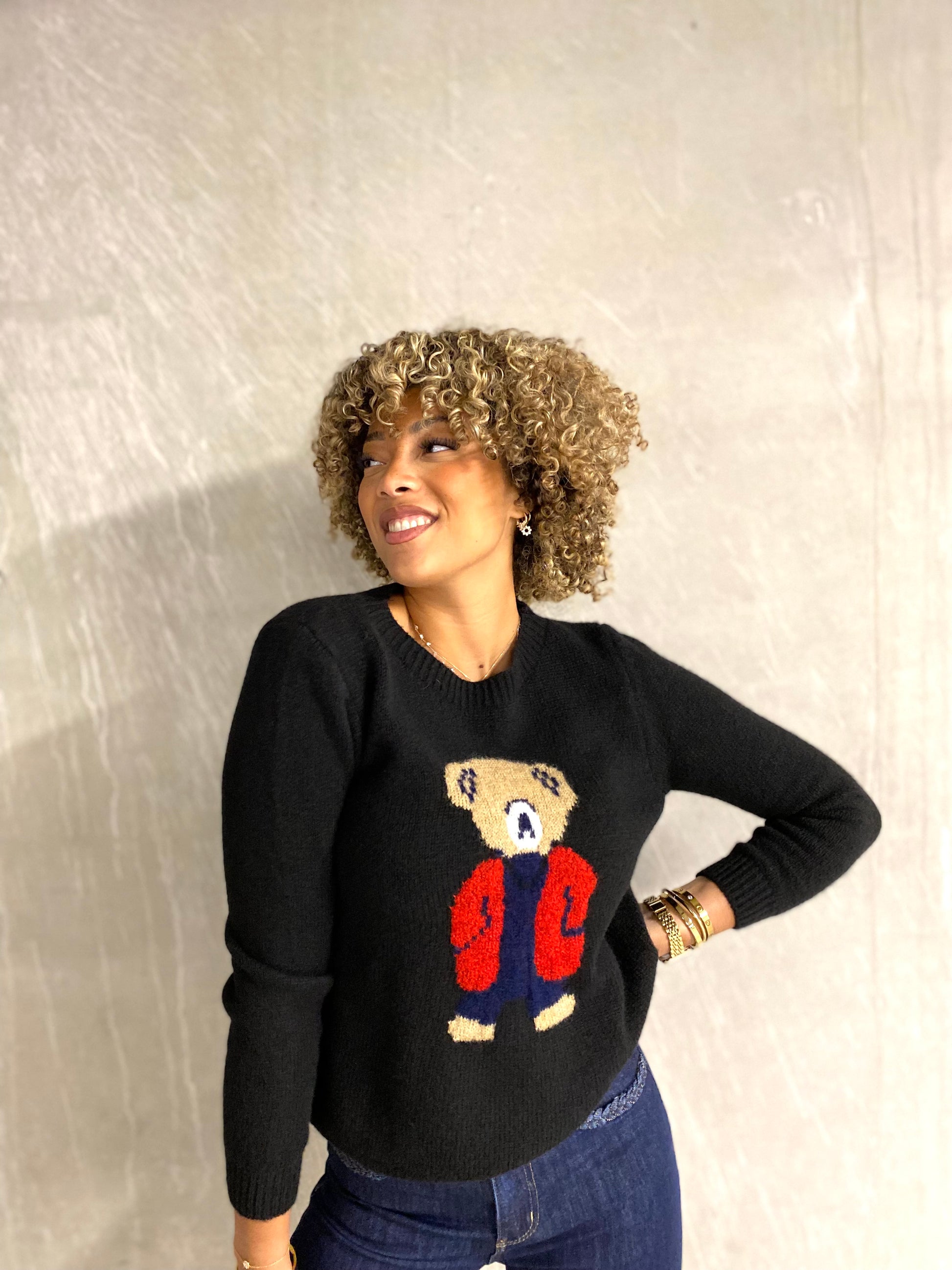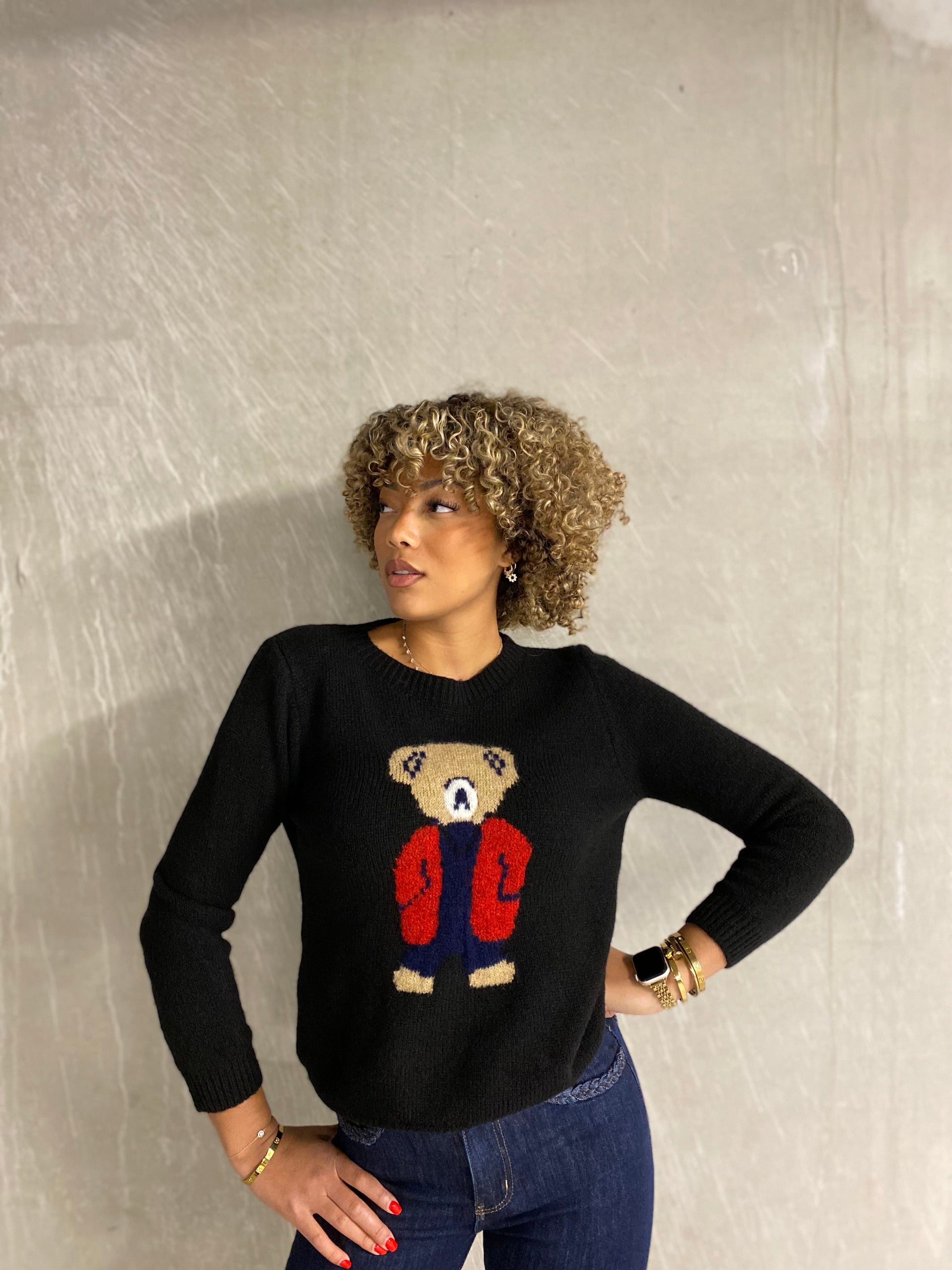 Pull près du corps, coupe droite, col rond manches longues noir avec une broderie imprimée ourson
