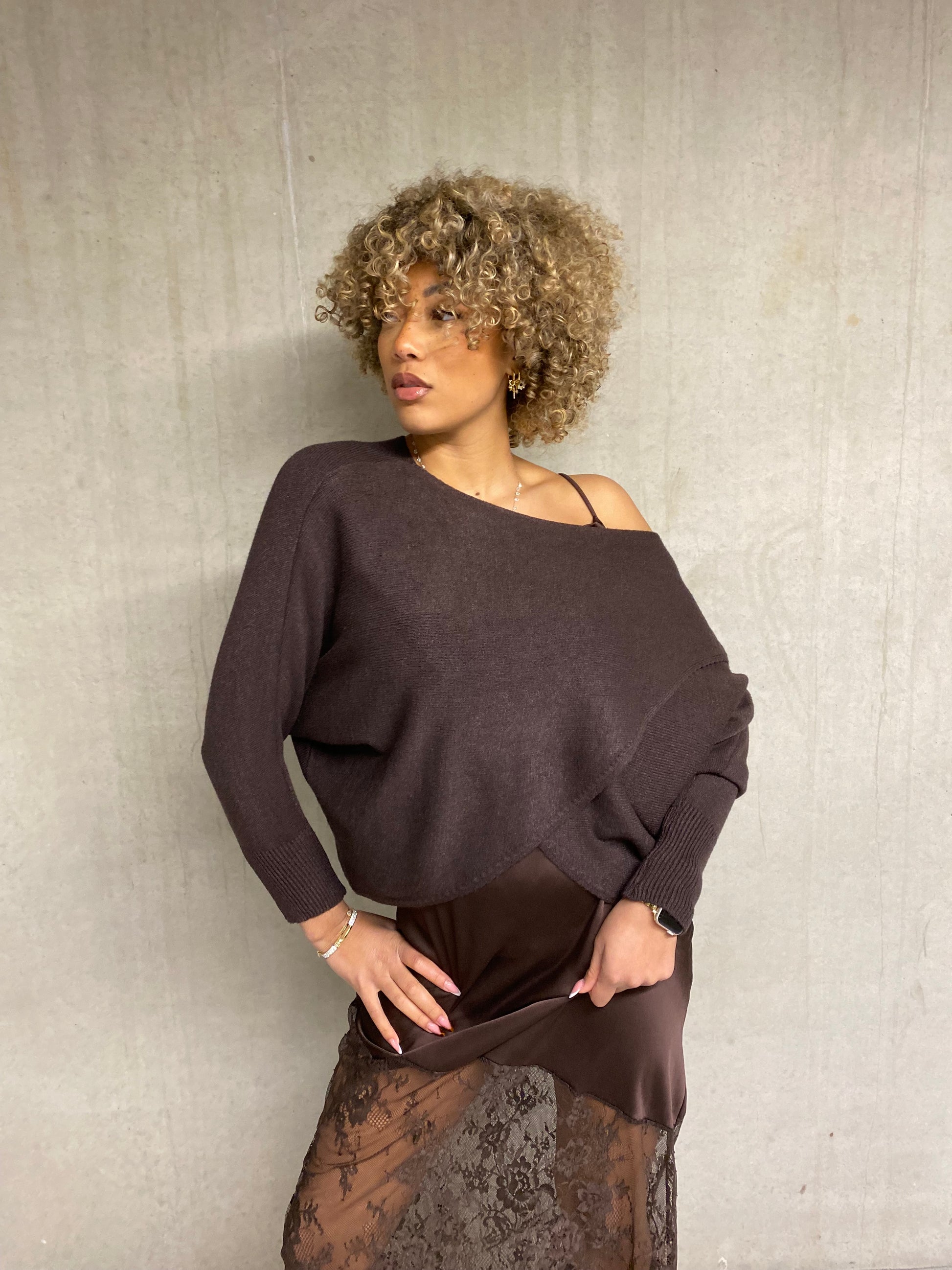 Pull brun, à manches, chauve-souris, souligné d'une découpe en biais sur le devant. Parfait, porter avec un chemisier ou sur une robe ou avec un top en dentelle pour un style chic et moderne, et tout confort , doux est bien chaud