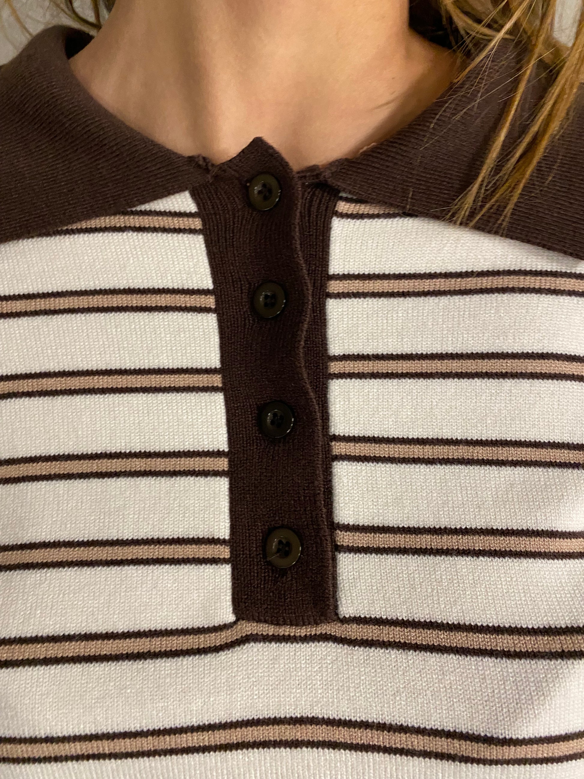 Couleur beige avec des lignes bras et Camel. Le col est en chocolat avec des boutons bruns.